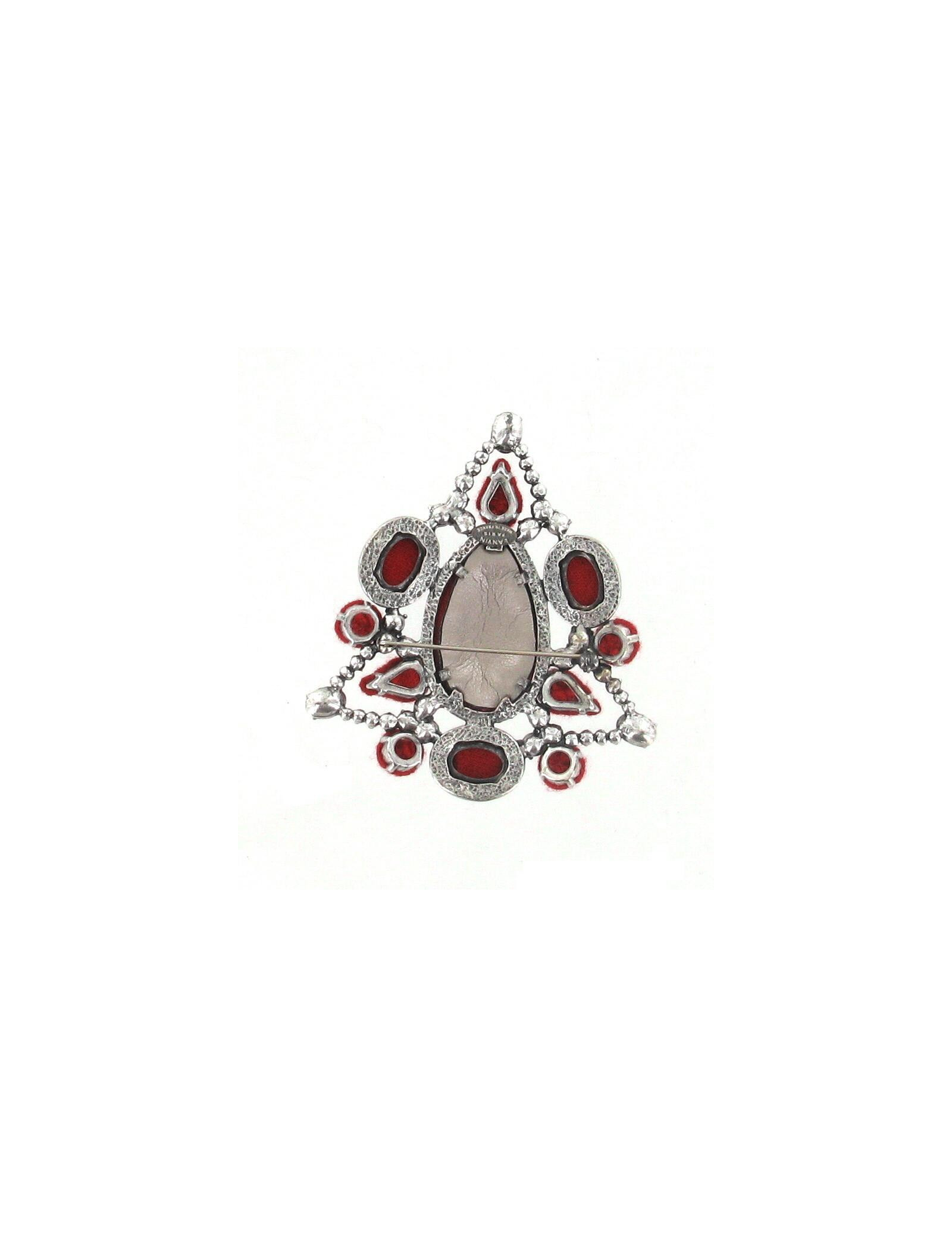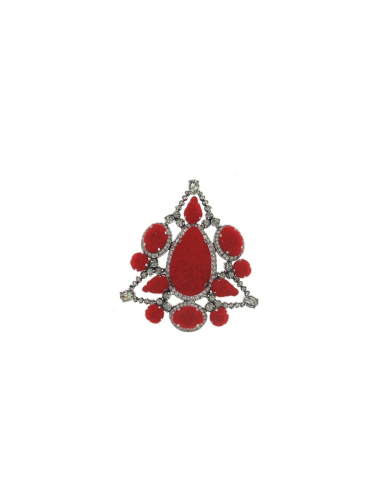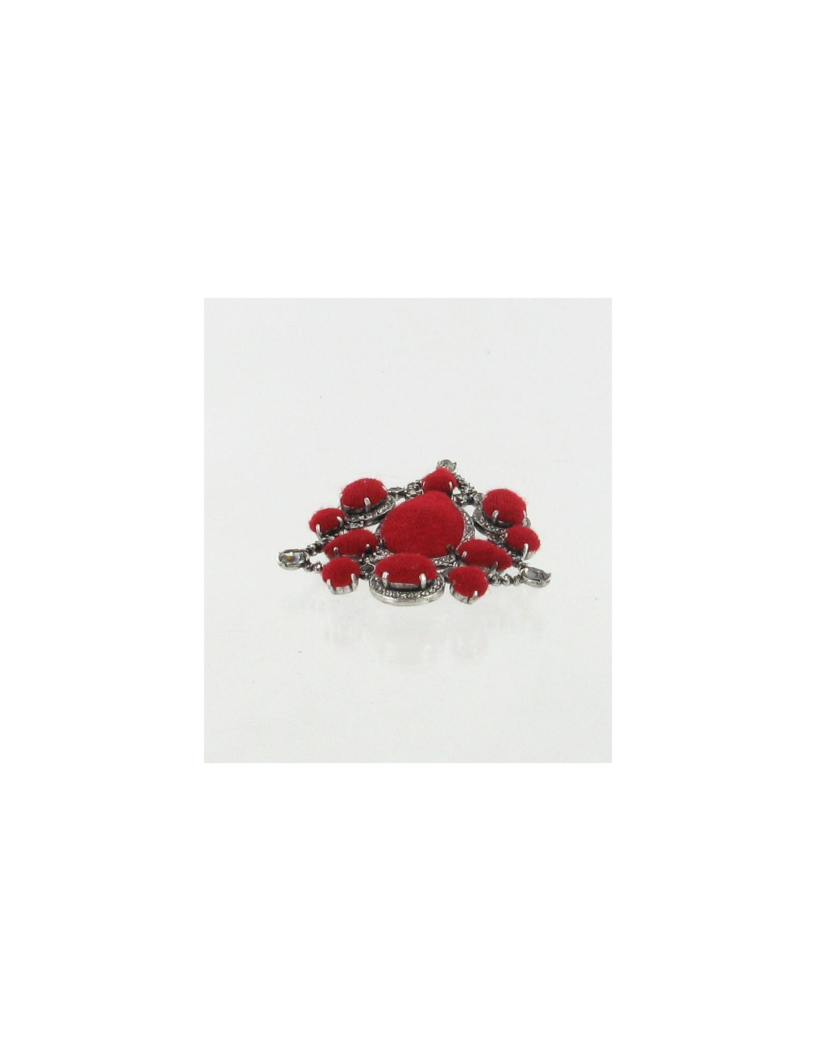Cette jolie broche bijou "POIRES" LANVIN en jersey grand modèle est sertie de jersey rouge et de strass. Au dos, sur une plaque en métal argenté est gravée LANVIN. Livrée dans sa boîte d'origine et son pochon.