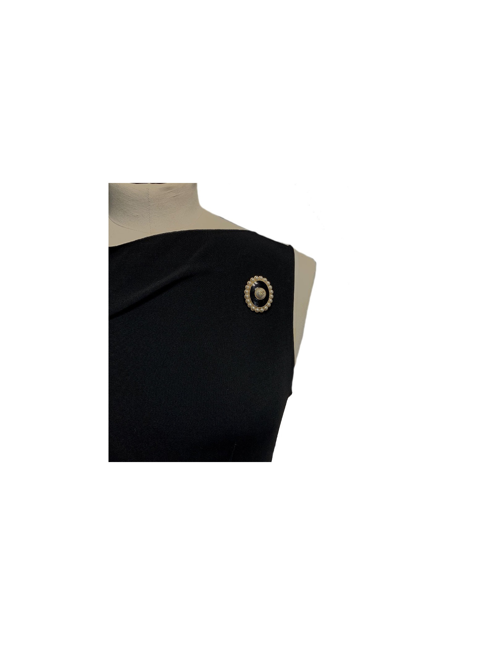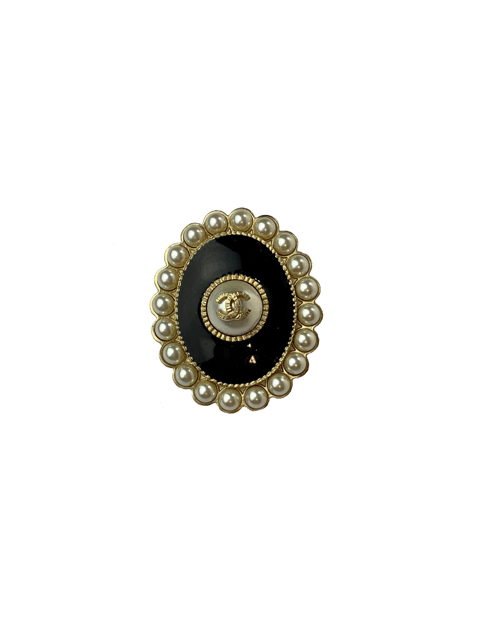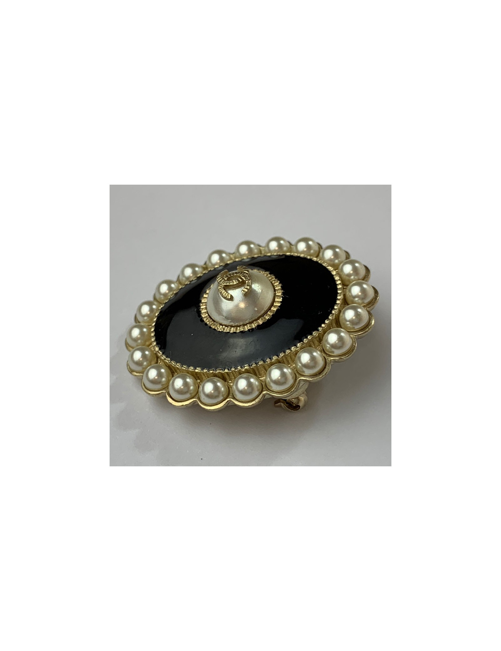 Détails : broche Chanel issue de la collection croisière Paris Cuba 2017. Elle est ovale, en résine noire, métal doré à l'or fin et est sertie sur tout son tour de perles nacrées. Elle porte en son centre une perle nacrée sur laquelle se trouve un CC doré