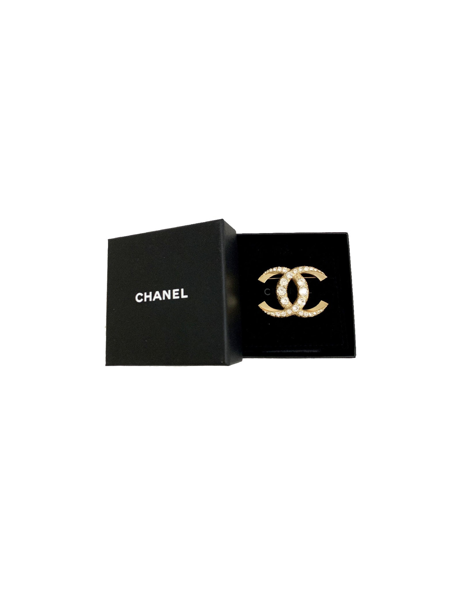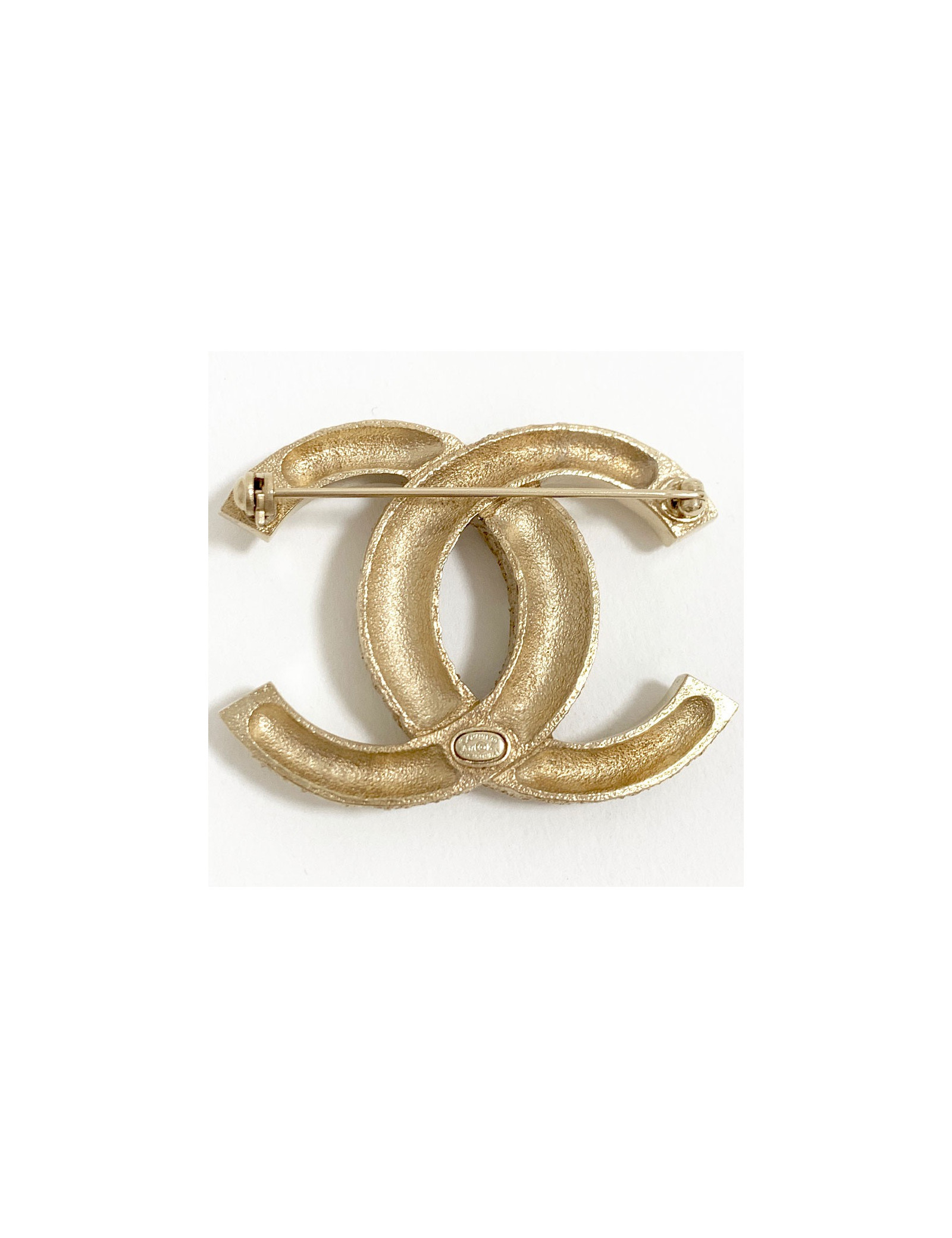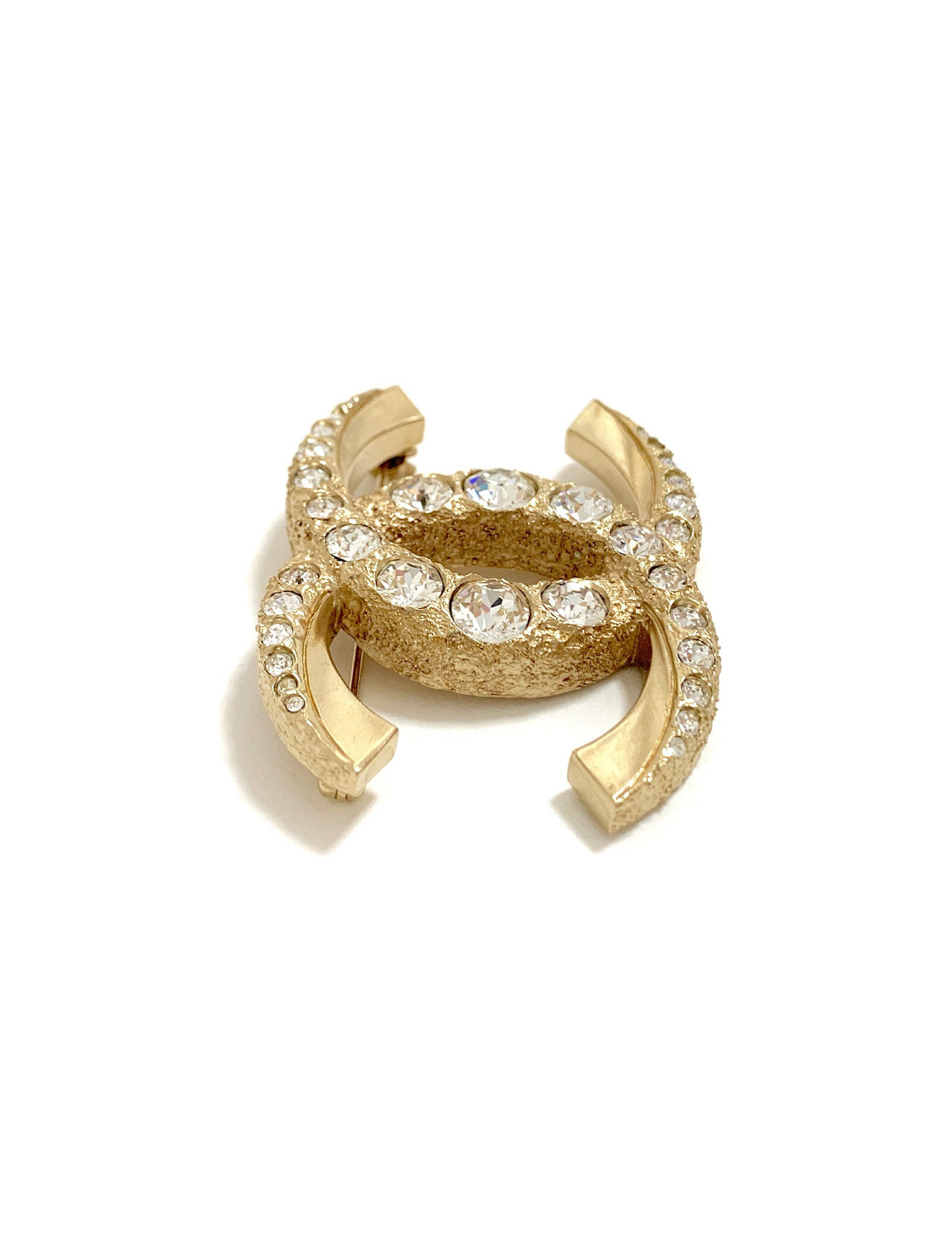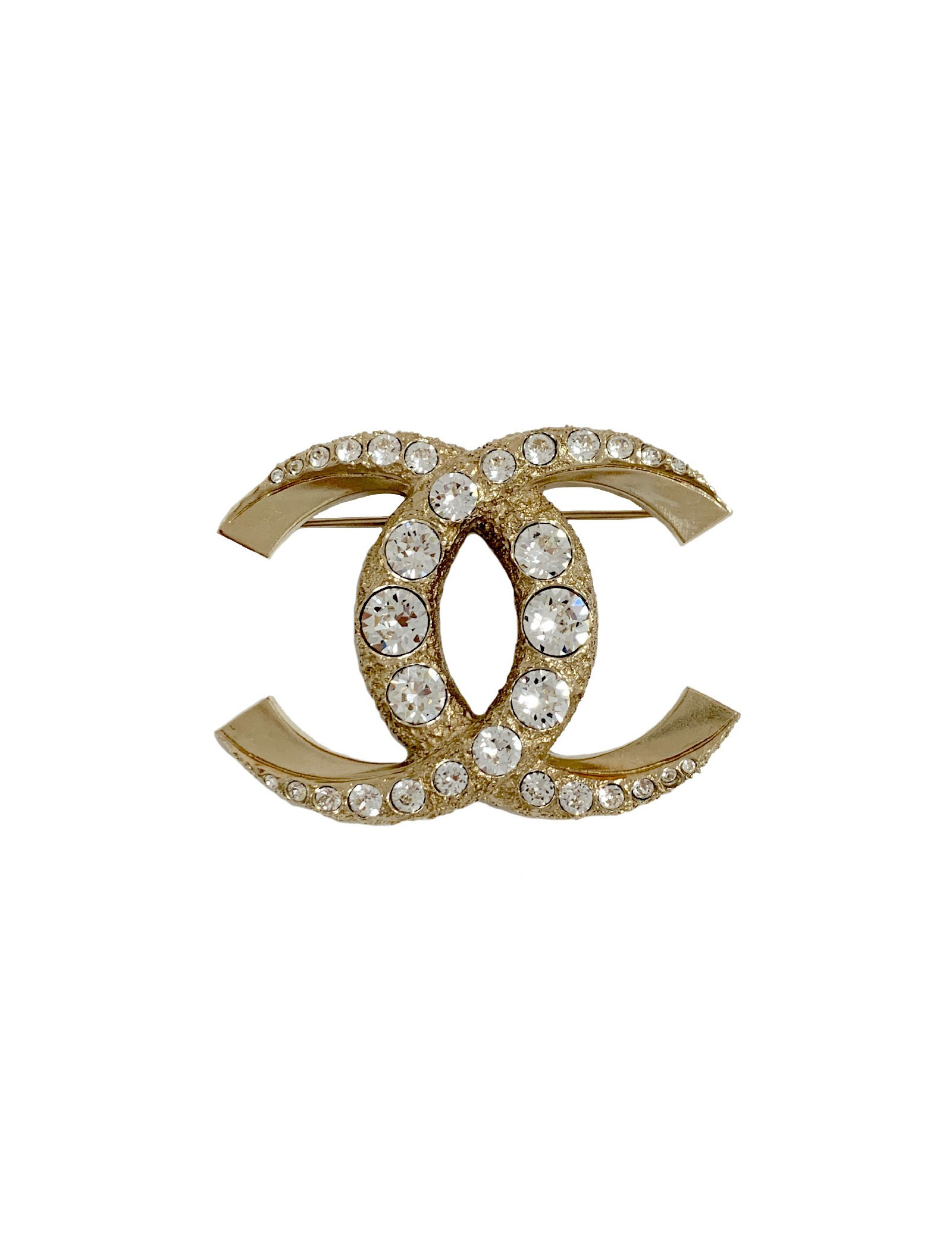 Très belle broche luxe de la maison CHANEL en métal et strass. CC en métal doré façonné de 2 manières (lisse et travaillé) serti de strass blanc de différentes tailles.