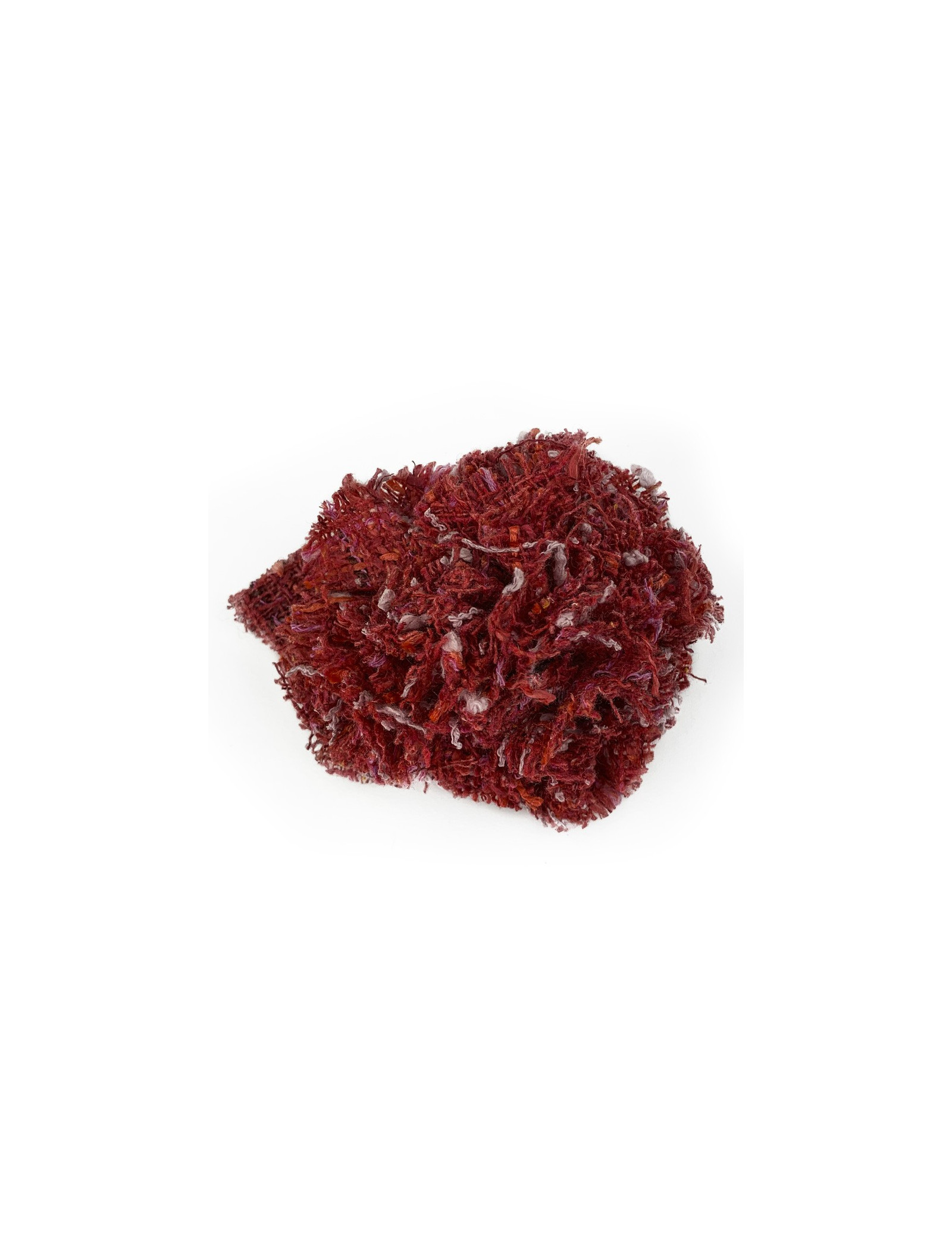 La broche est de la Maison CHANEL. Elle représente un camélia en tweed rouge, orange, rose.