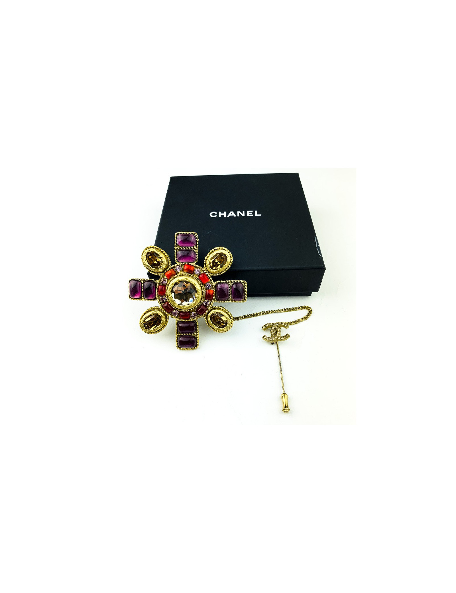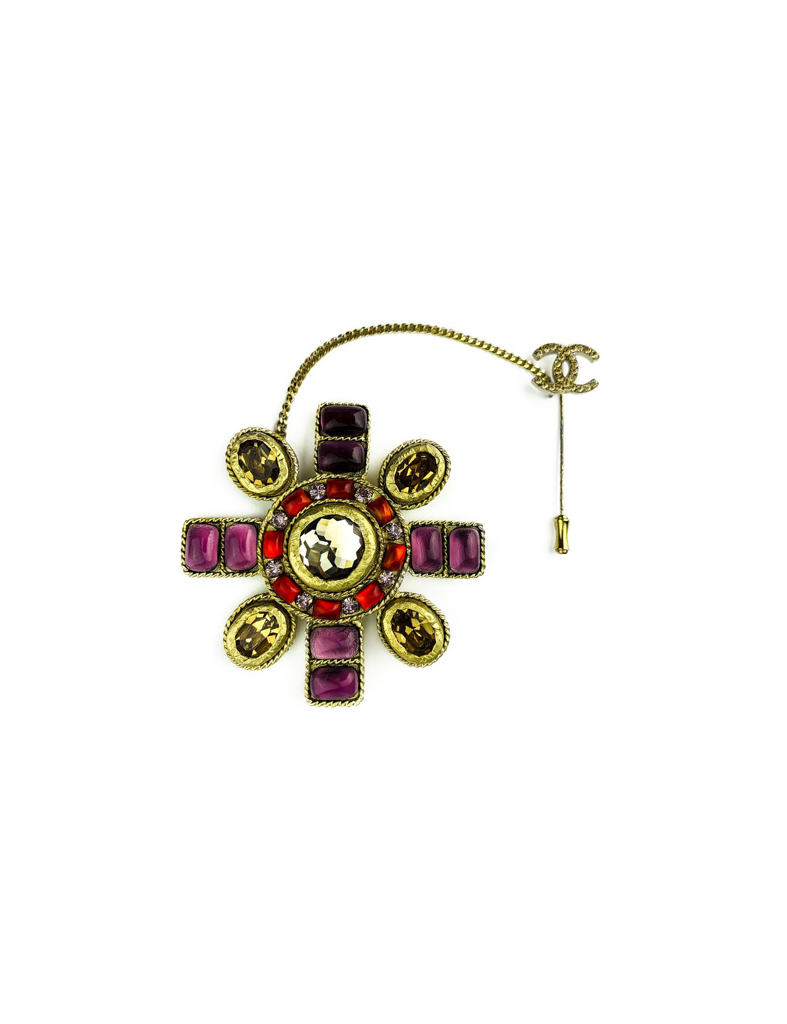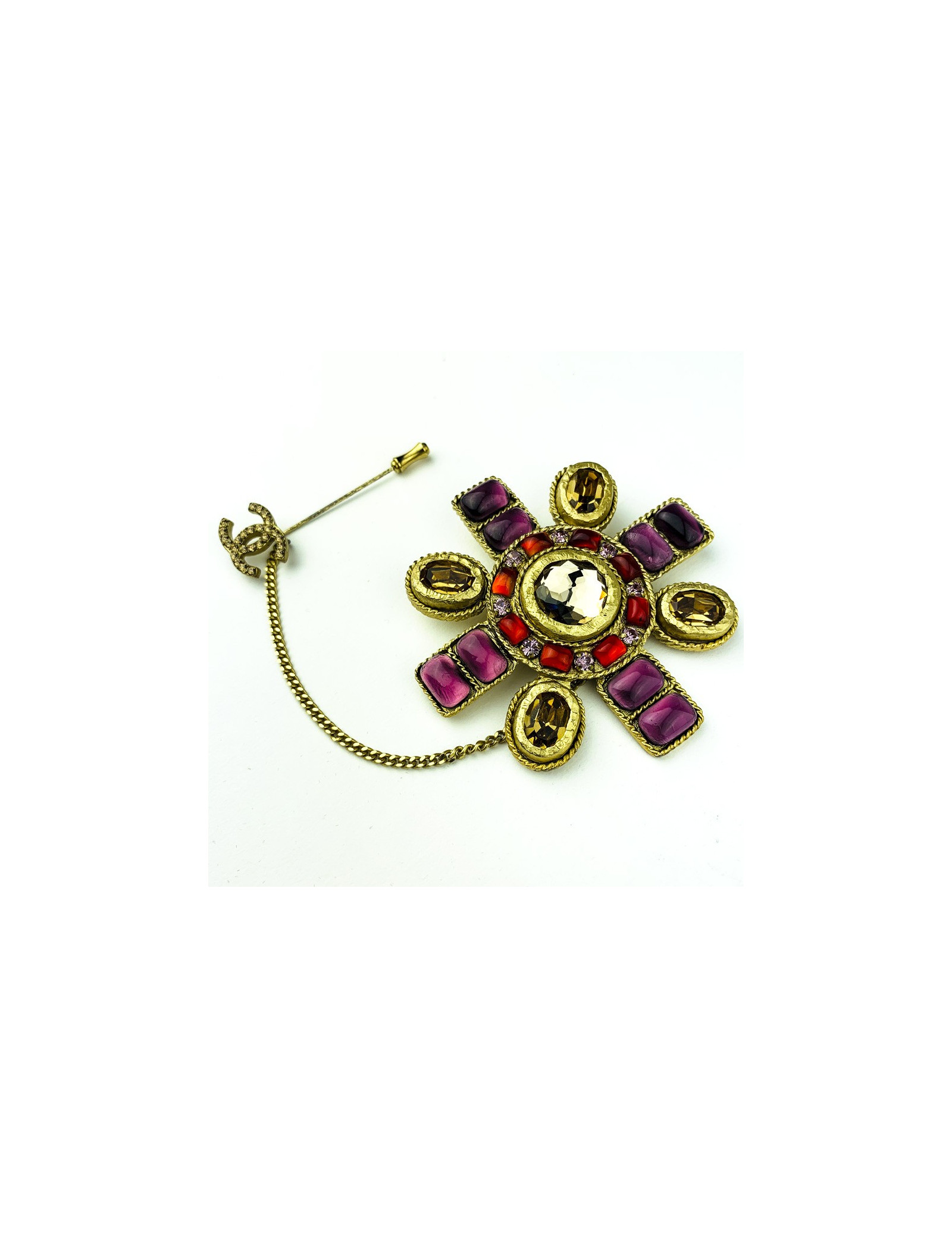 La chatelaine est signée Chanel. Elle représente une croix à huit arêtes. Elle est ronde avec en son centre un gros strass brun foncé entouré d'une succession de petits segments de résine rouge. Quatre de ses arêtes sont serties de petits rectangles en résine violette, les quatre autres sont de forme ovale comportant chacune un strass brun foncé.