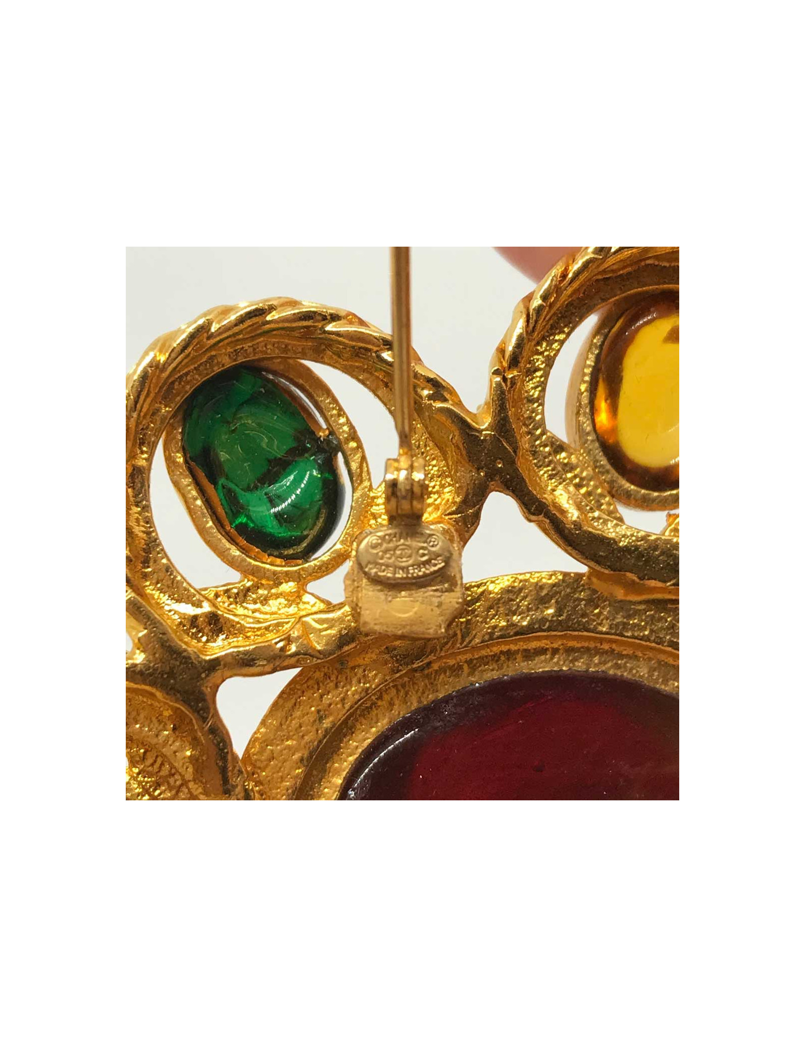 Nouveau Vendu BROCHES Broche Chanel vintage pâte de verre vert rouge CHANEL 41936 2 900,00 € Broche Chanel vintage Gripoix Condition : très bon étatPays de fabrication : FranceMatière : métal, pâte de verreCouleur : doré, rouge, vert émeraudeDimensions : 6 x 12 cmStamp : ouiAnnée : 1994Bijouterie : métal doréDétails : Pièce de collection, broche vintage avec logo CC au centre entouré de quatre pierres en pâte de verre rouge et verte. Pendant avec... Voir