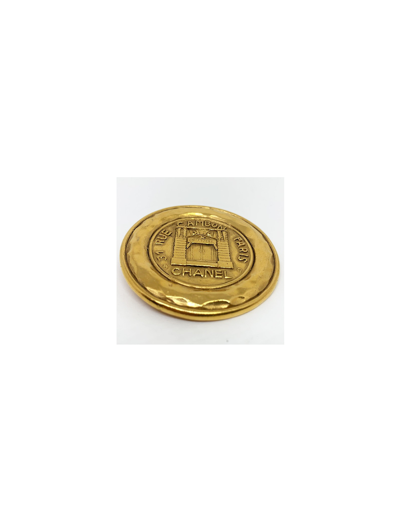 La broche est une pièce vintage de la Maison CHANEL. Elle est de forme ronde en métal doré à l'or fin et au contour martelé. Au centre de la broche, nous découvrons gravé dans le métal, le dessin de la devanture du magasin CHANEL, ainsi que la mention de sa célèbre adresse : 31 Rue Cambon Paris.