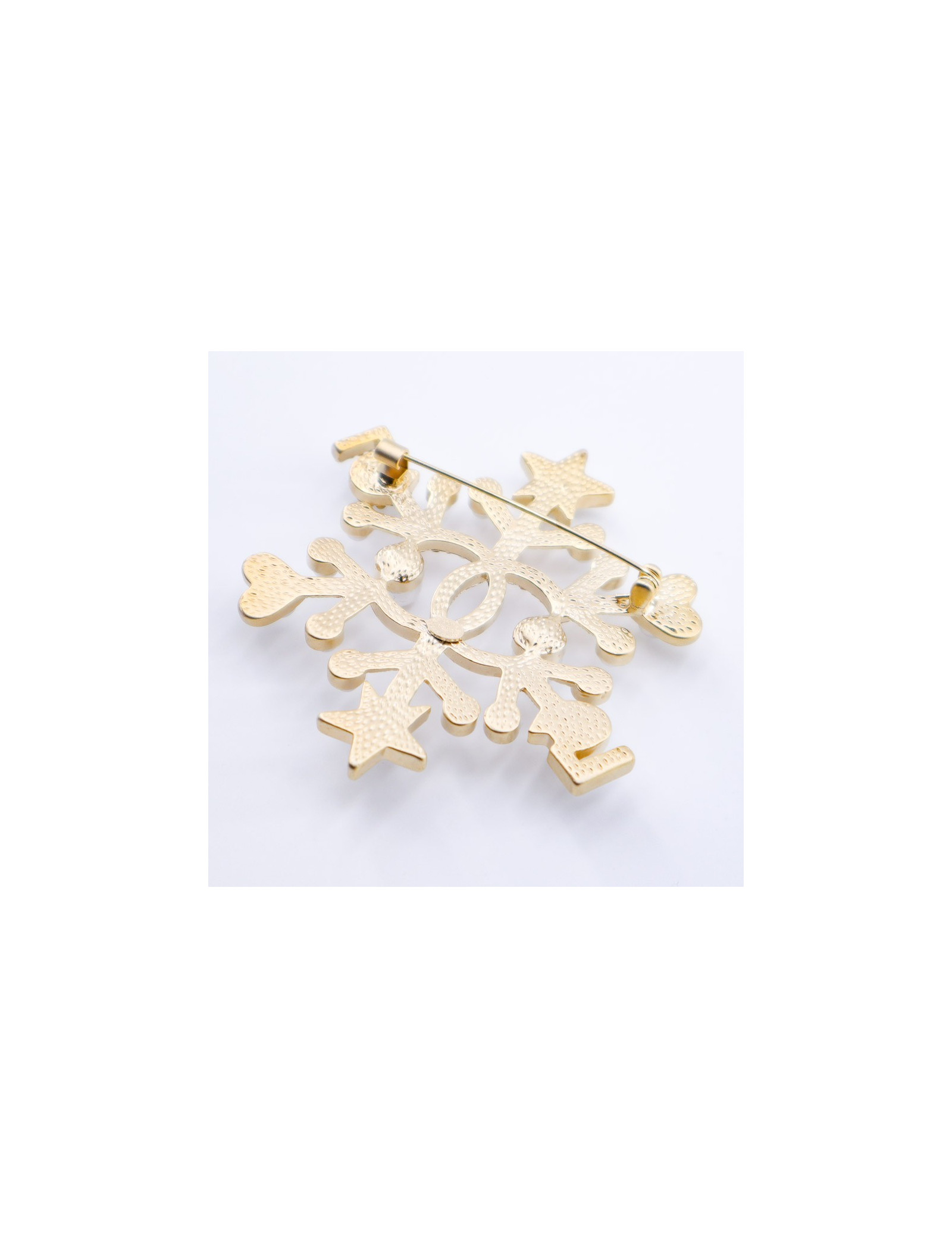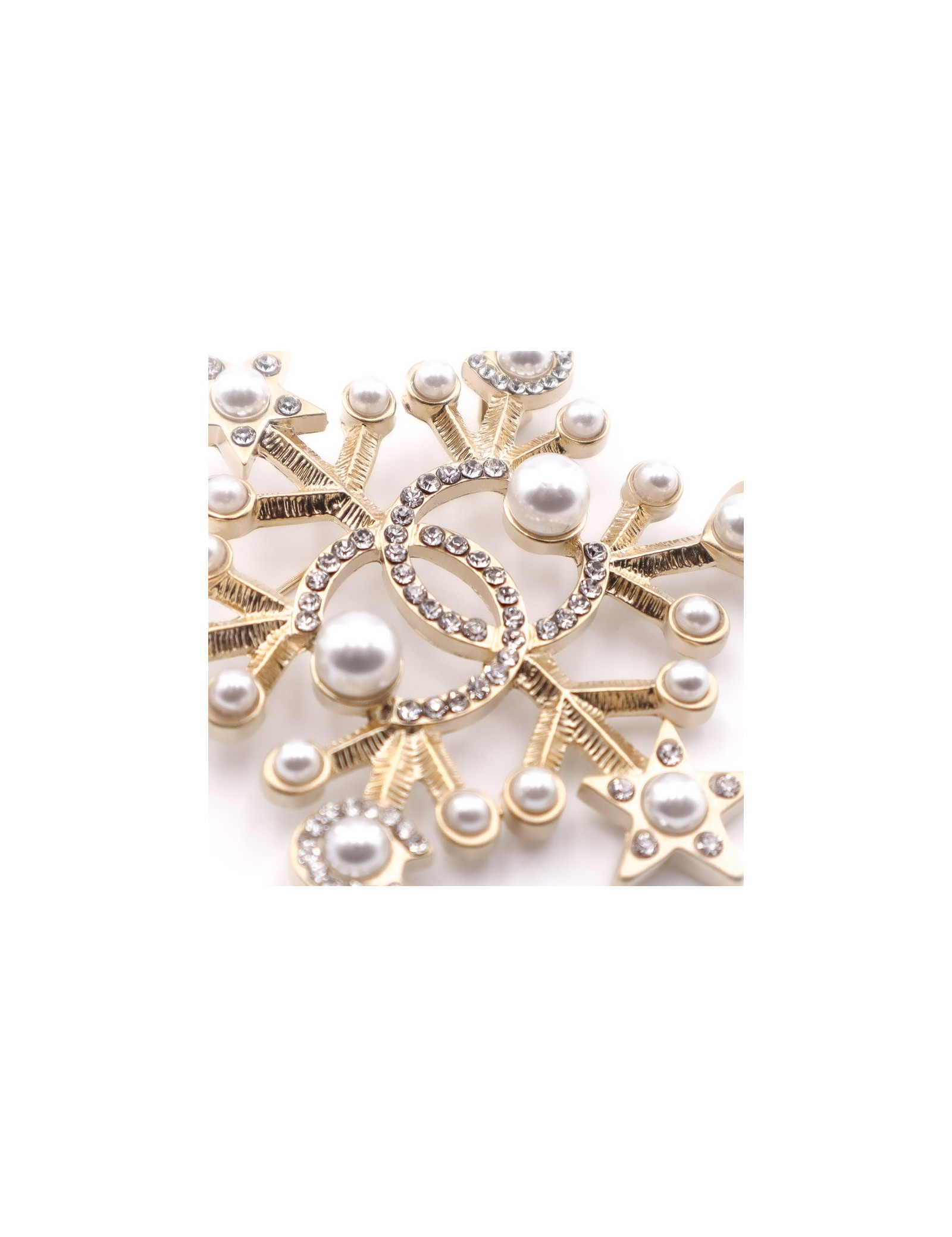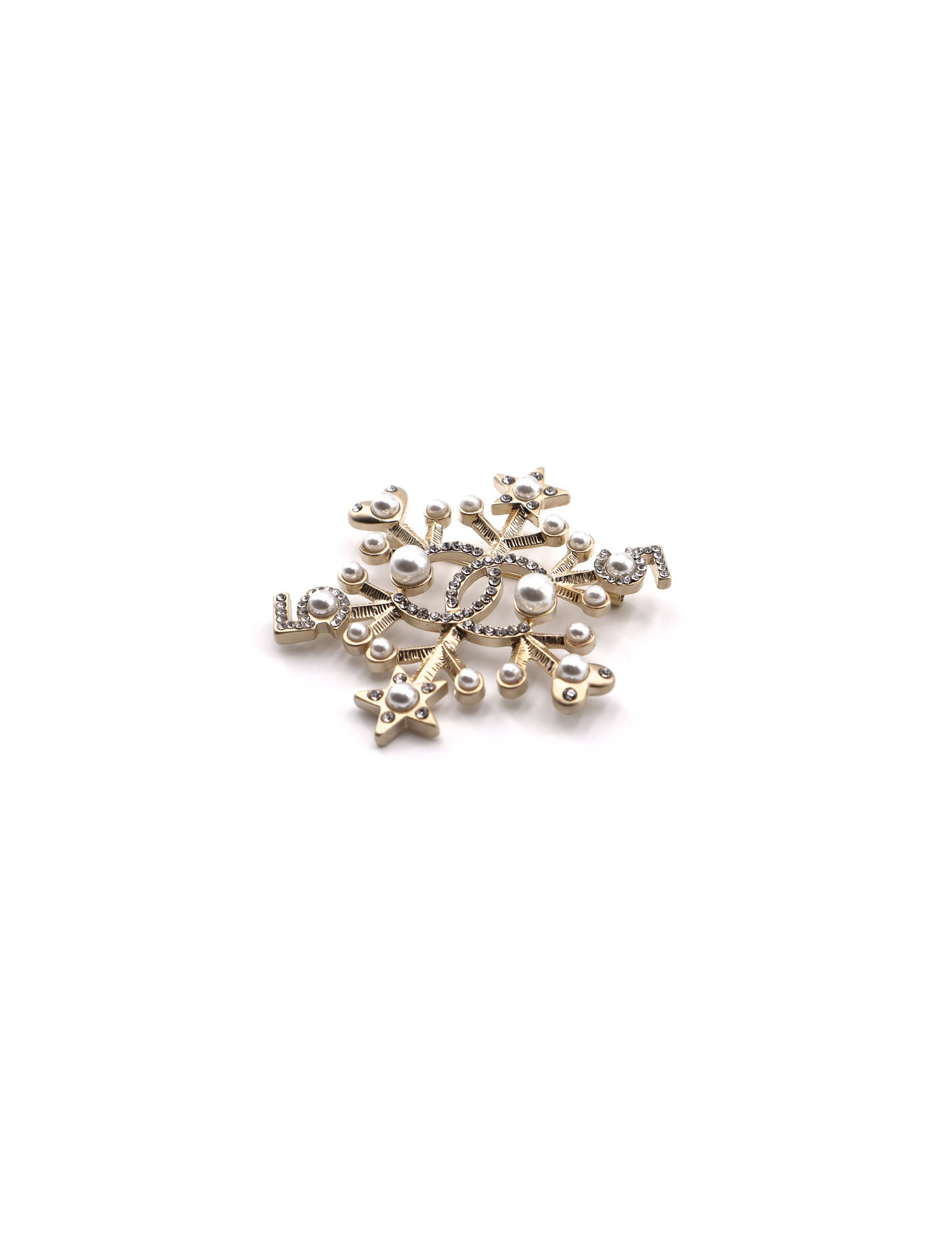Superbe bijou de la Maison CHANEL. Une broche en forme d’étoile de neige sur une base en métal doré à l'or fin, sur laquelle sont sertis perles nacrées et strass. Chaque extrémité de la broche se finit par un motif de petite étoile puis de petit coeur. Au centre de la broche, un CC important serti de strass.