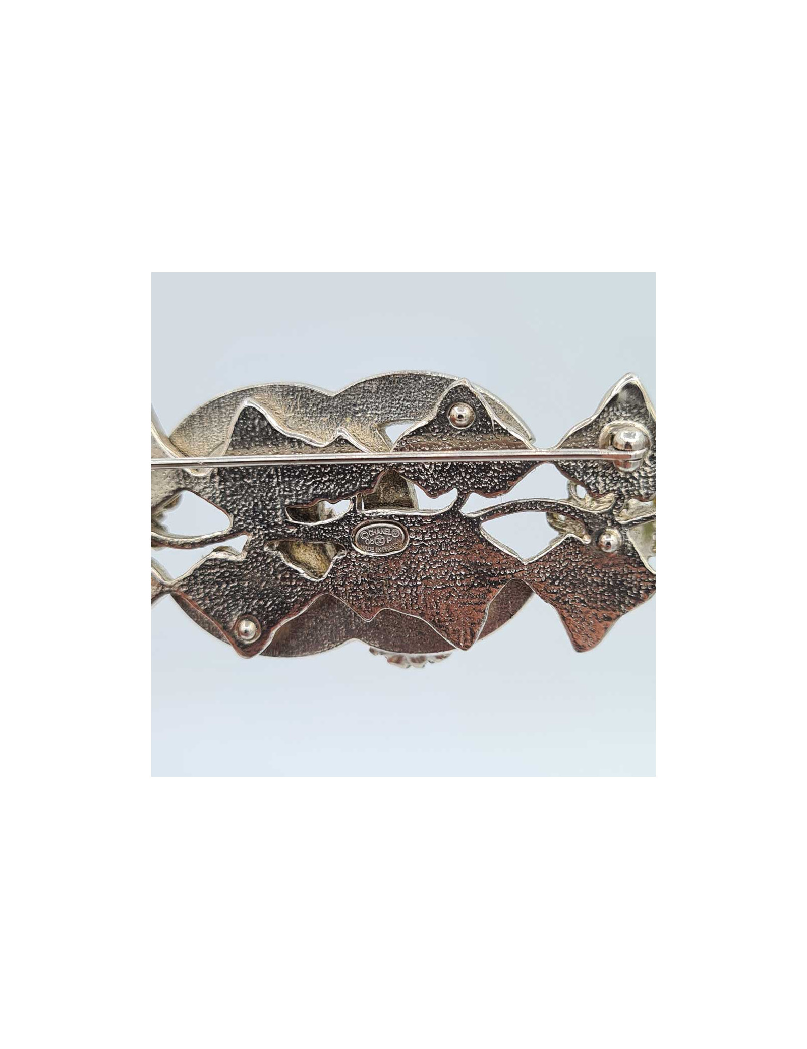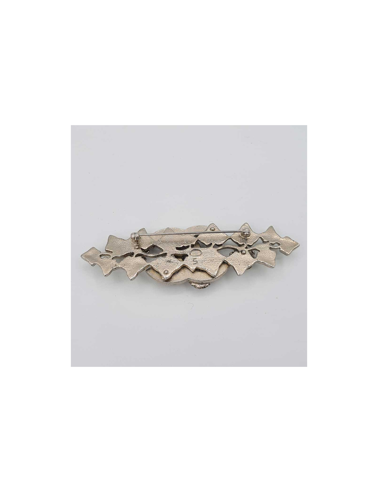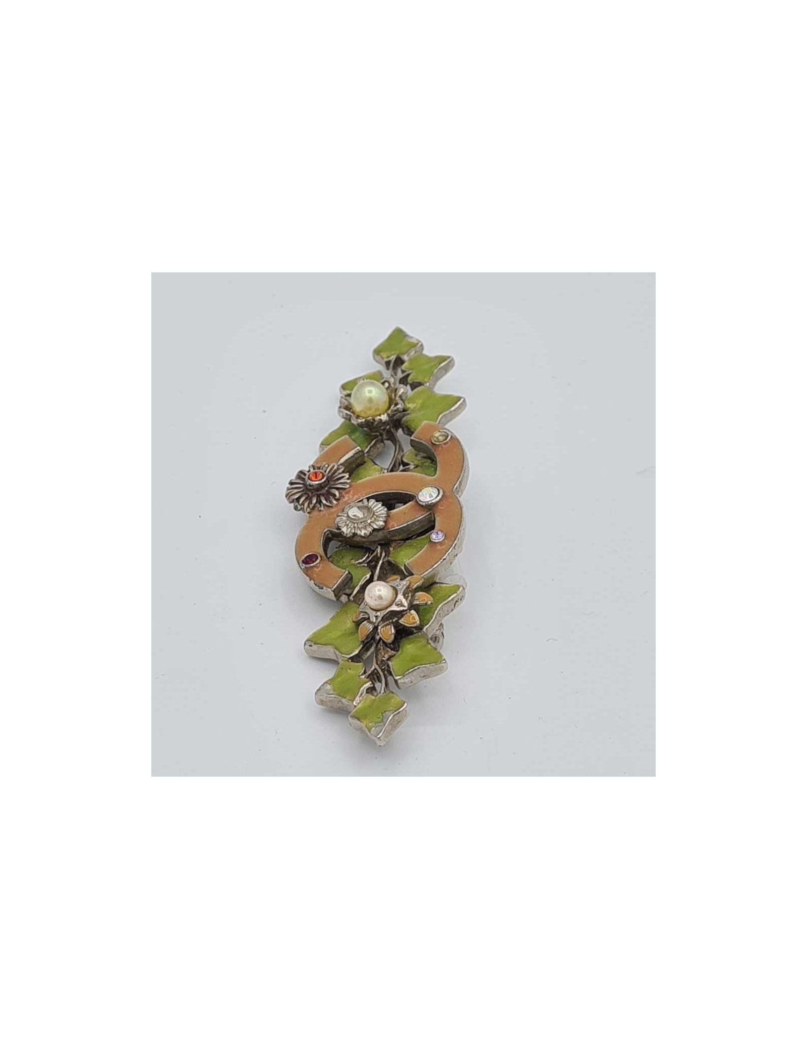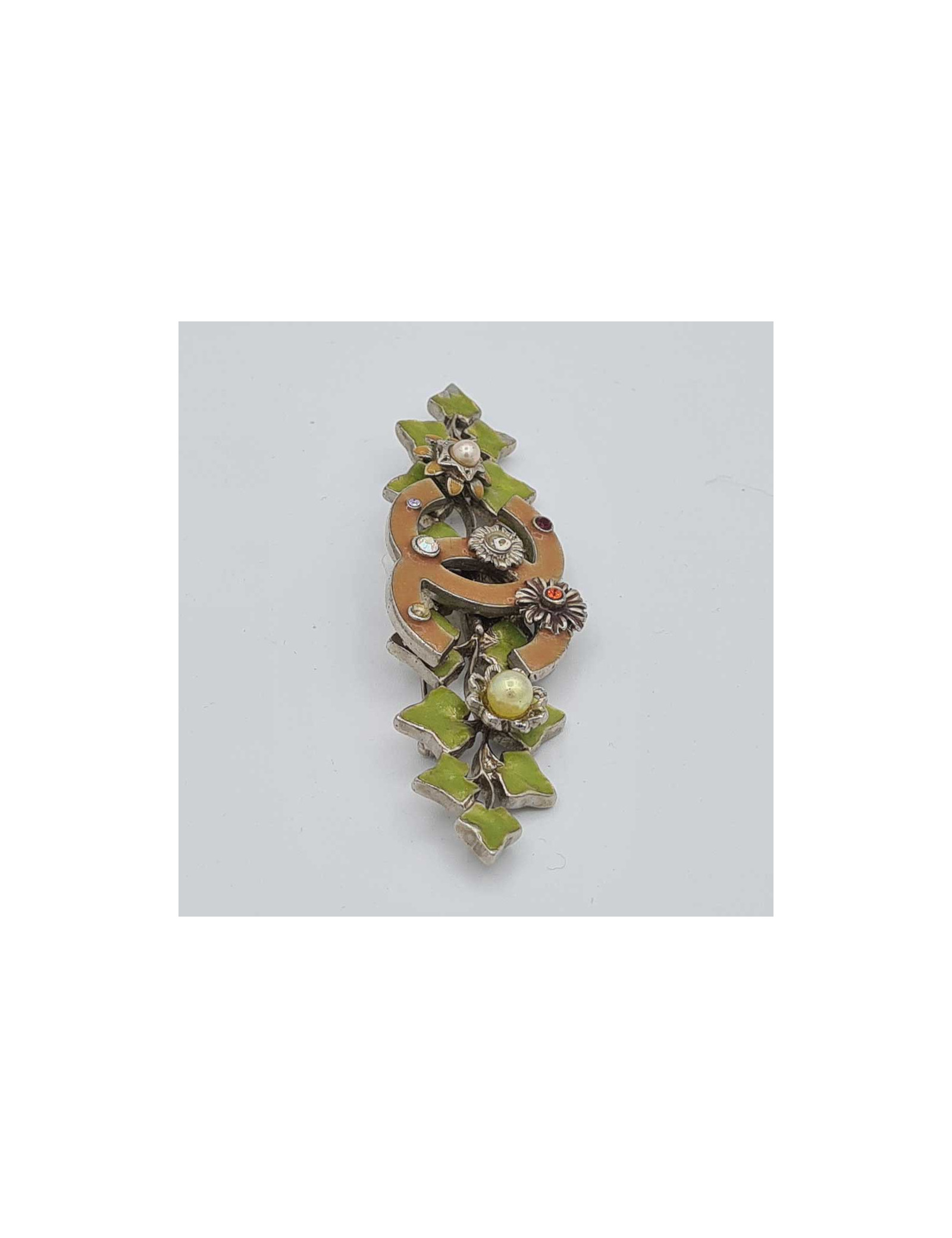 Cette jolie broche CHANEL est en métal argenté. Elle représente une branche de lierre verte avec un CC marron au centre avec de chaque côté une fleur dont le coeur est en perle.