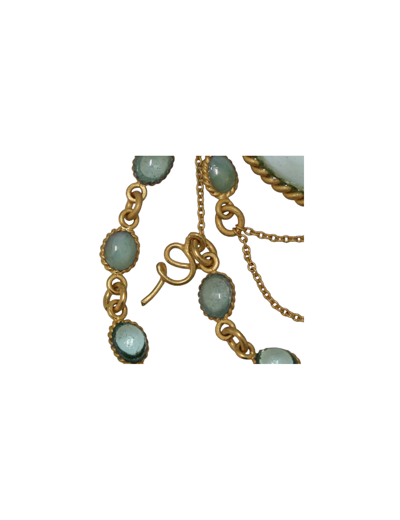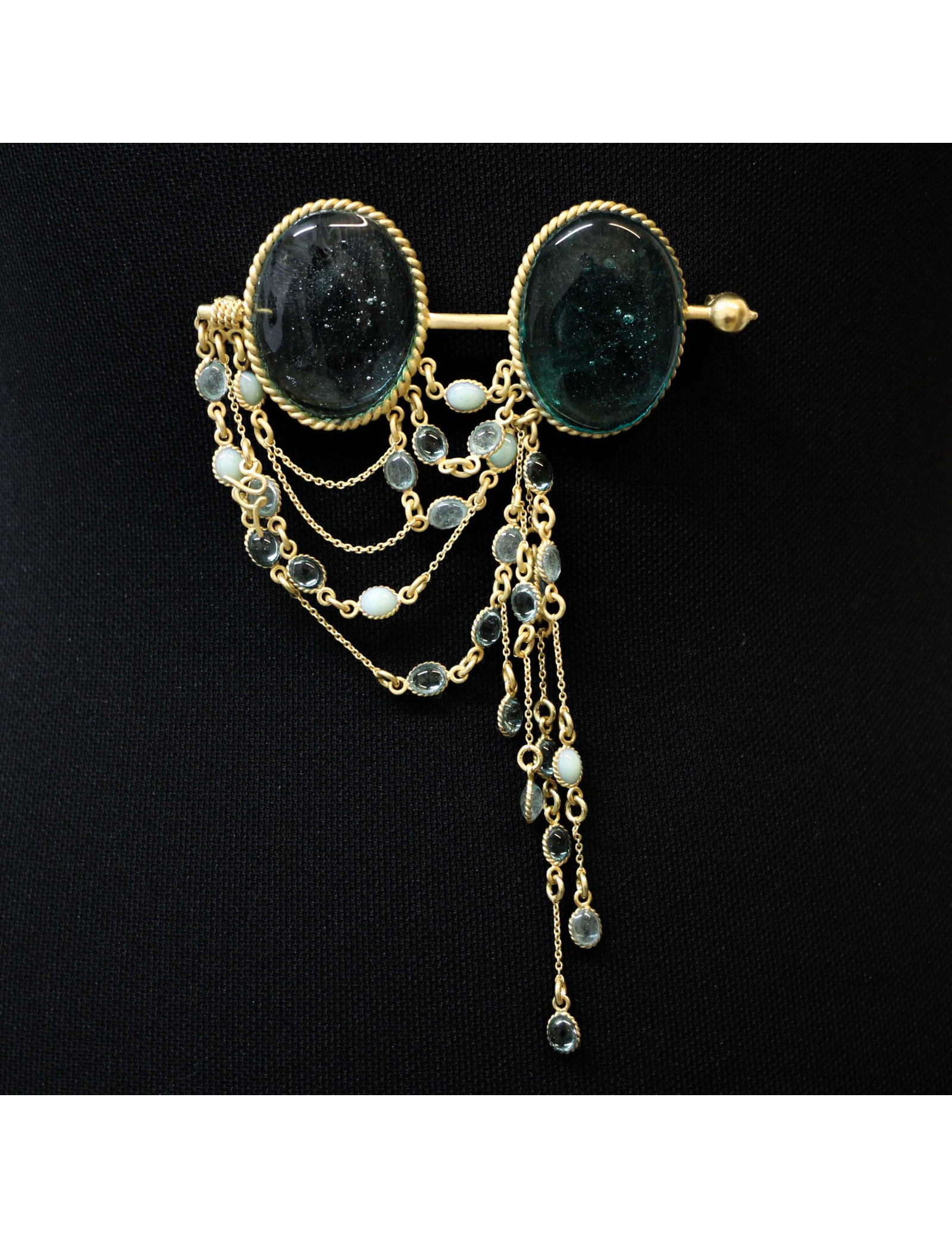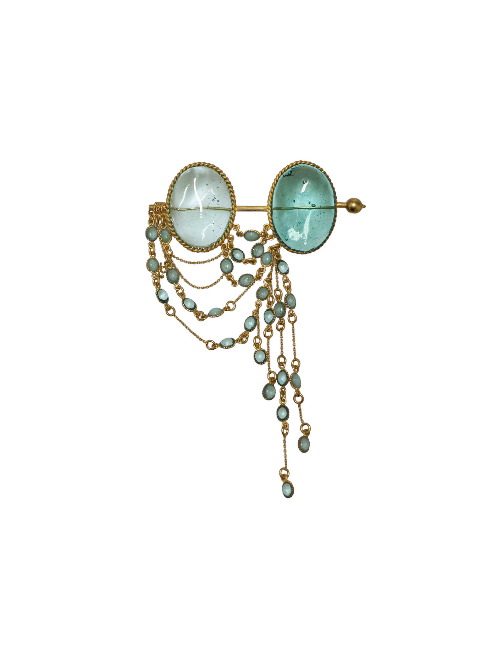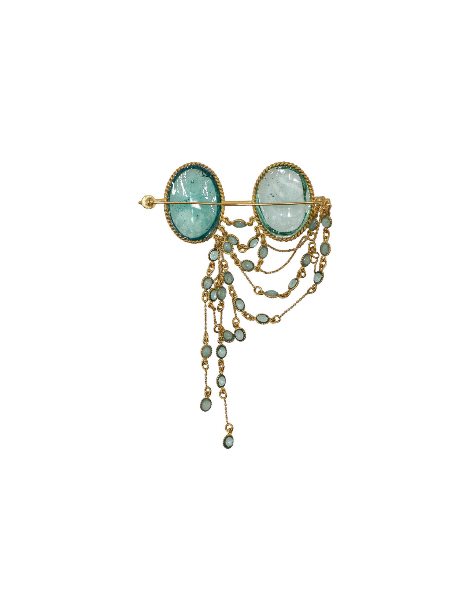 Détails : petit pendentif avec le logo G de Gripoix. La broche représente des face-à-main, les paires de lunettes utilisées au théâtre ou à l'opéra.