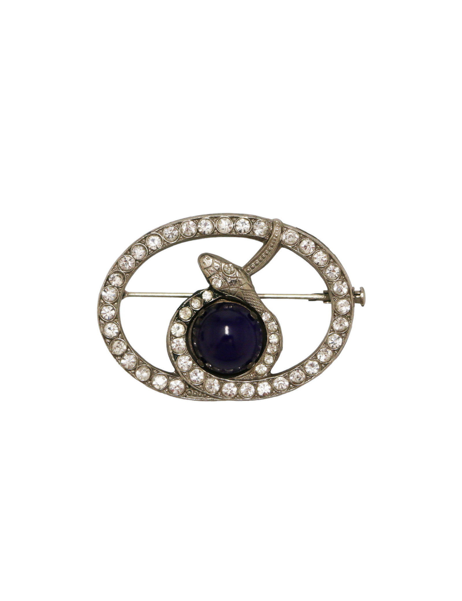 Détails : broche ovale représentant un serpent recouvert de strass autour d'une pierre bleu marine.