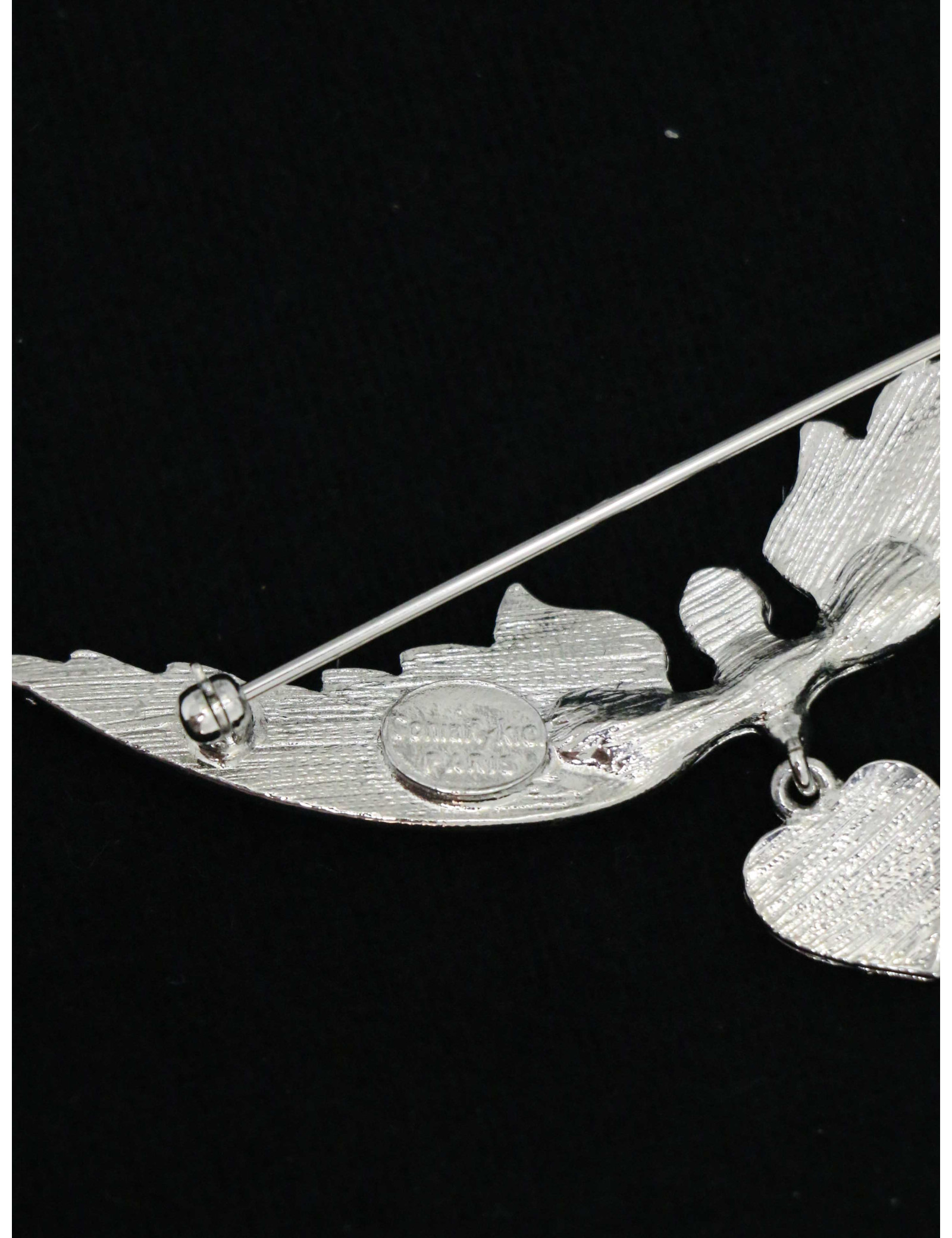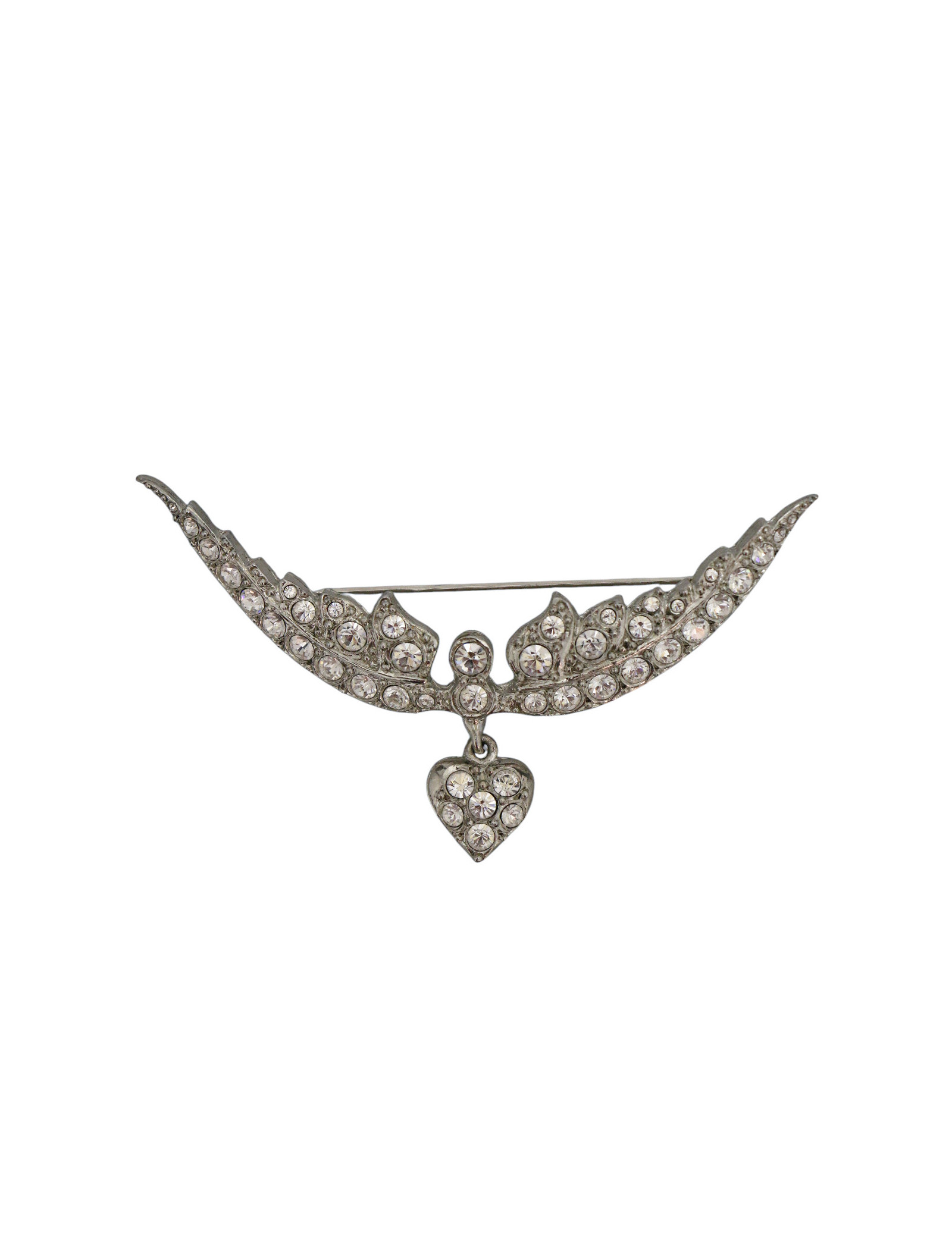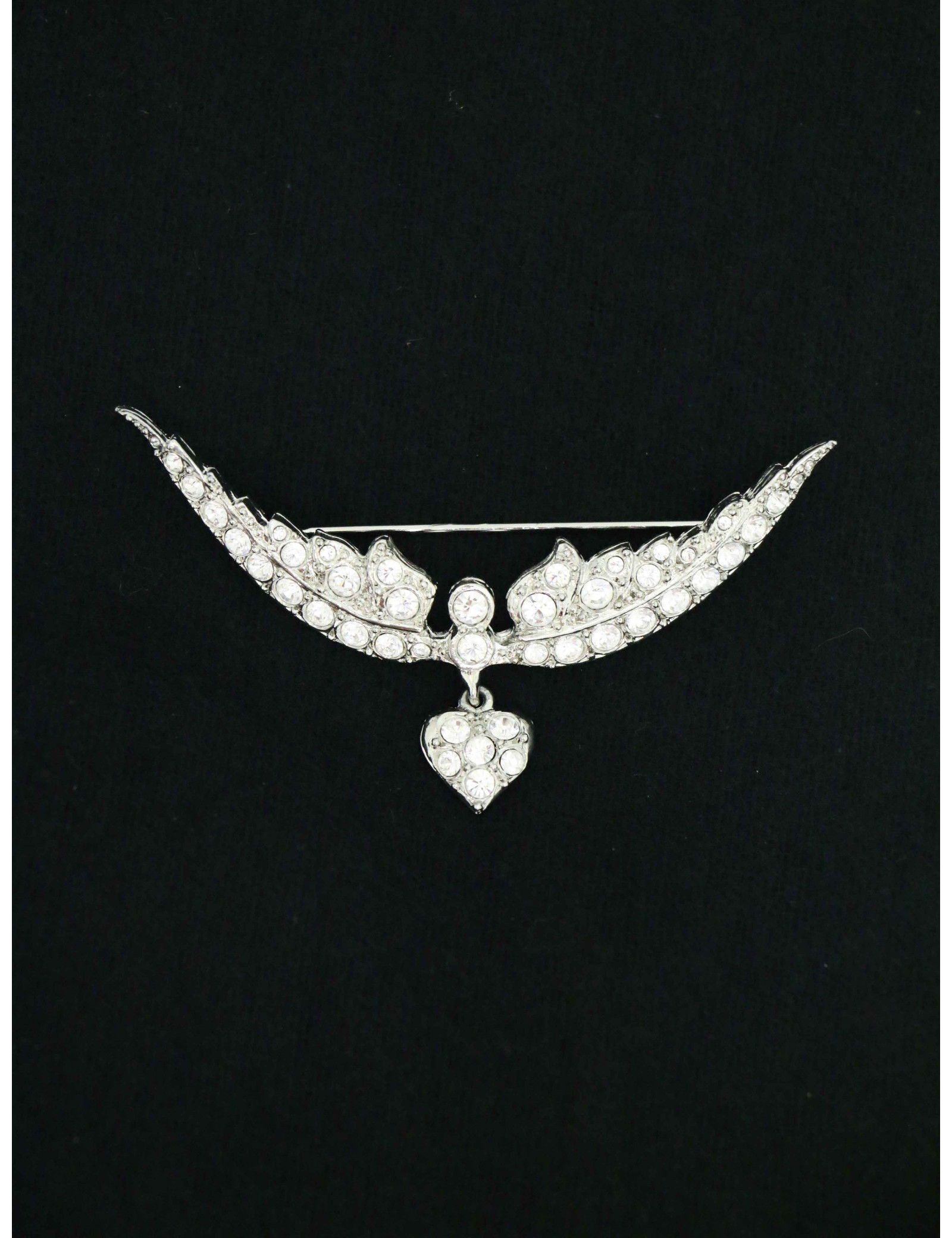 Détails : sublime broche en forme d'ailes déployées et un petit coeur pendant ornés de strass