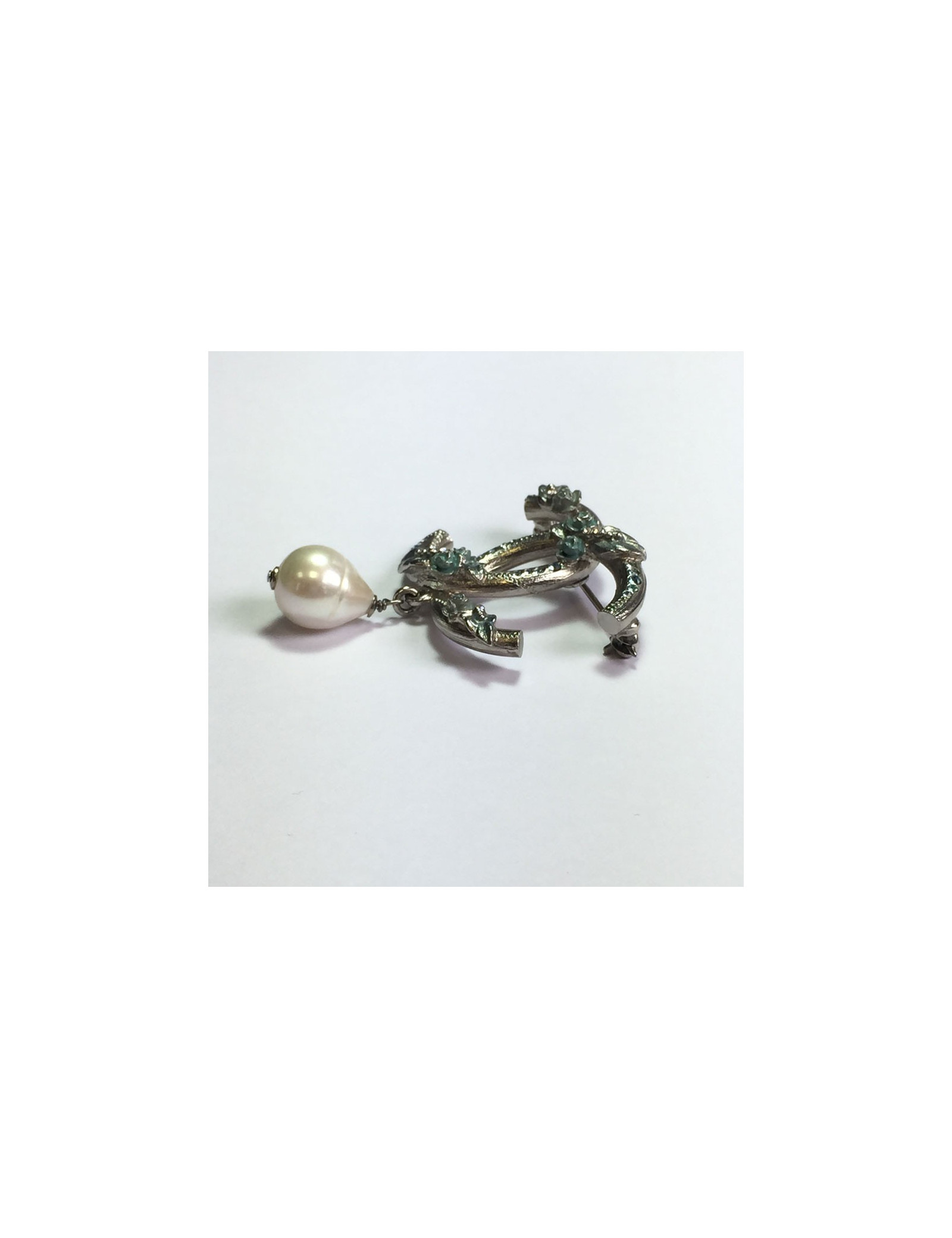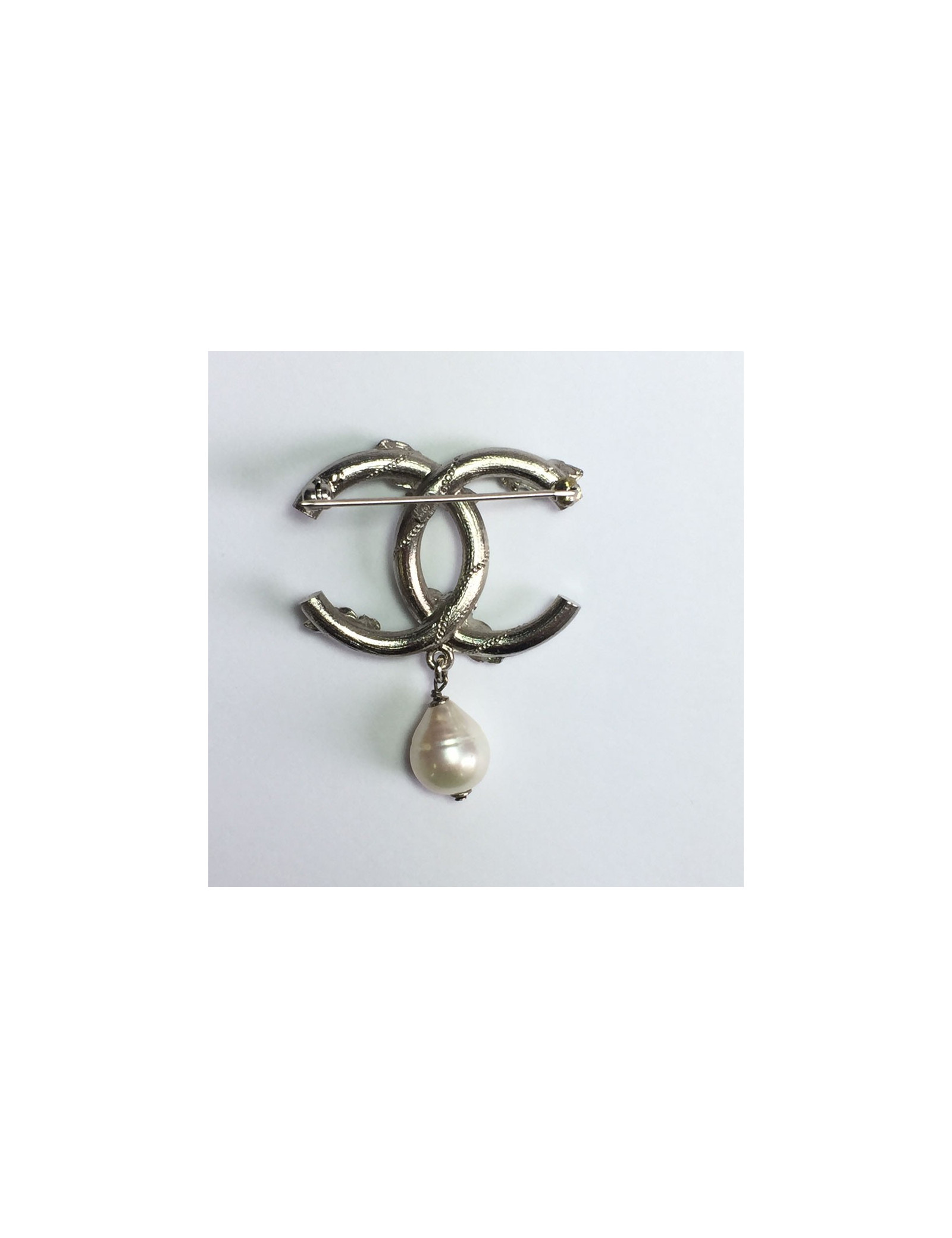 Broche CHANEL en métal argenté, émail bleu, perle et strass