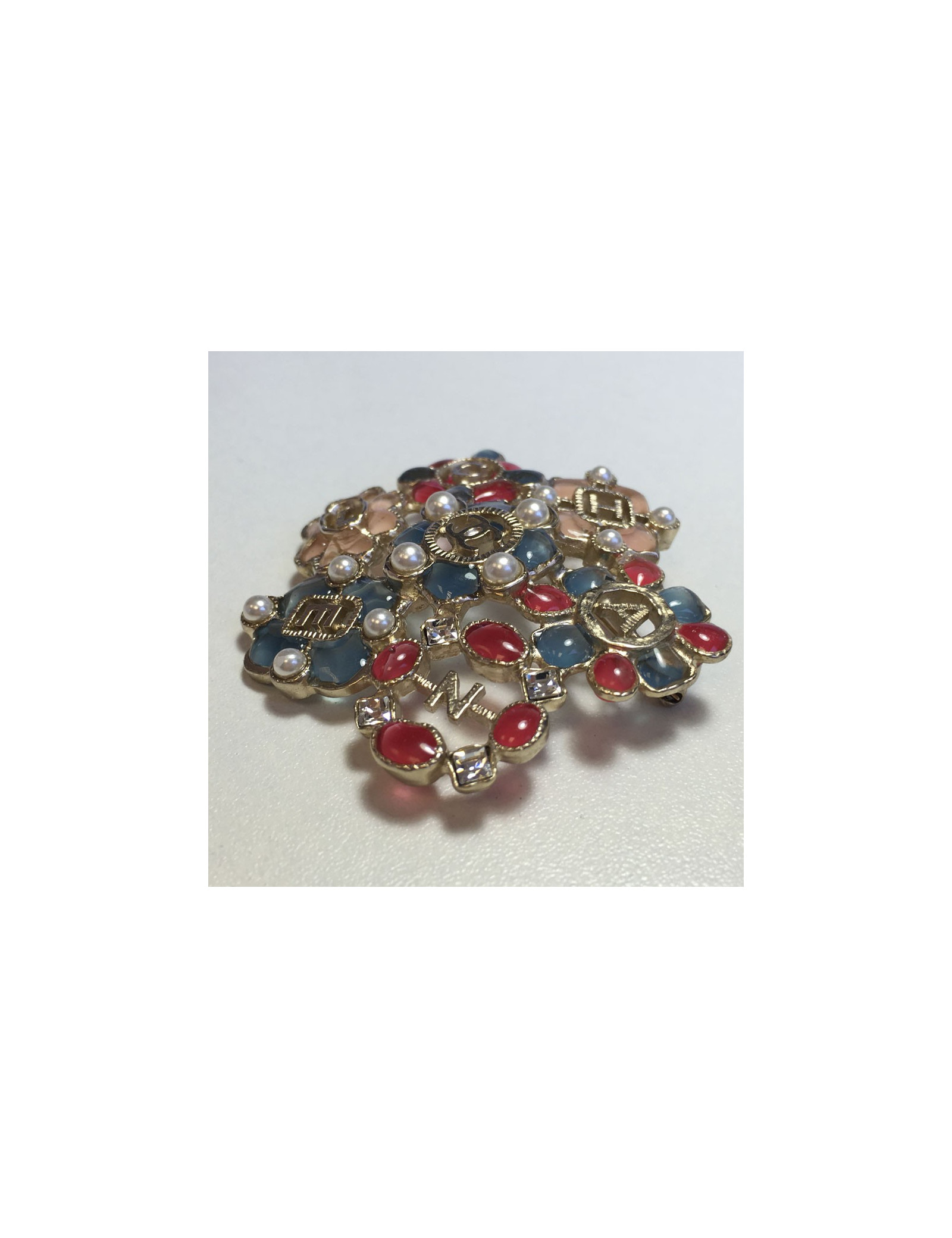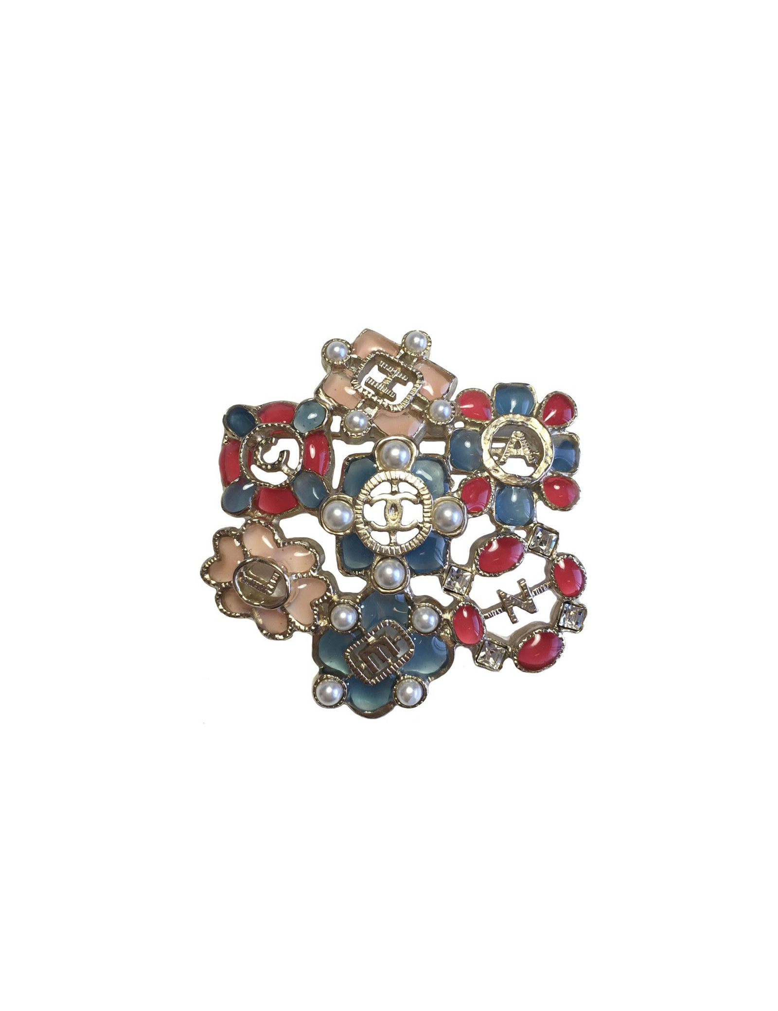 Superbe broche Chanel en métal doré or pâle, avec incrustations en résine bleu, rose et fuschia, perles nacrées et strass. Collection Printemps/ été 2016. Il y a l'inscription "C H A N E L" en lettres dorées. En très bon état.