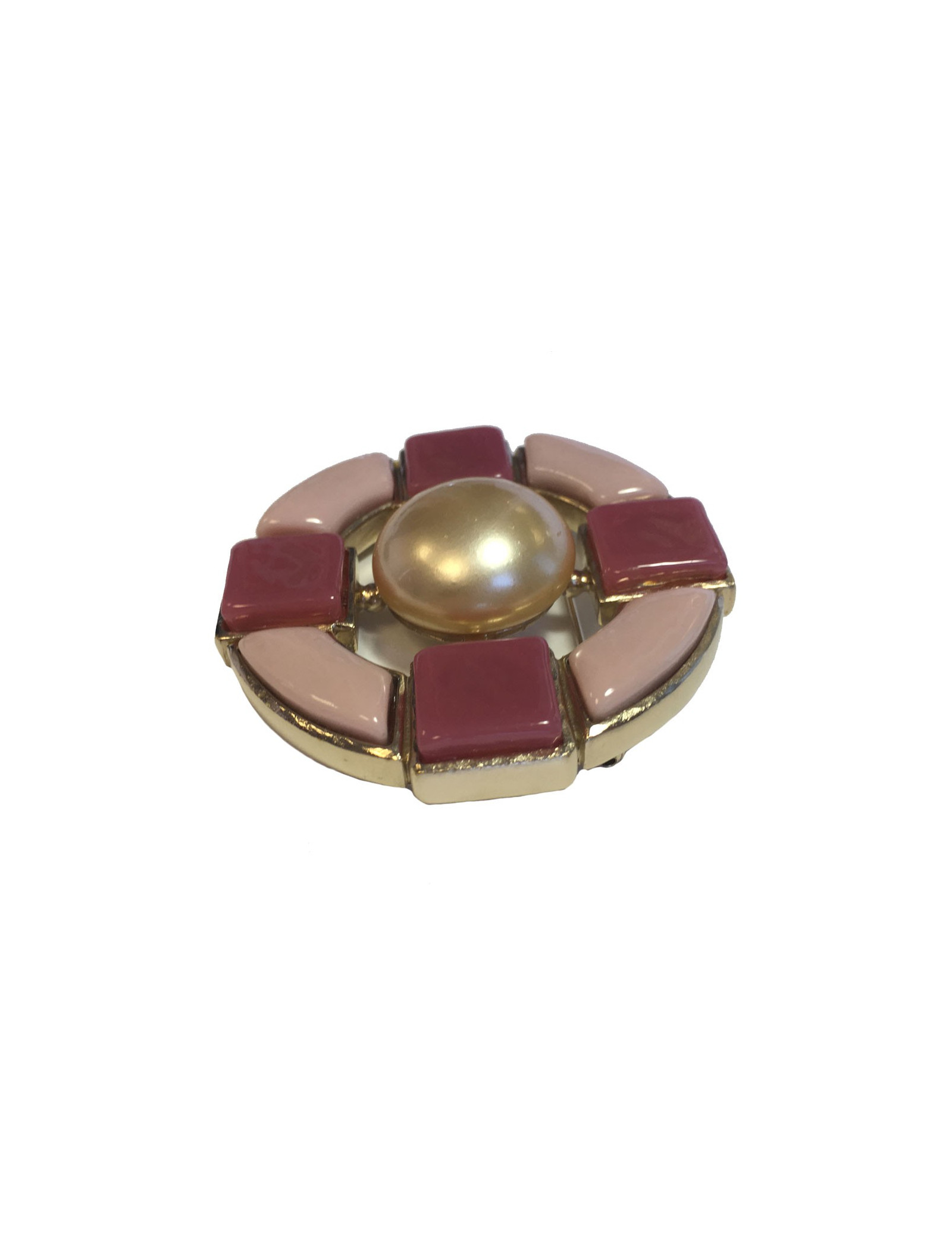 Splendide broche CHANEL ronde en métal doré, pâte de verre rose claire et rose foncée et une perle nacrée au centre. Collection automne//hiver 2009. En parfait état. Pastille de la marque au dos.