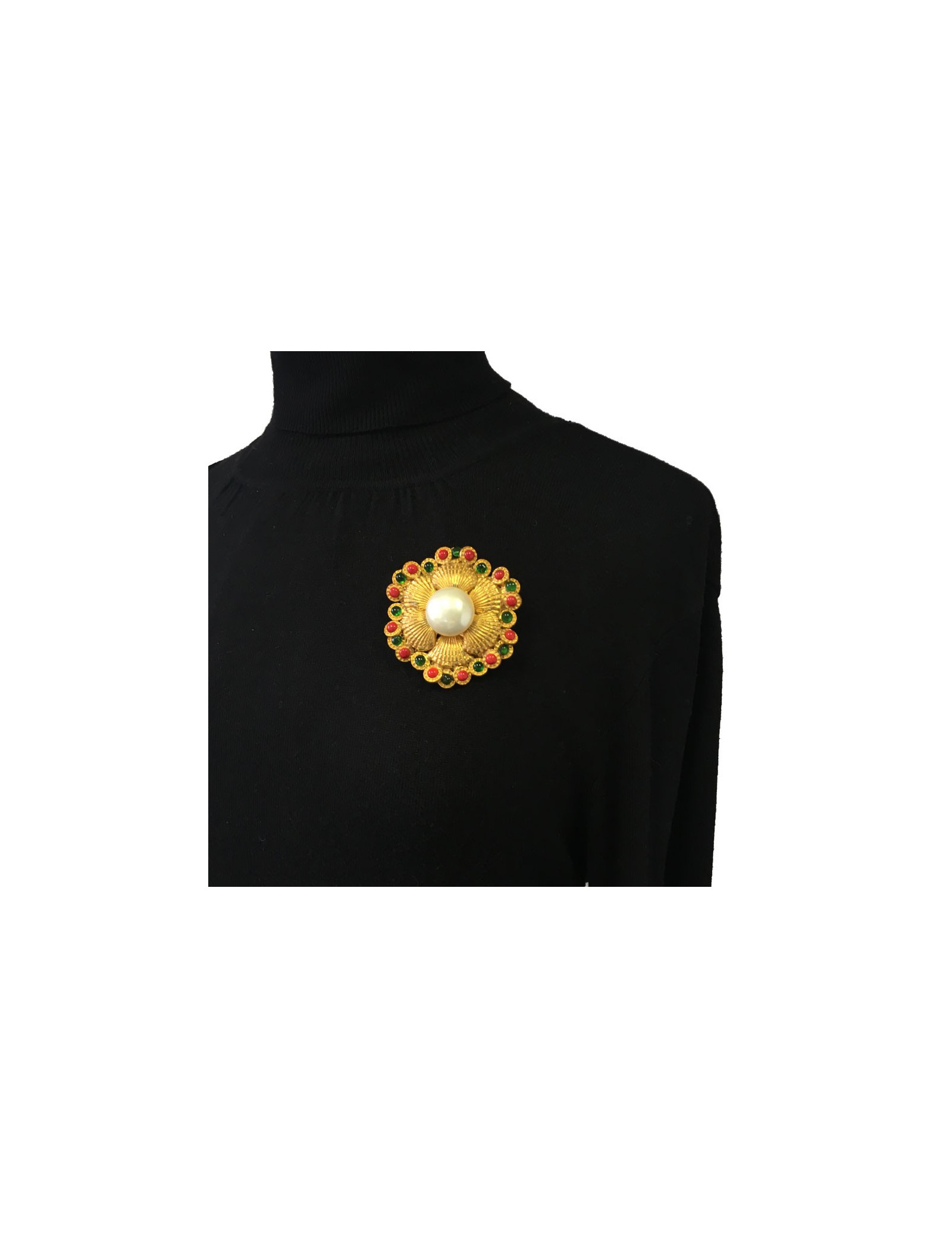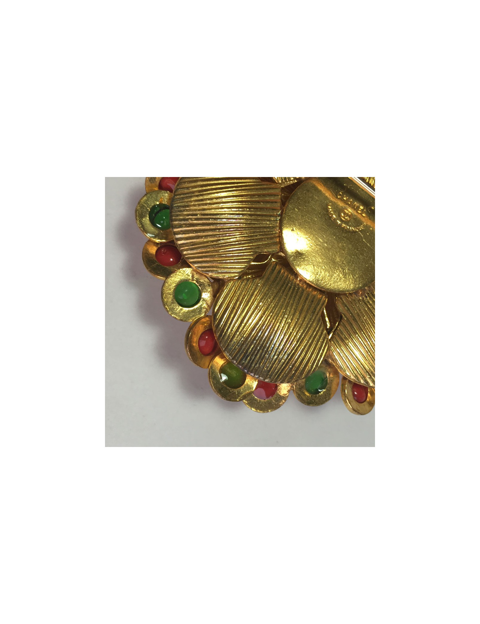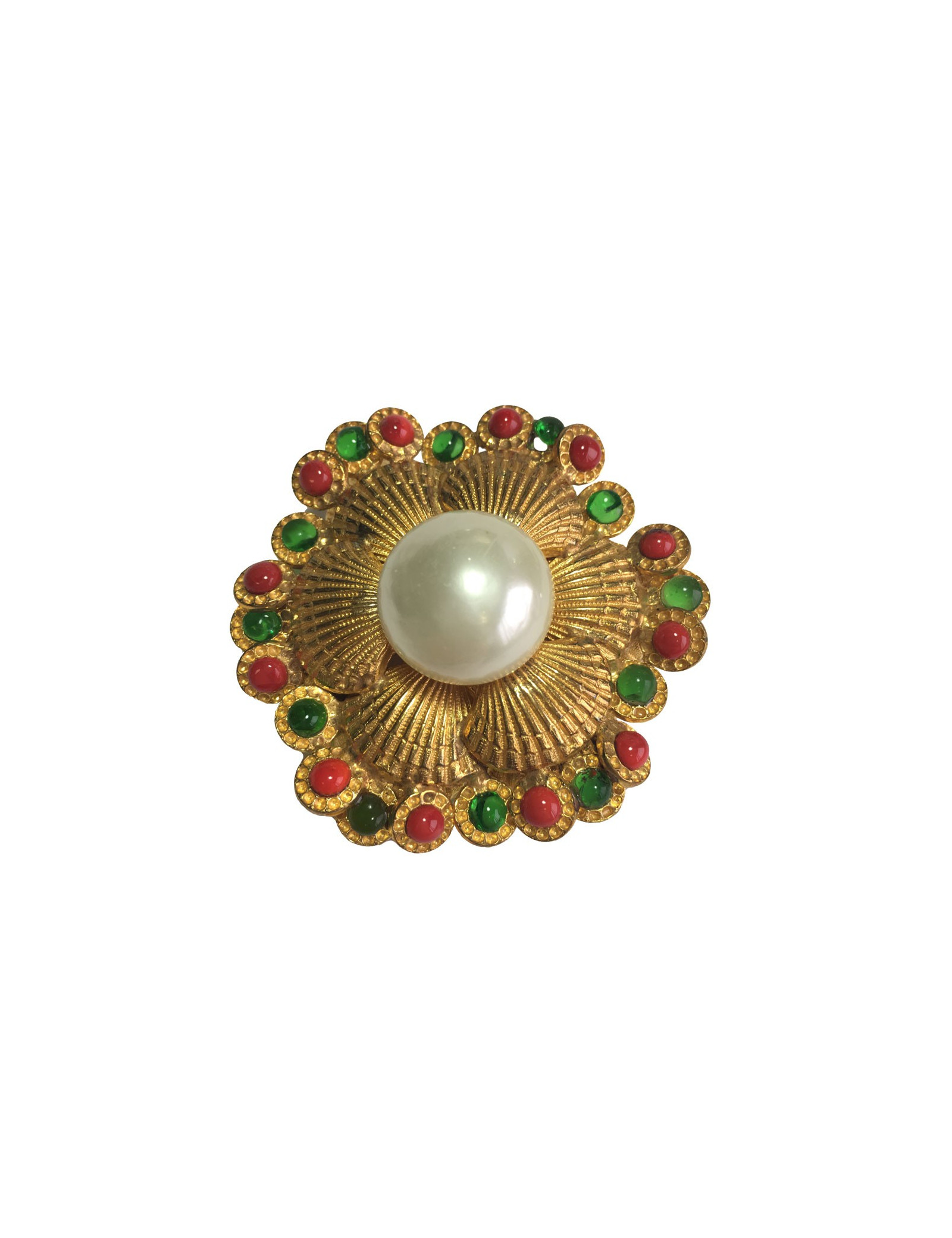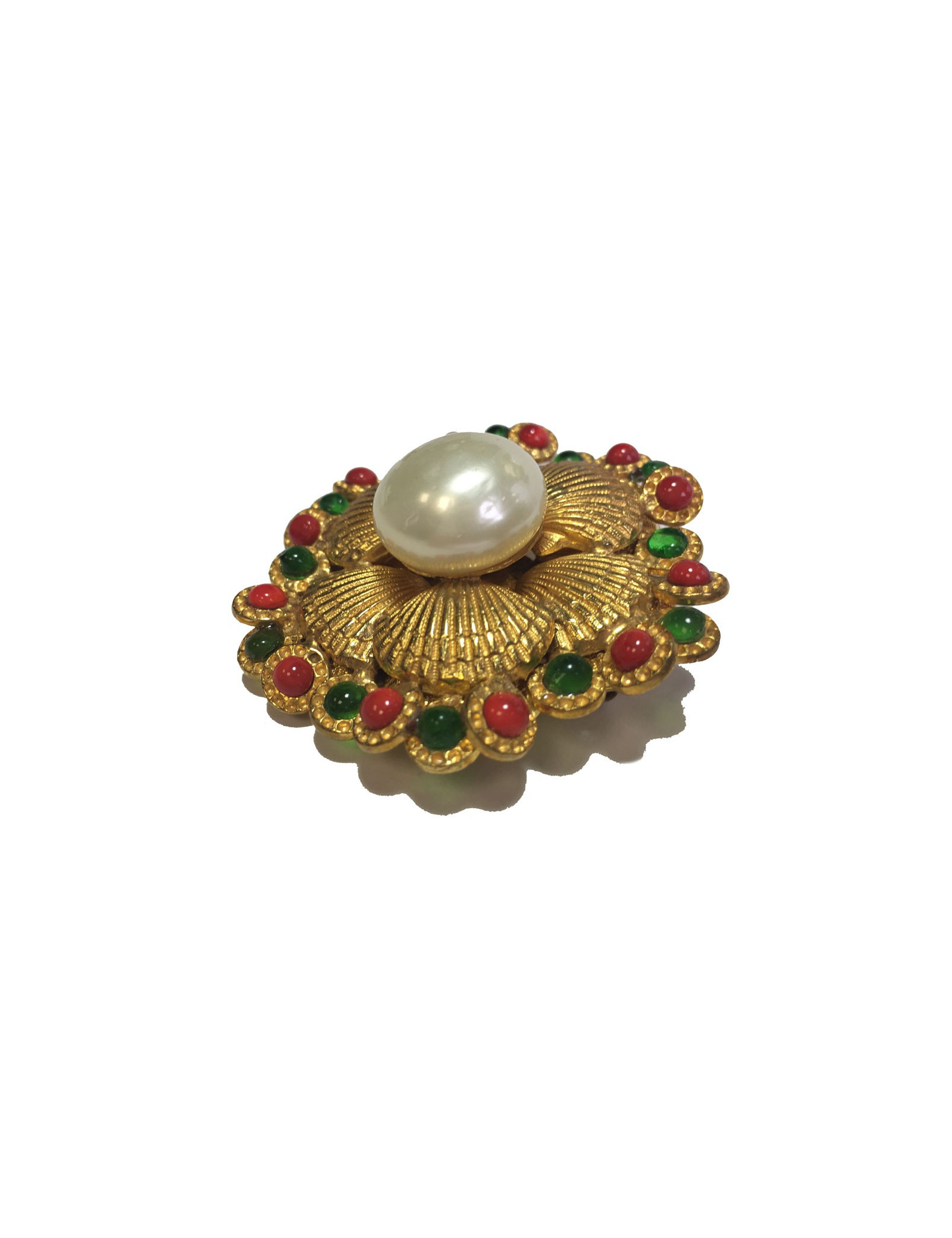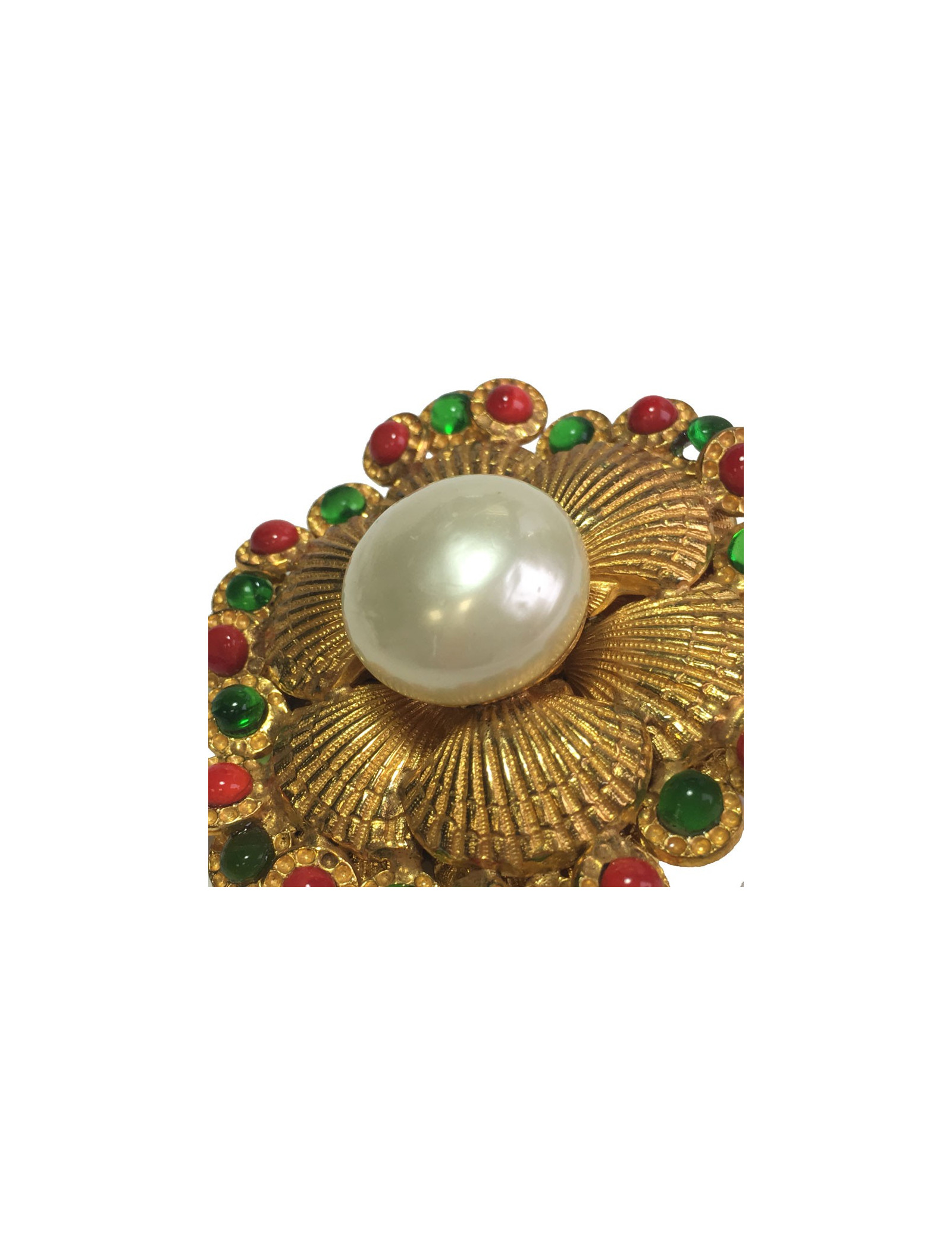 Exceptionnelle broche Couture, en forme de coquillage, en métal dorée sertie de cabochons fabriqués en pâte de verre rubis et vert émeraude. Elle a au centre une belle perle en pâte de verre fabriquée artisanalement nacrée. Le cryptogramme CHANEL est inscrit au dos de la broche. Il devient très difficile de trouver des pièce rares Chanel. Elle est en très bon état.