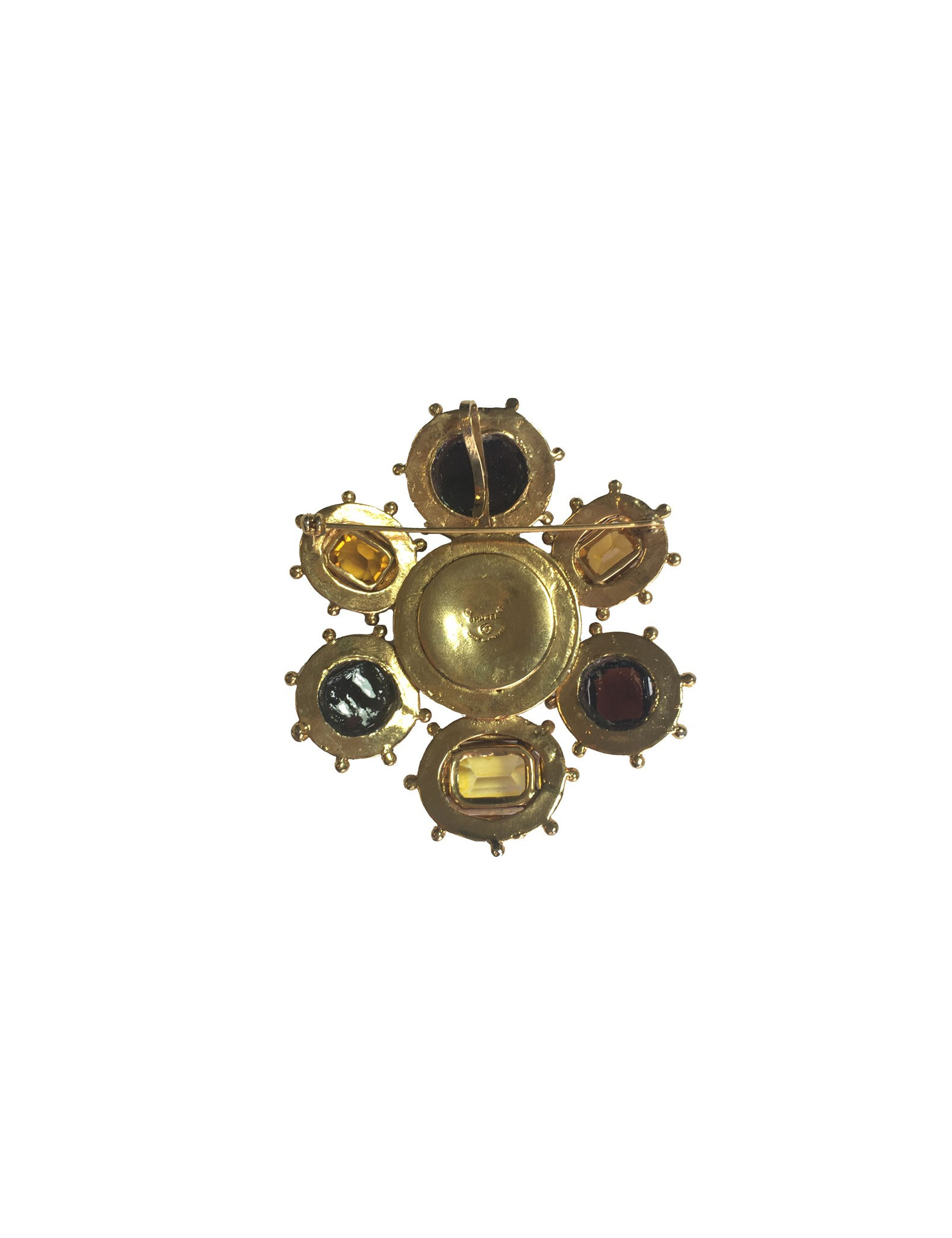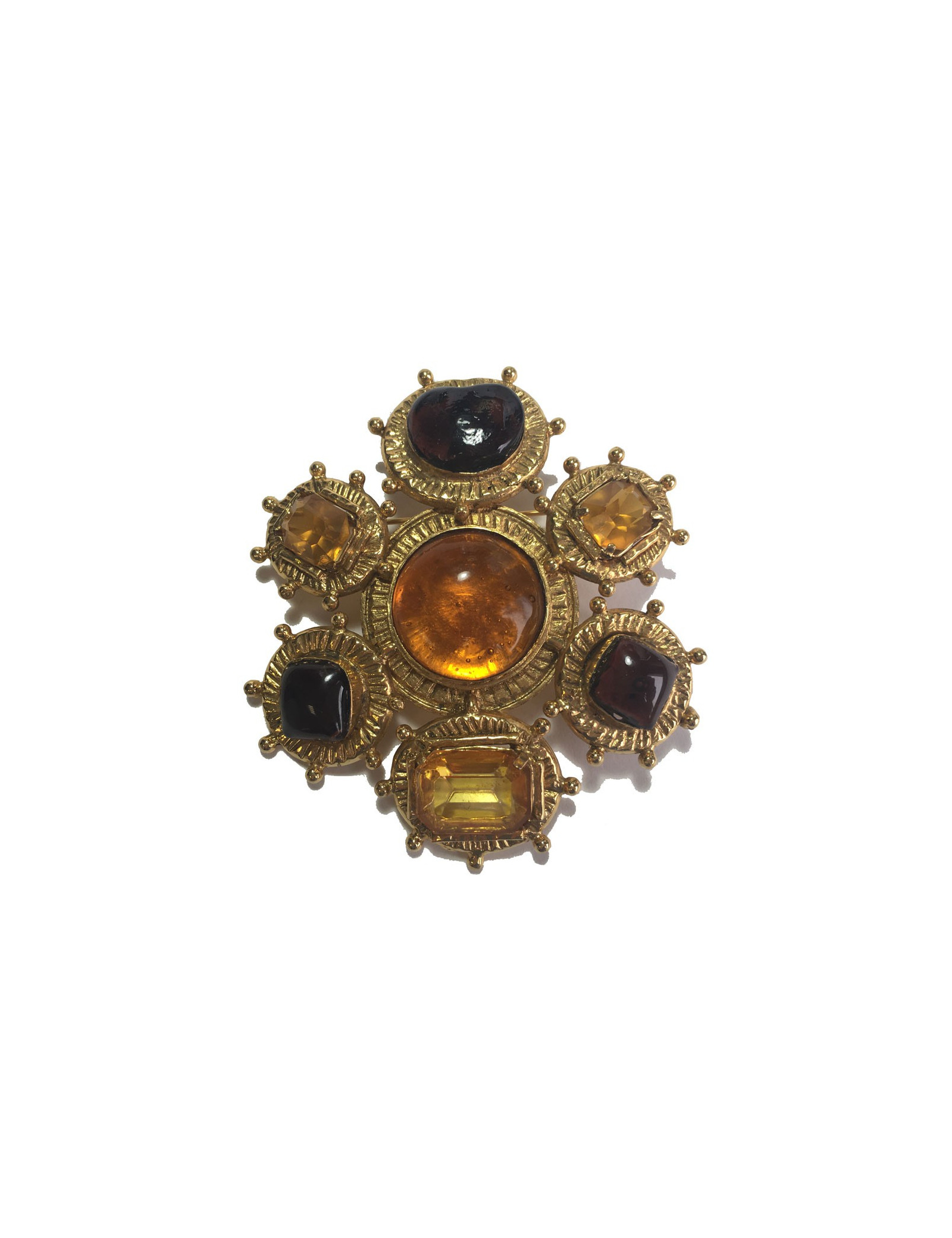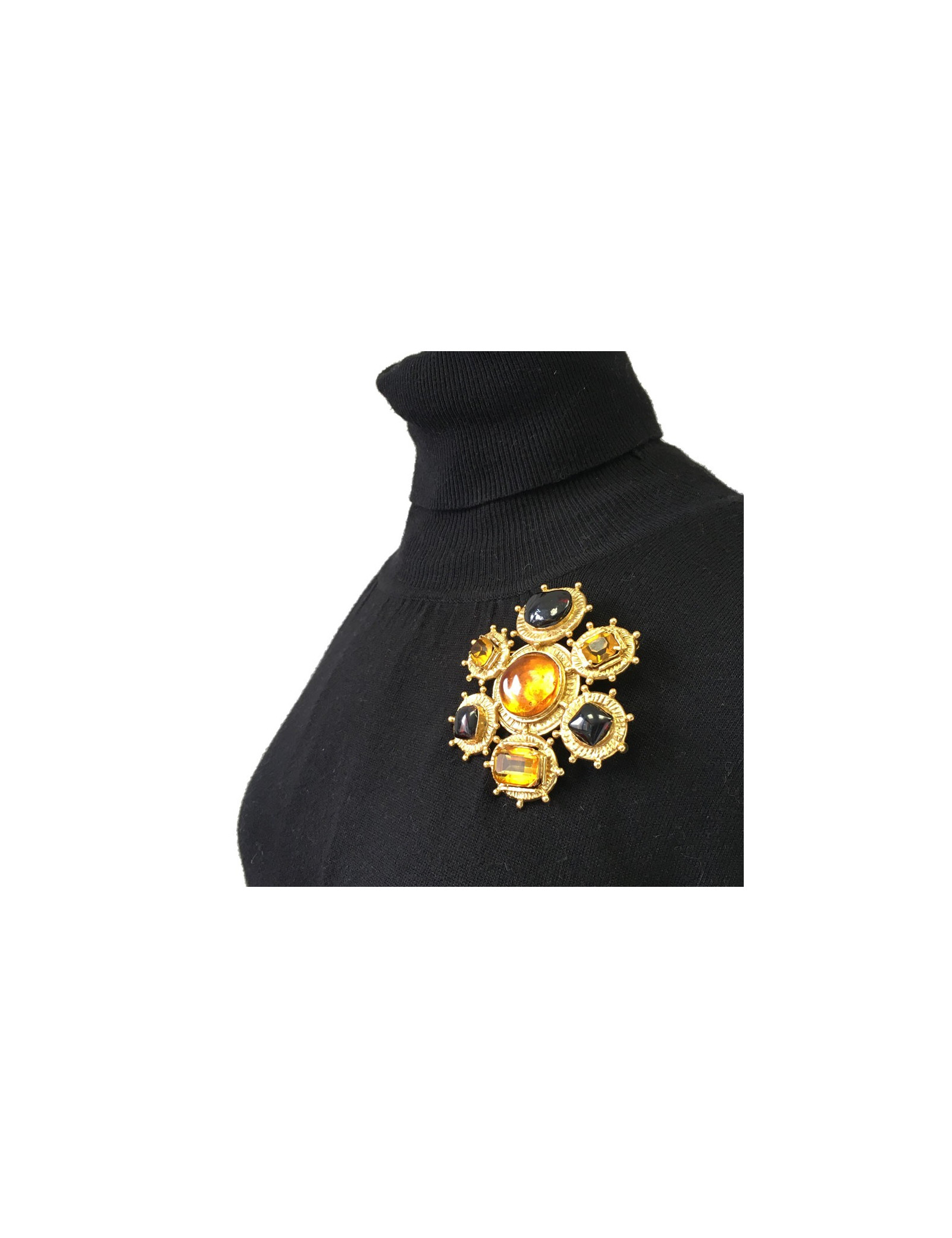 Collector !! Magnifique broche Couture Chanel en métal doré, en pâte de verre de couleur ambre au centre et ambre plus foncé sur les extérieurs, trois grands strass taille émeraude de même couleur ambre. Bijou en parfait état.