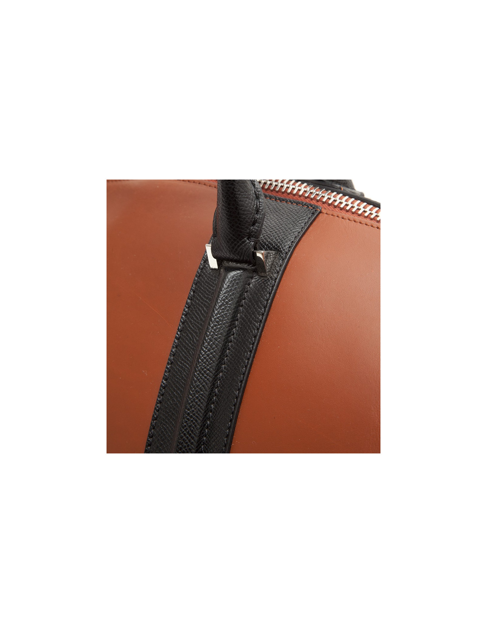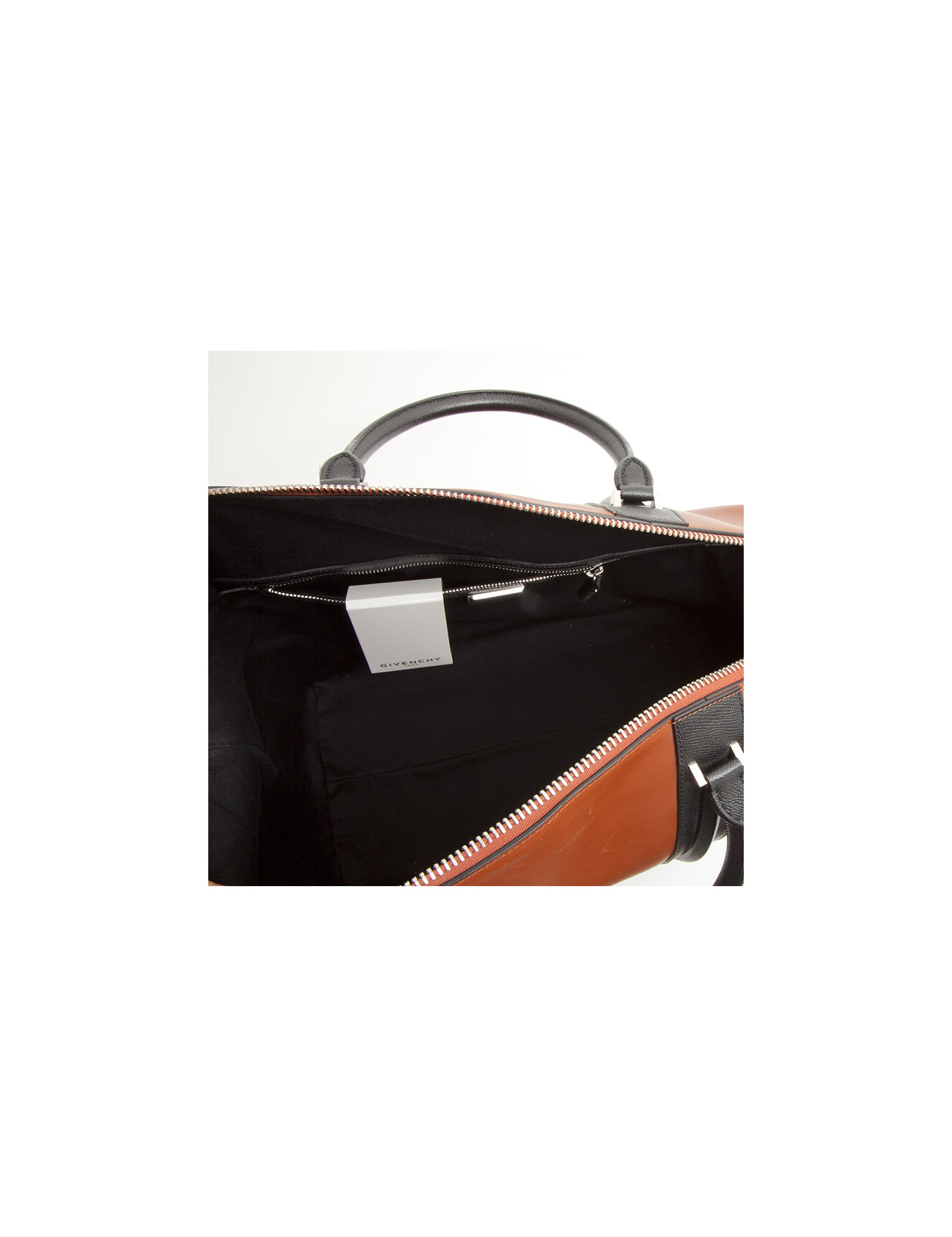 Sac GIVENCHY 24 HEURES en cuir box camel et cuir grainé noir. Il a une bijouterie argentée. Il a une fermeture éclair double porté main avec ses deux anses. Il a deux languettes de chaque côté. L'intérieur est en toile noire avec une poche zippée.