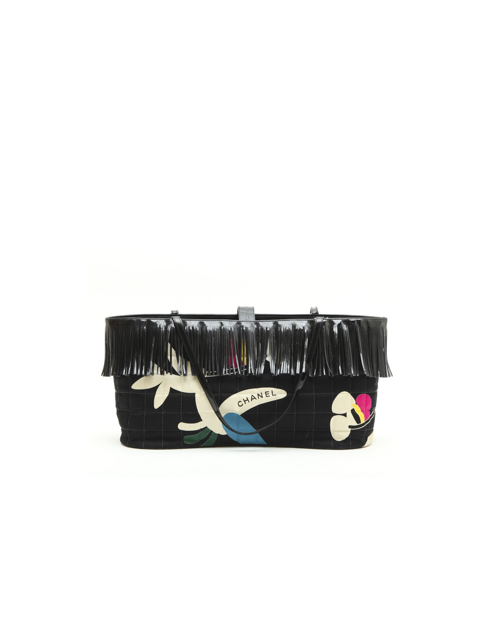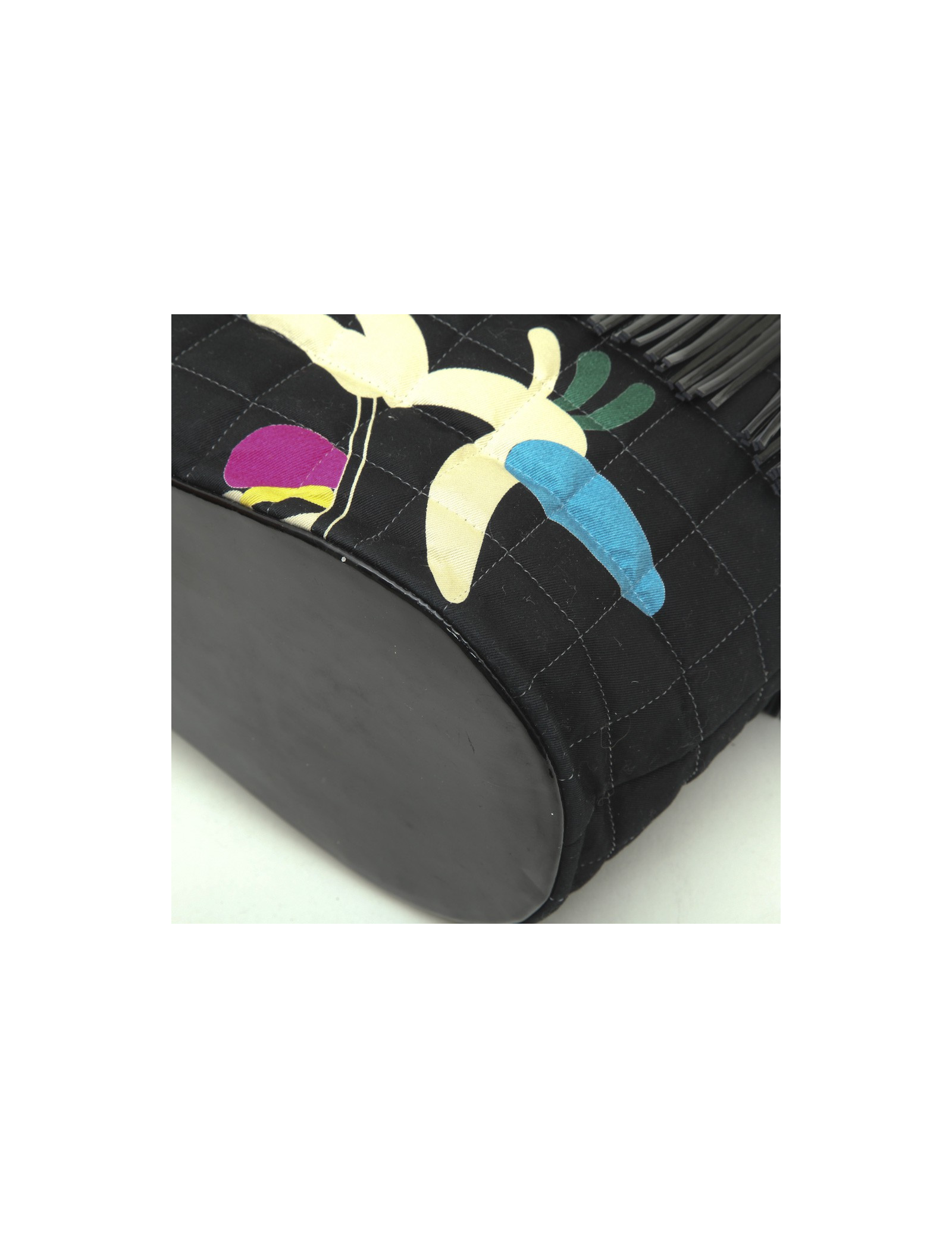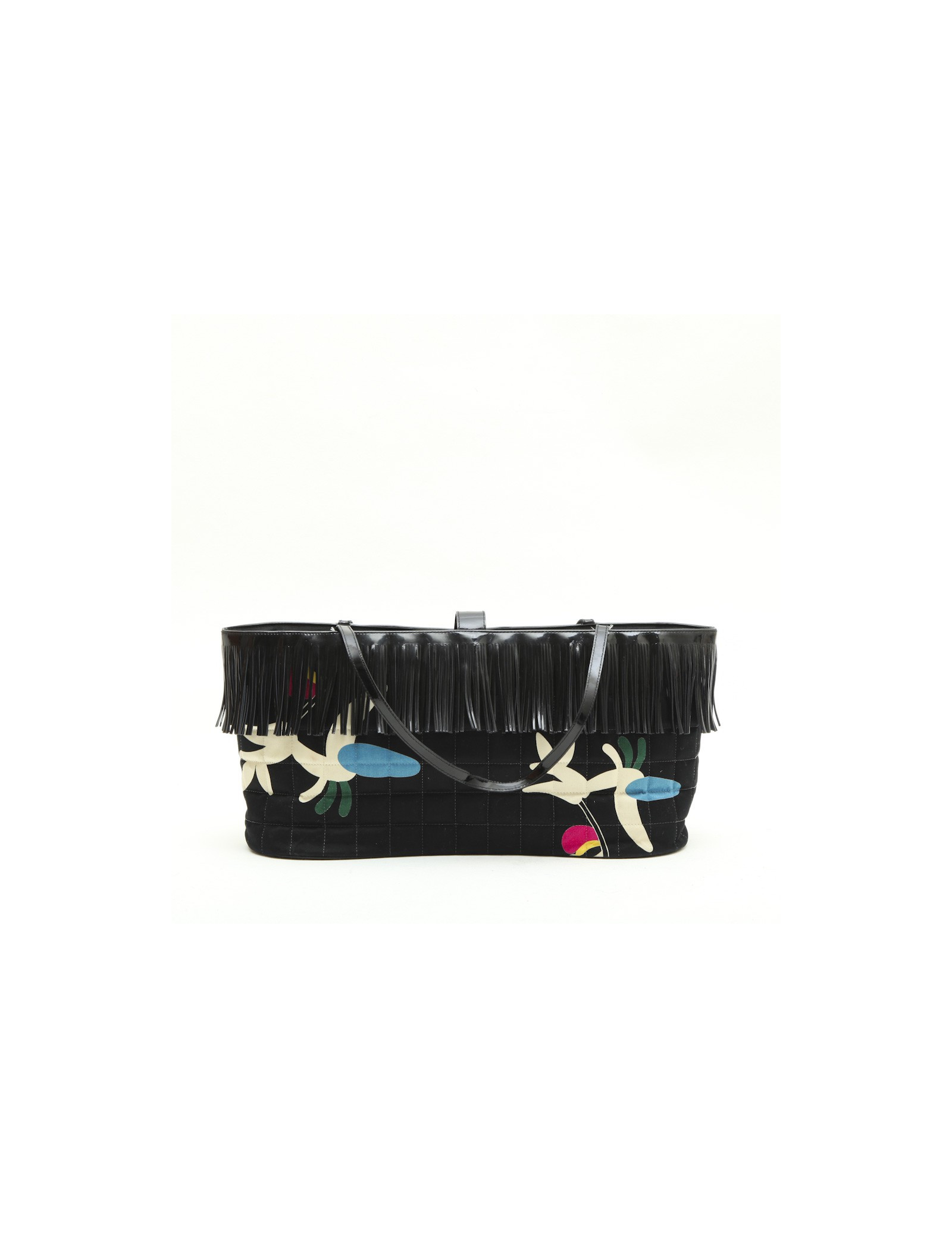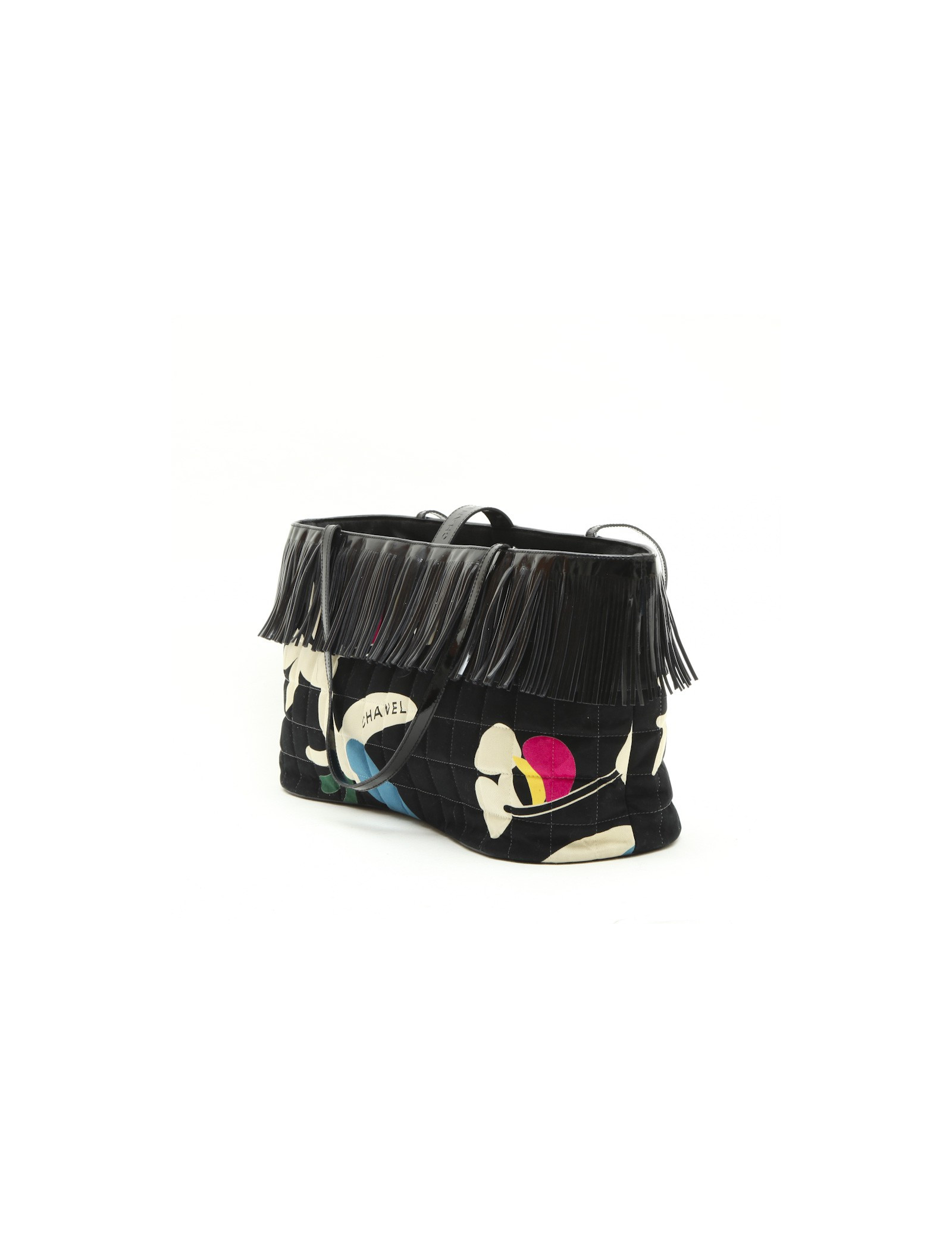 Sac Chanel à franges en toile matelassée multicolore. Collection été 2000. Les anses et les franges sont en cuir verni noir. L'intérieur est en toile noire.