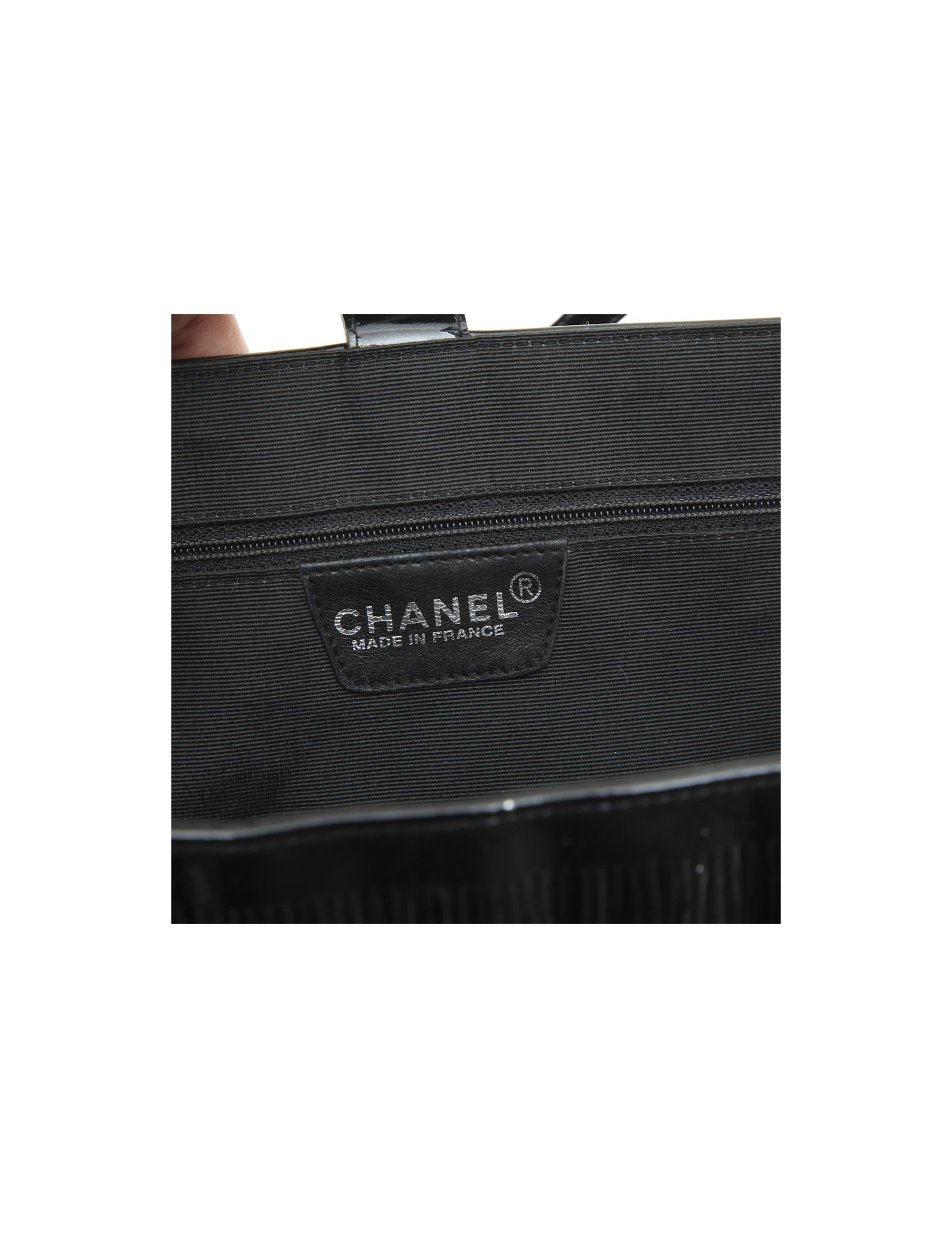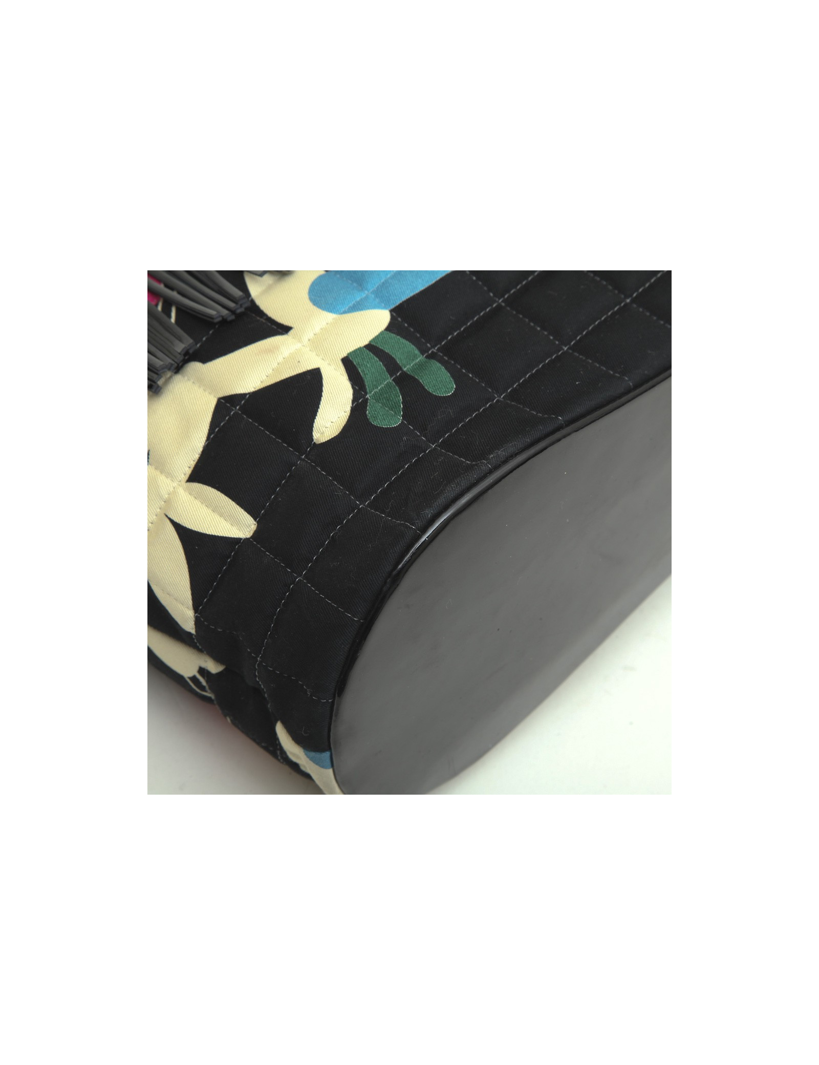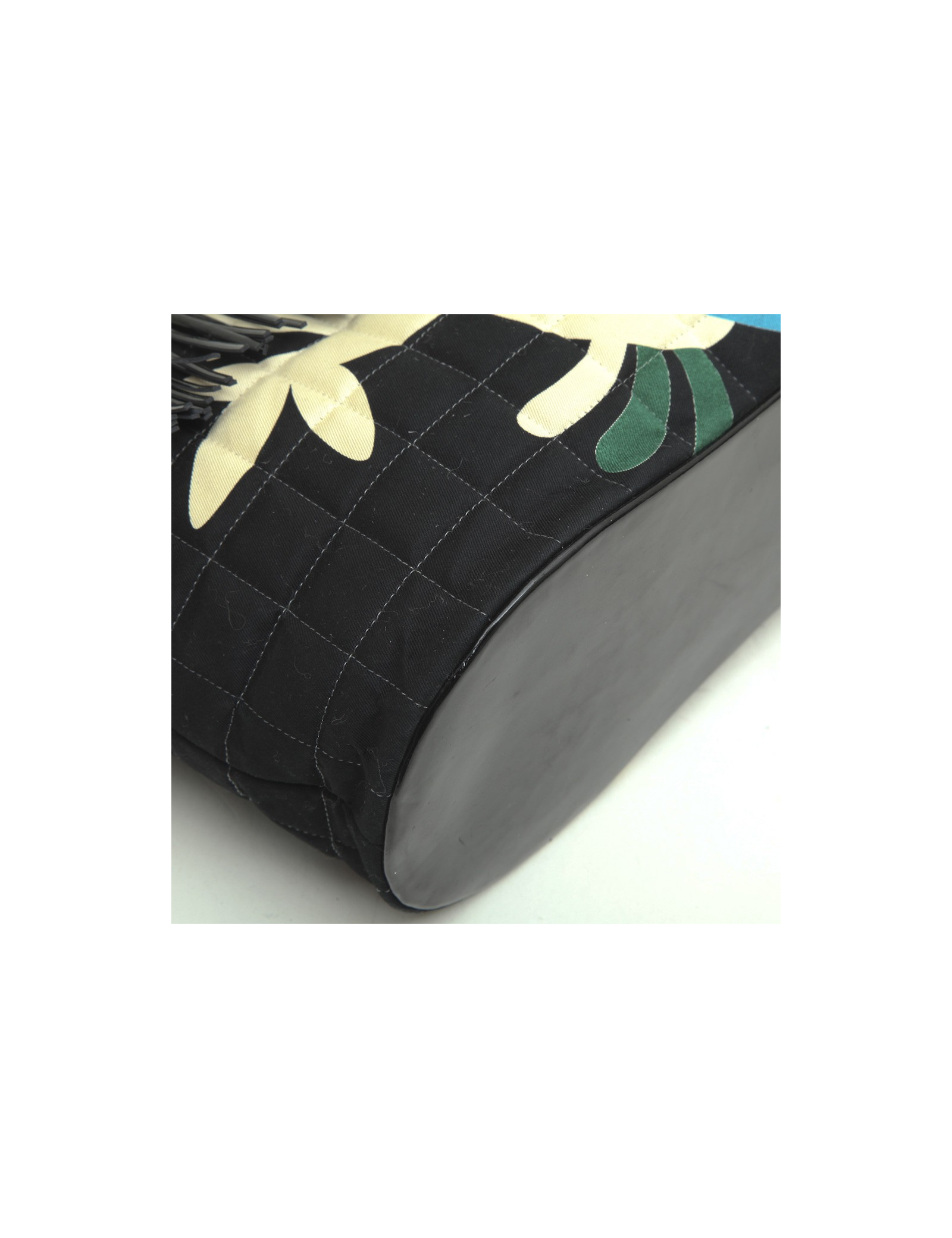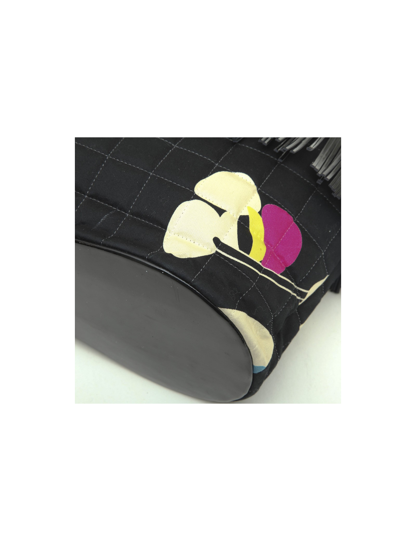 Sac Chanel à franges en toile matelassée multicolore. Collection été 2000. Les anses et les franges sont en cuir verni noir. L'intérieur est en toile noire.