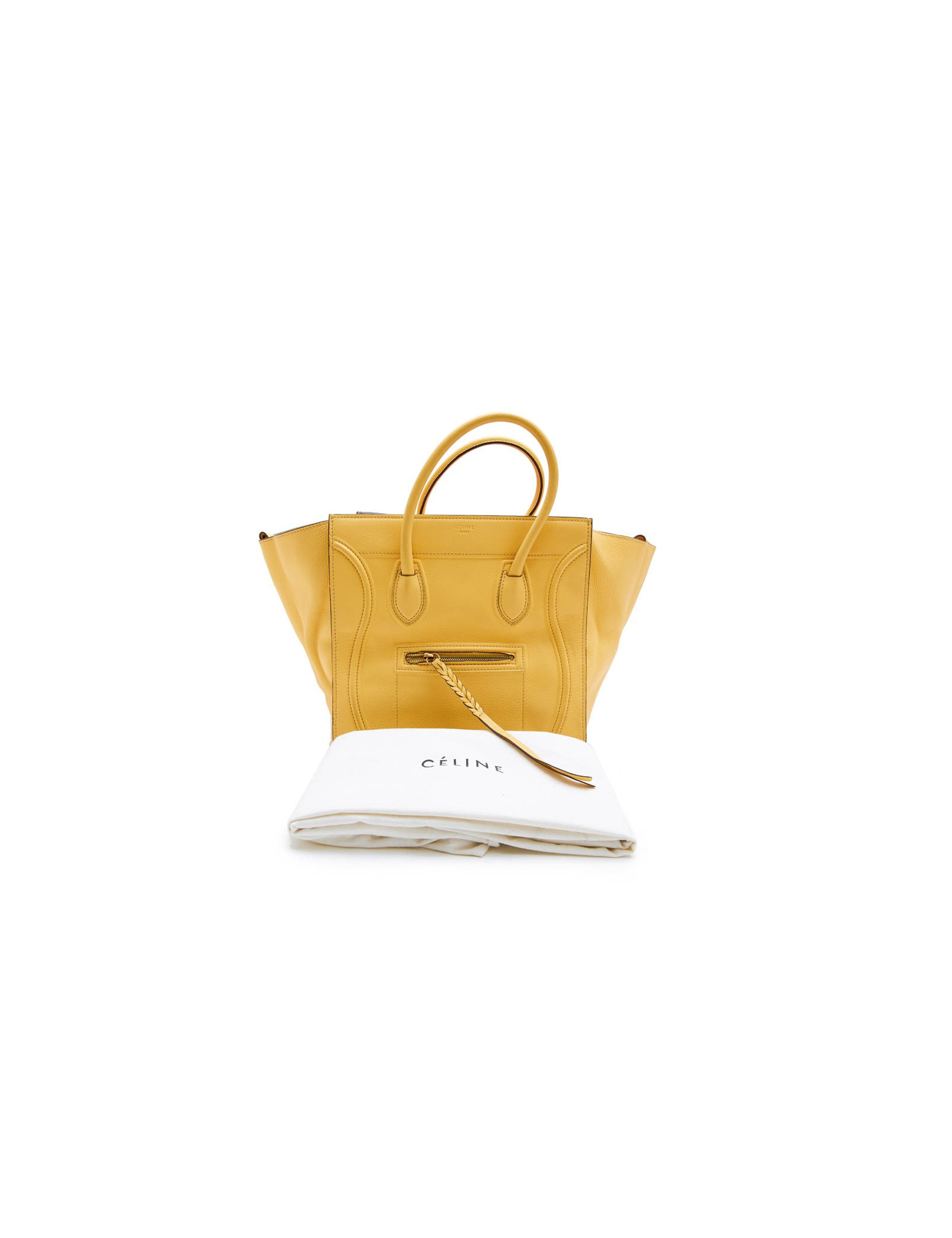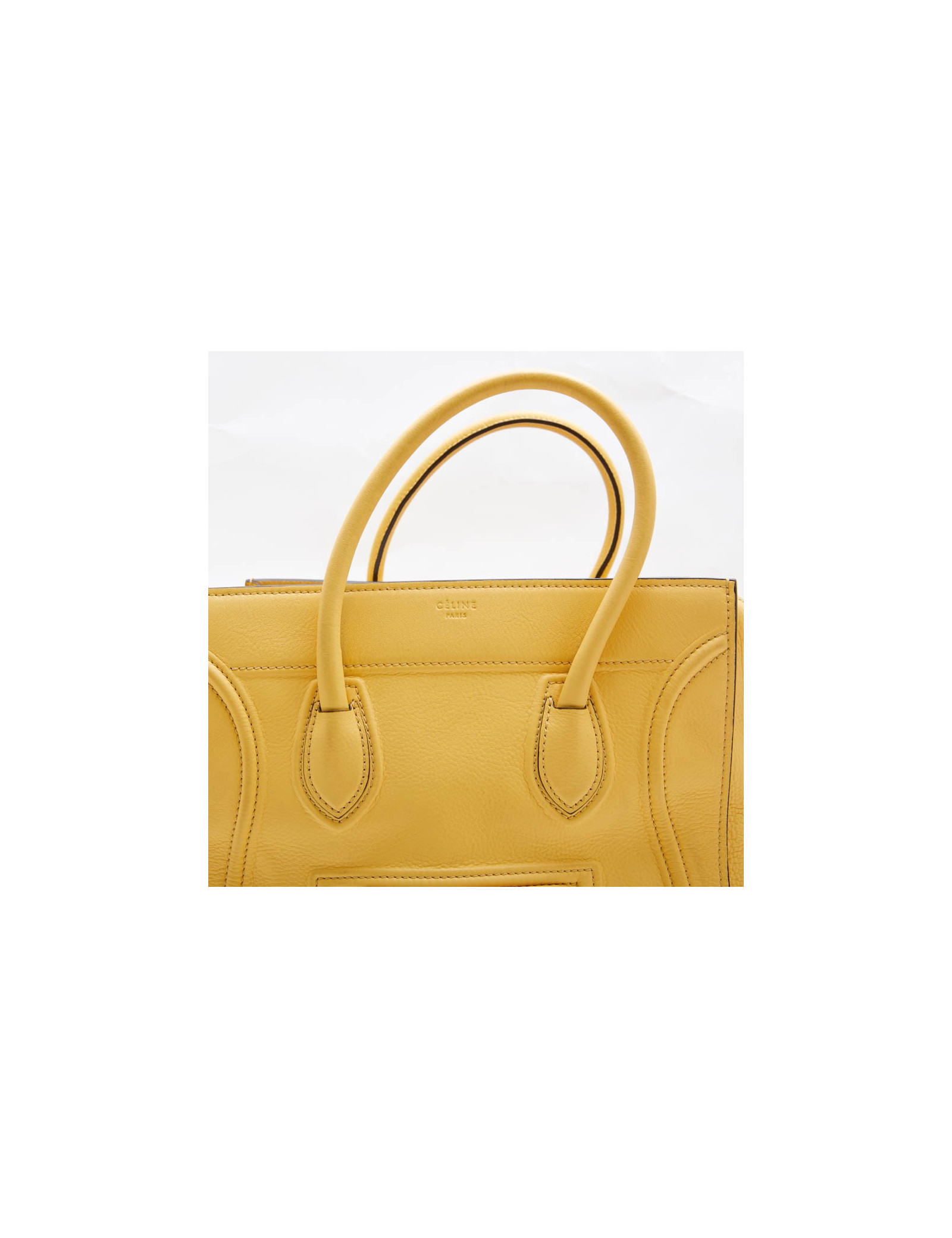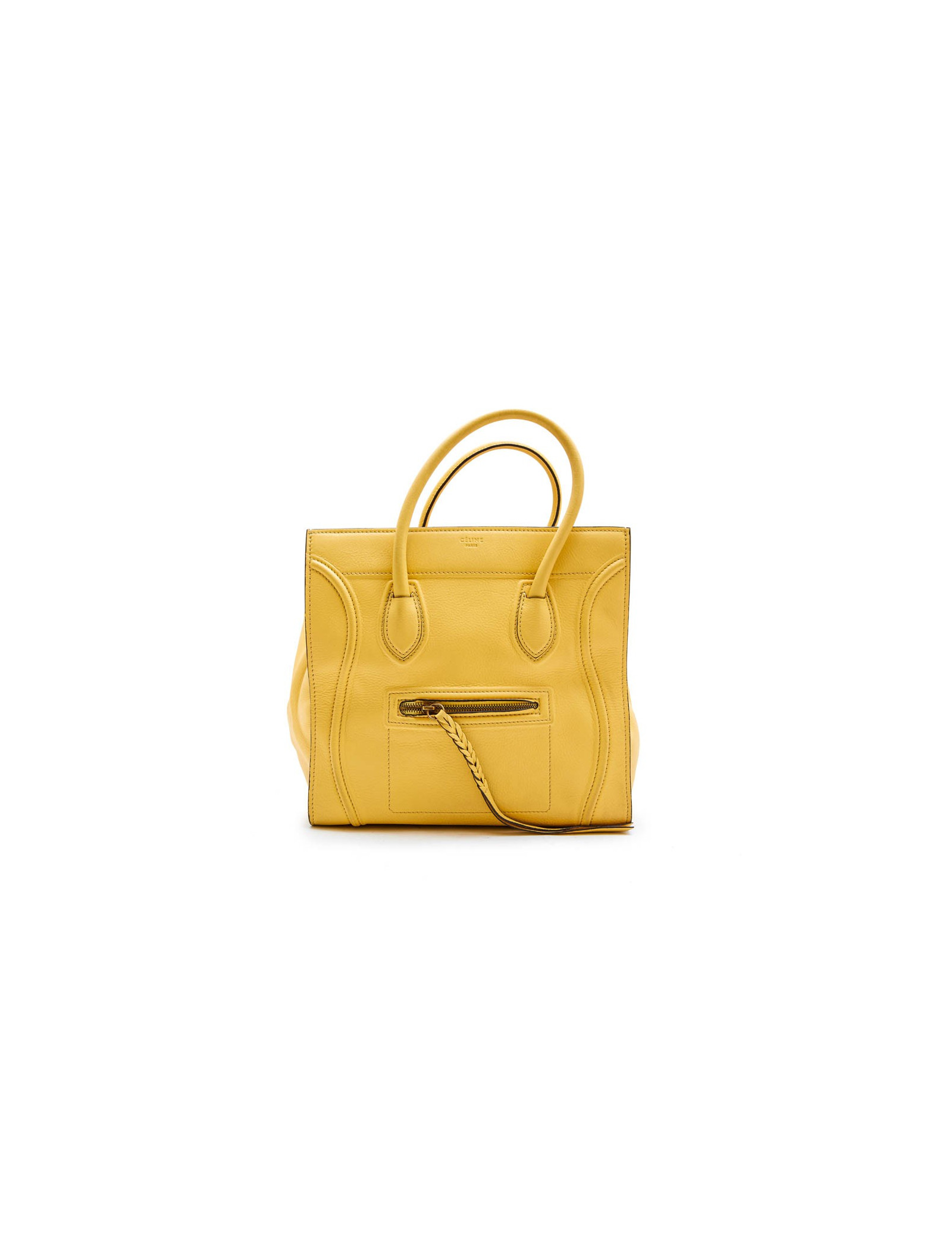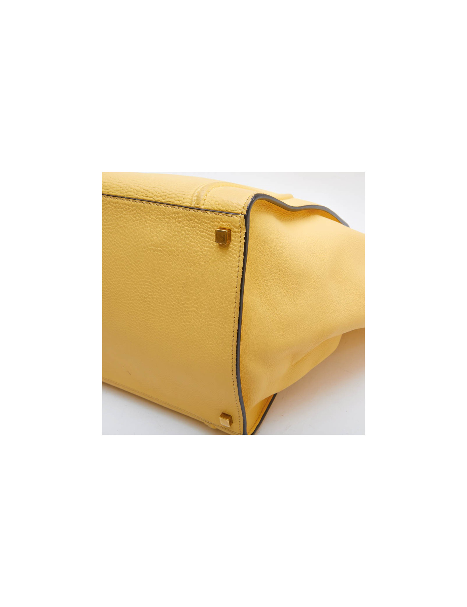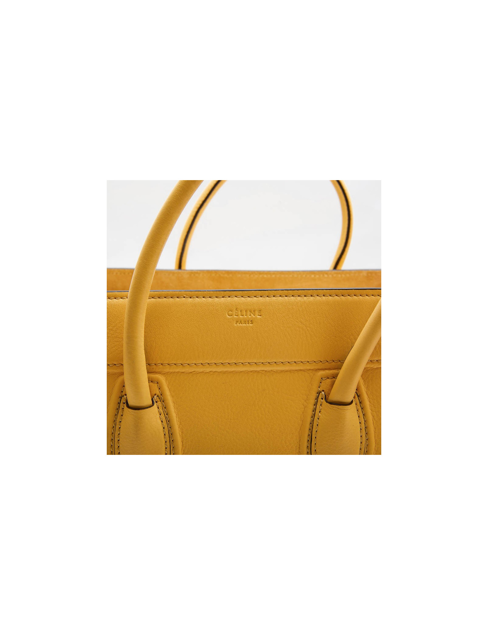Sac Luggage Celine MINI en cuir grainé jaune. Bijouterie métal doré. L'intérieur est en cuir jaune.  Une poche zippée à l'intérieur et une à l'extérieur. Porté main. Numéro de série: U-CU-0133.