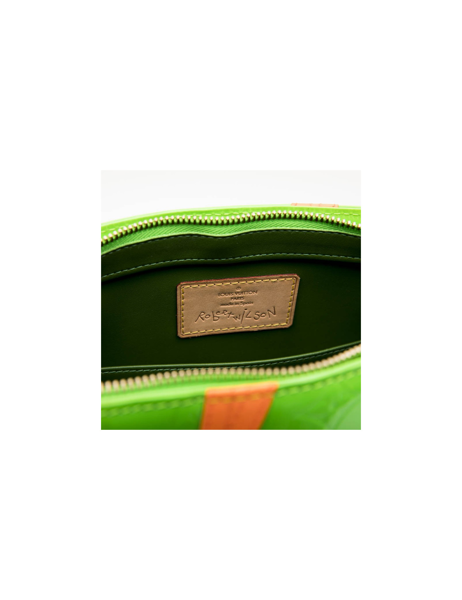 Ce sac Houston de la Maison Louis Vuitton est en cuir verni Monogram vert fluo. C'est une série Limitée créée par Robert Wilson. La bijouterie est en laiton dorée. Il a une fermeture zippée. Les finitions sont en cuir de vache naturel.