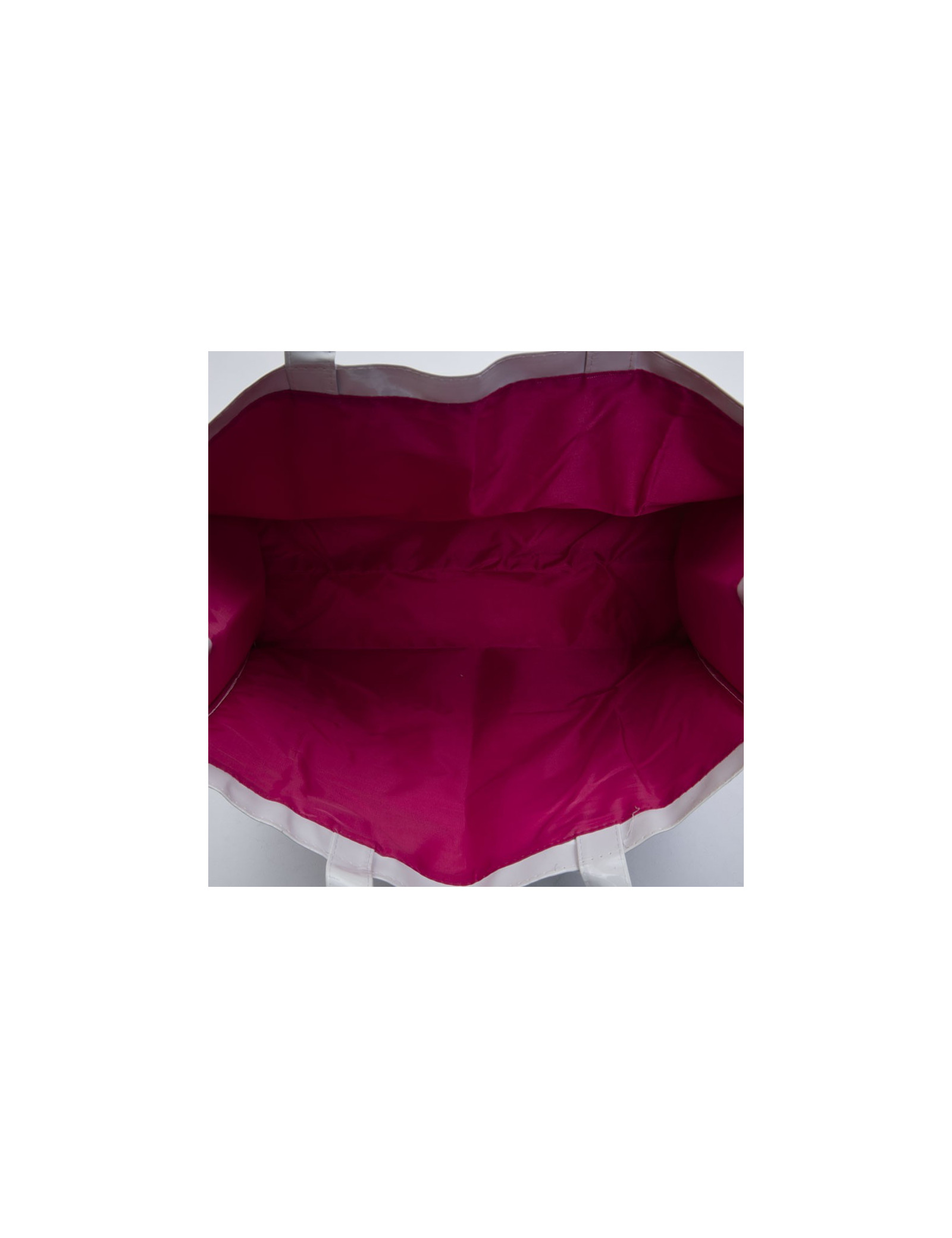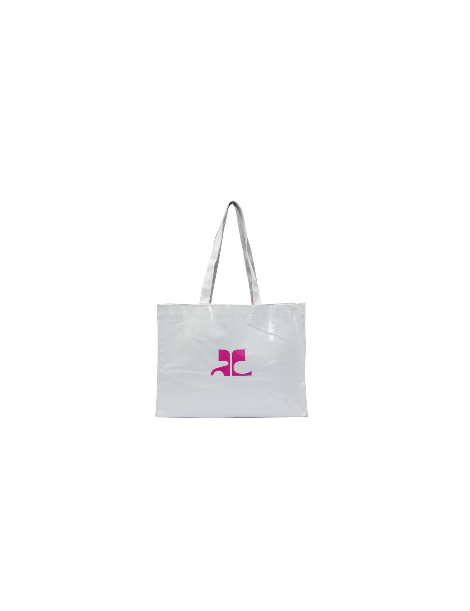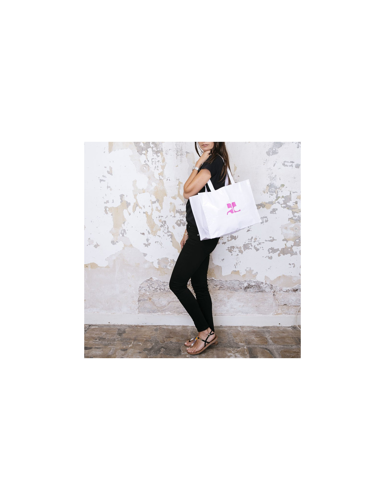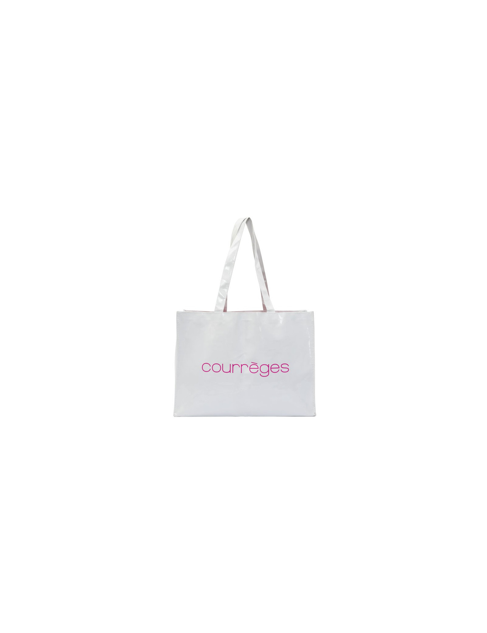 Sac cabas Courrèges en toile vernie blanche. Signature Courrèges rose fushia. Doublure intérieure en toile rose.