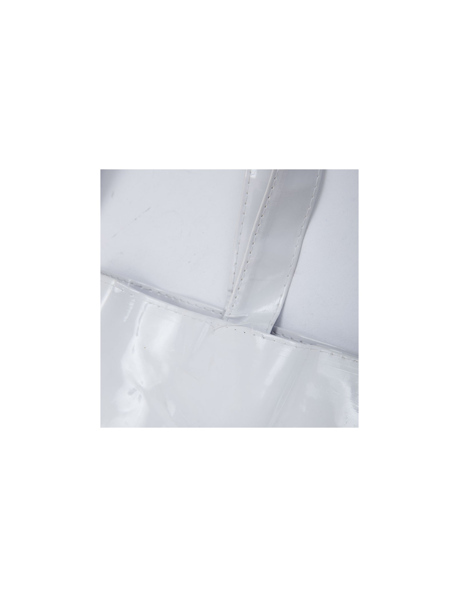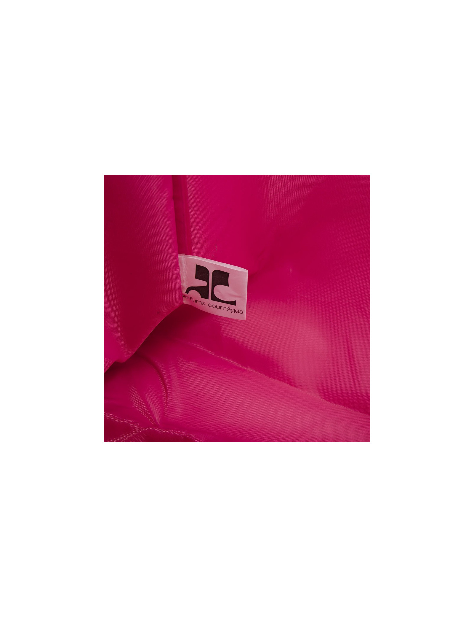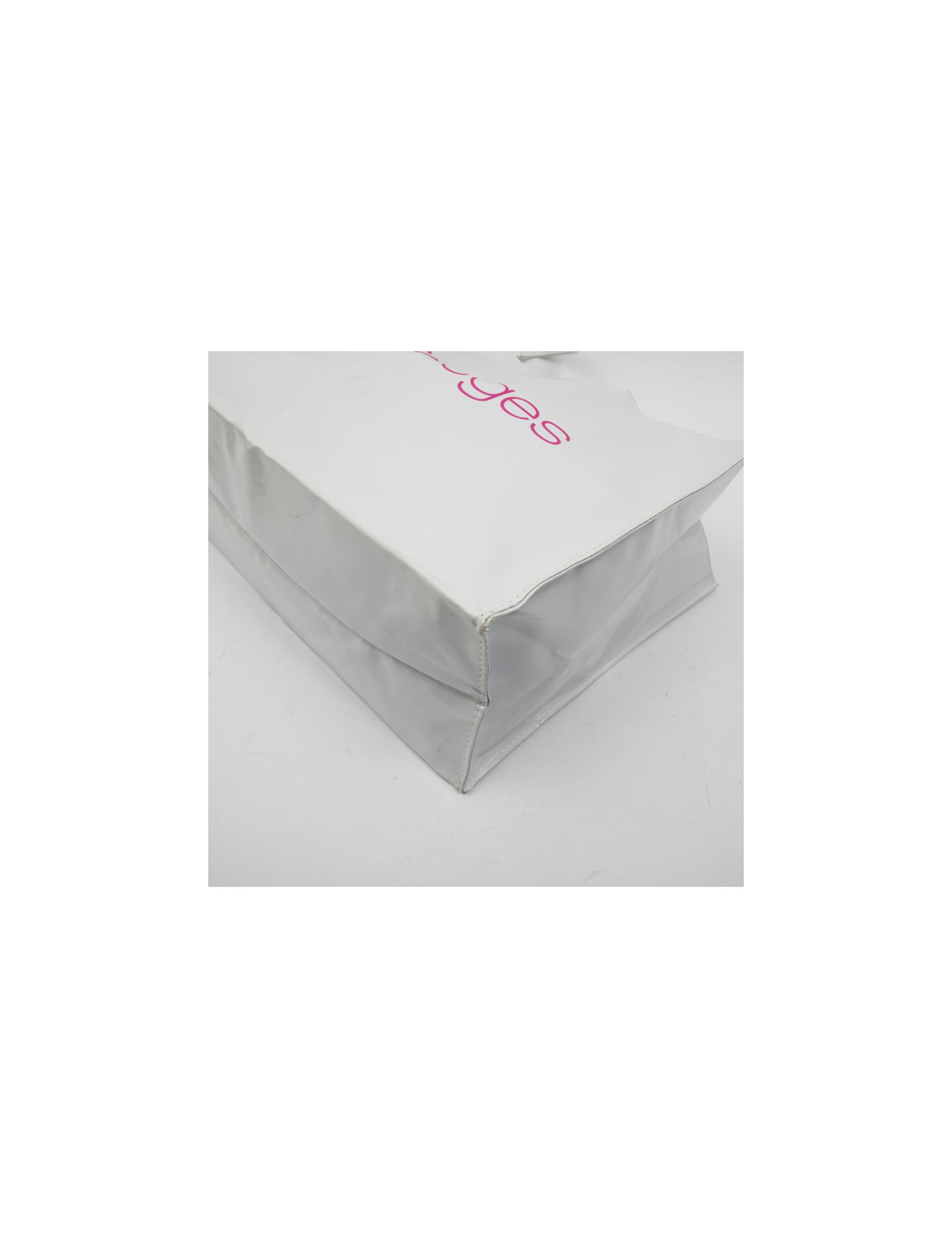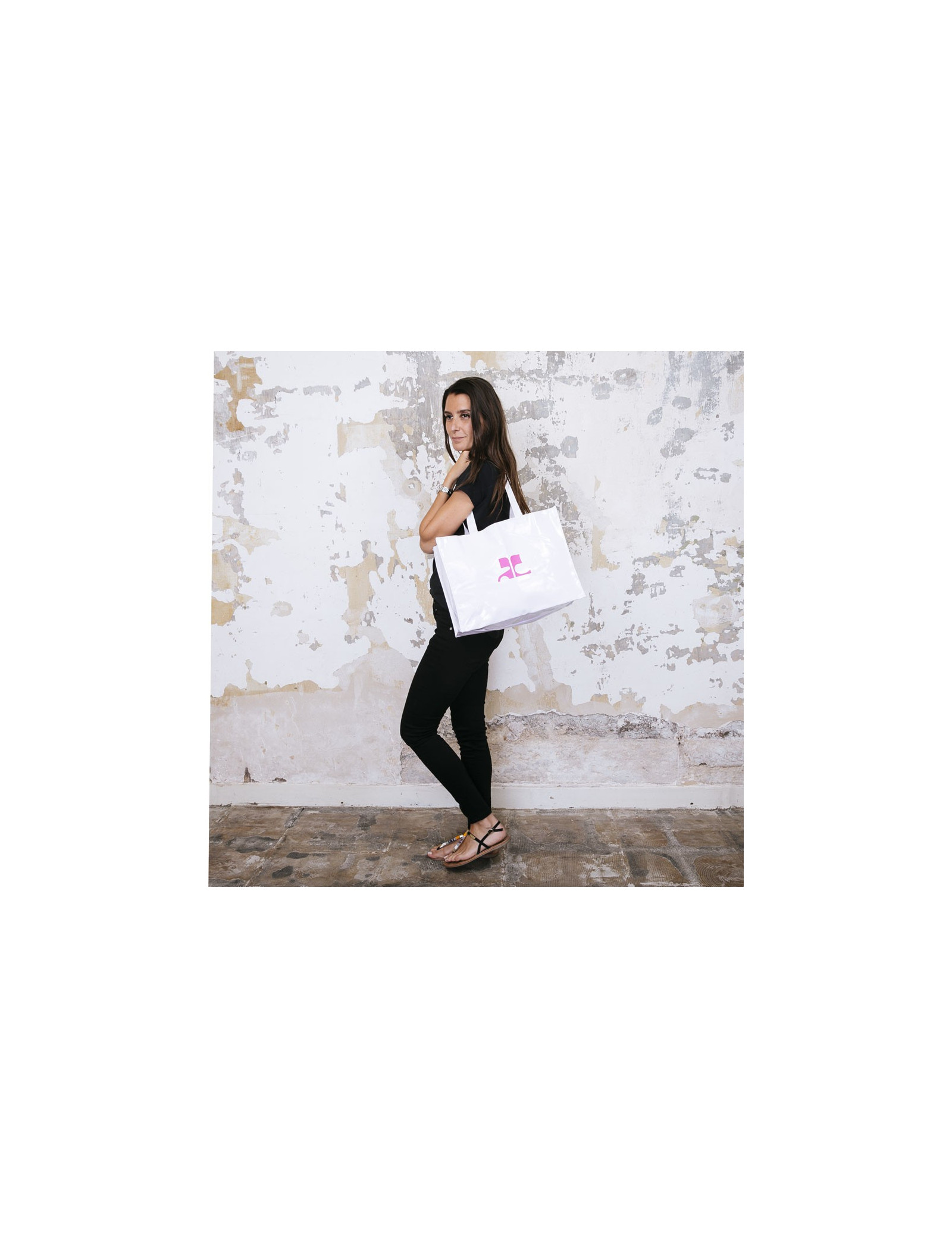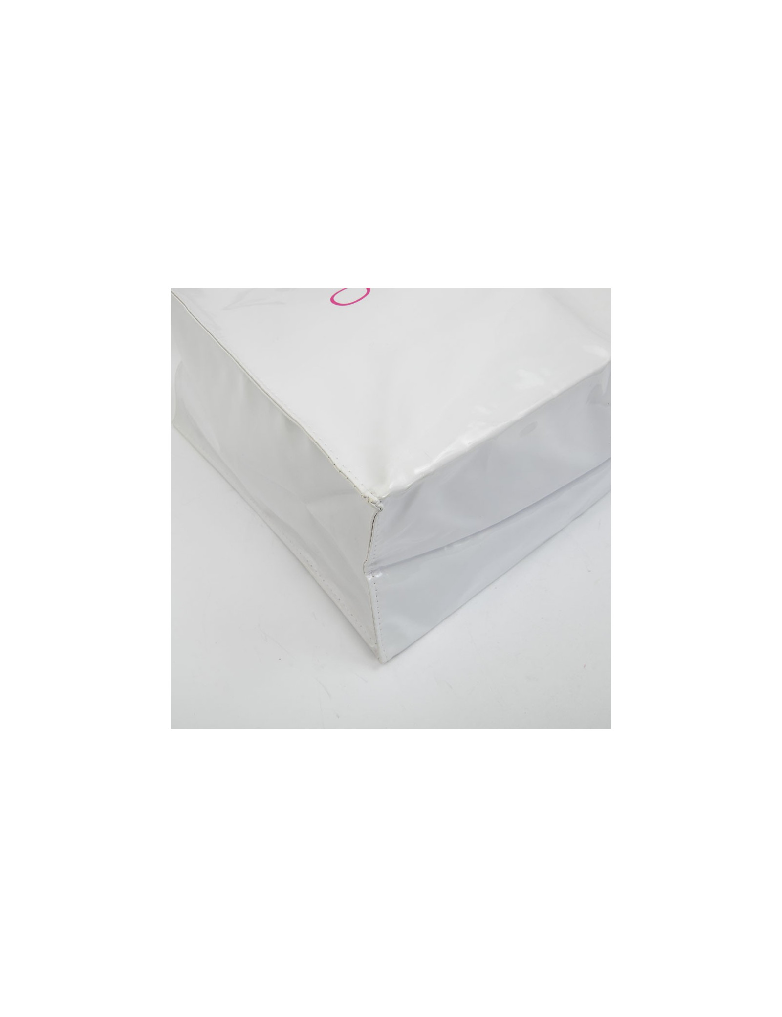 Sac cabas Courrèges en toile vernie blanche. Signature Courrèges rose fushia. Doublure intérieure en toile rose.