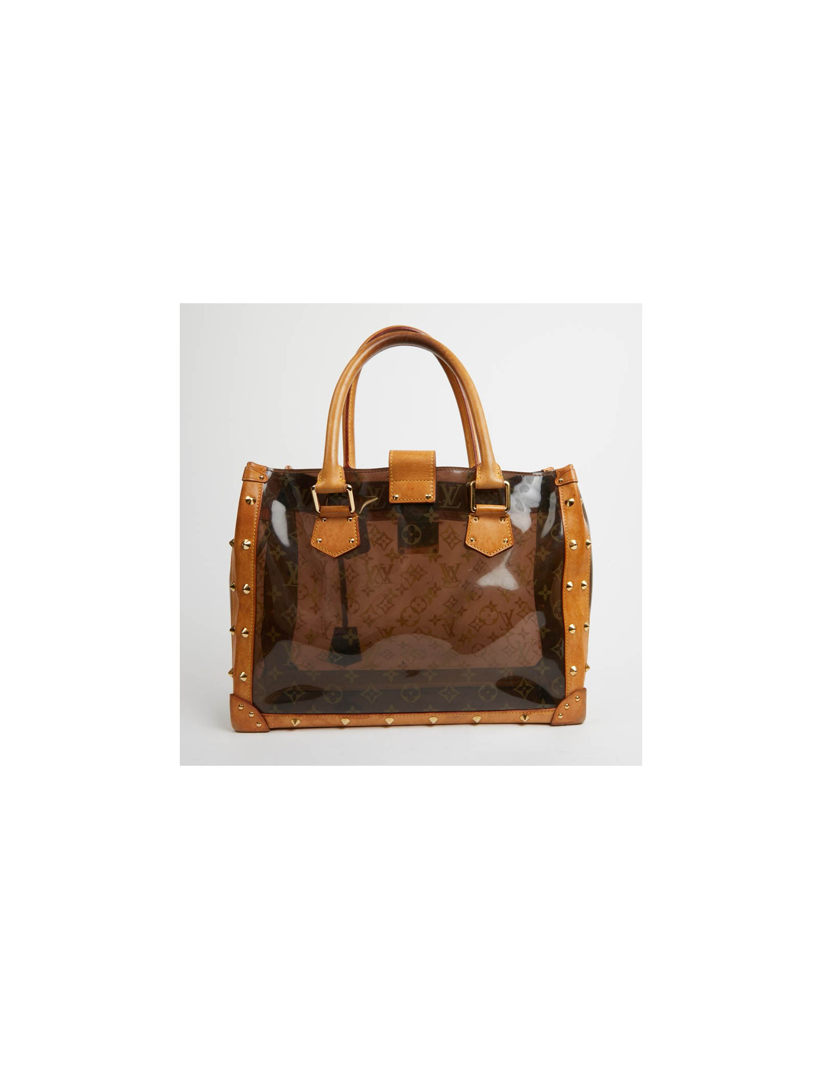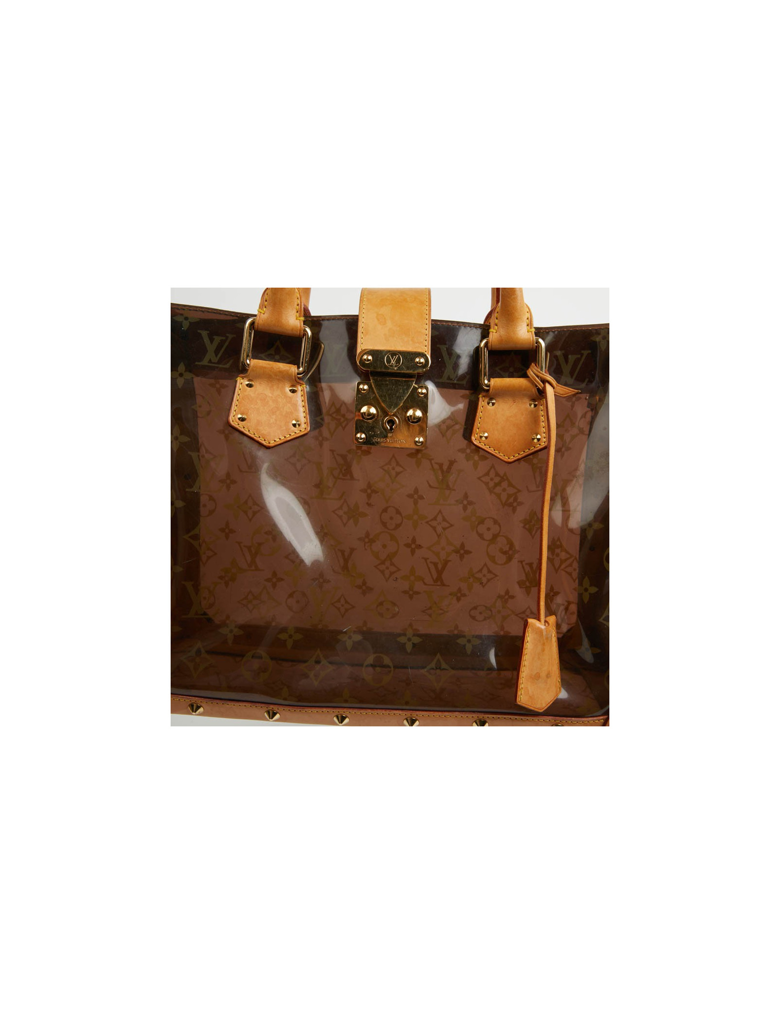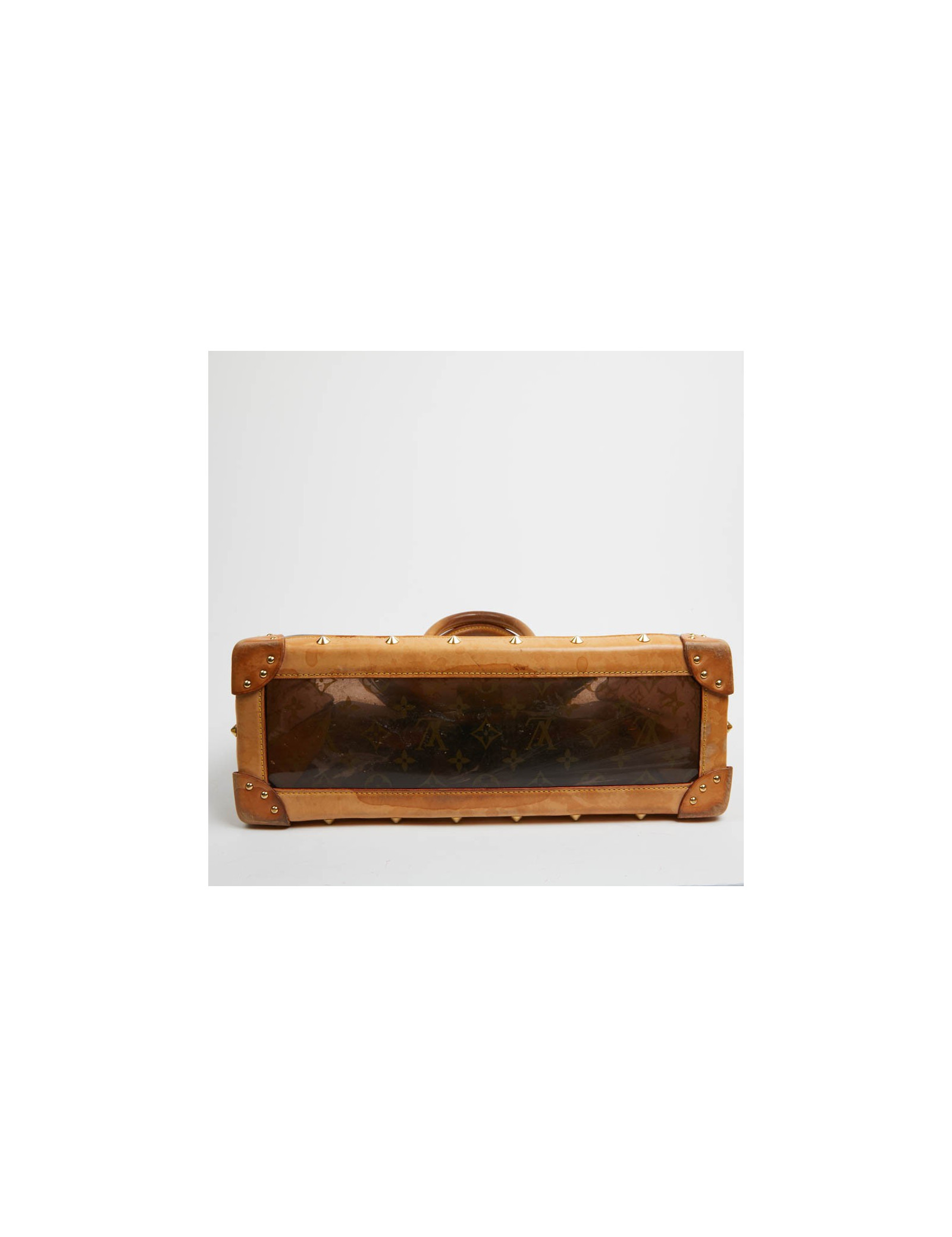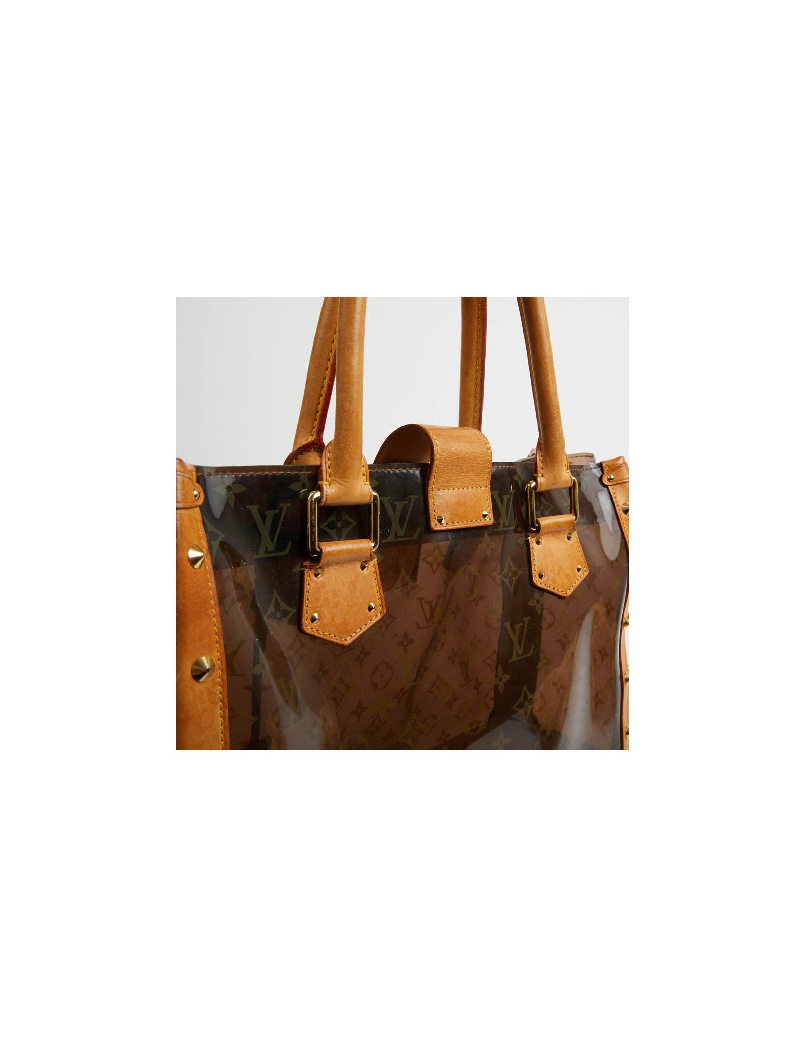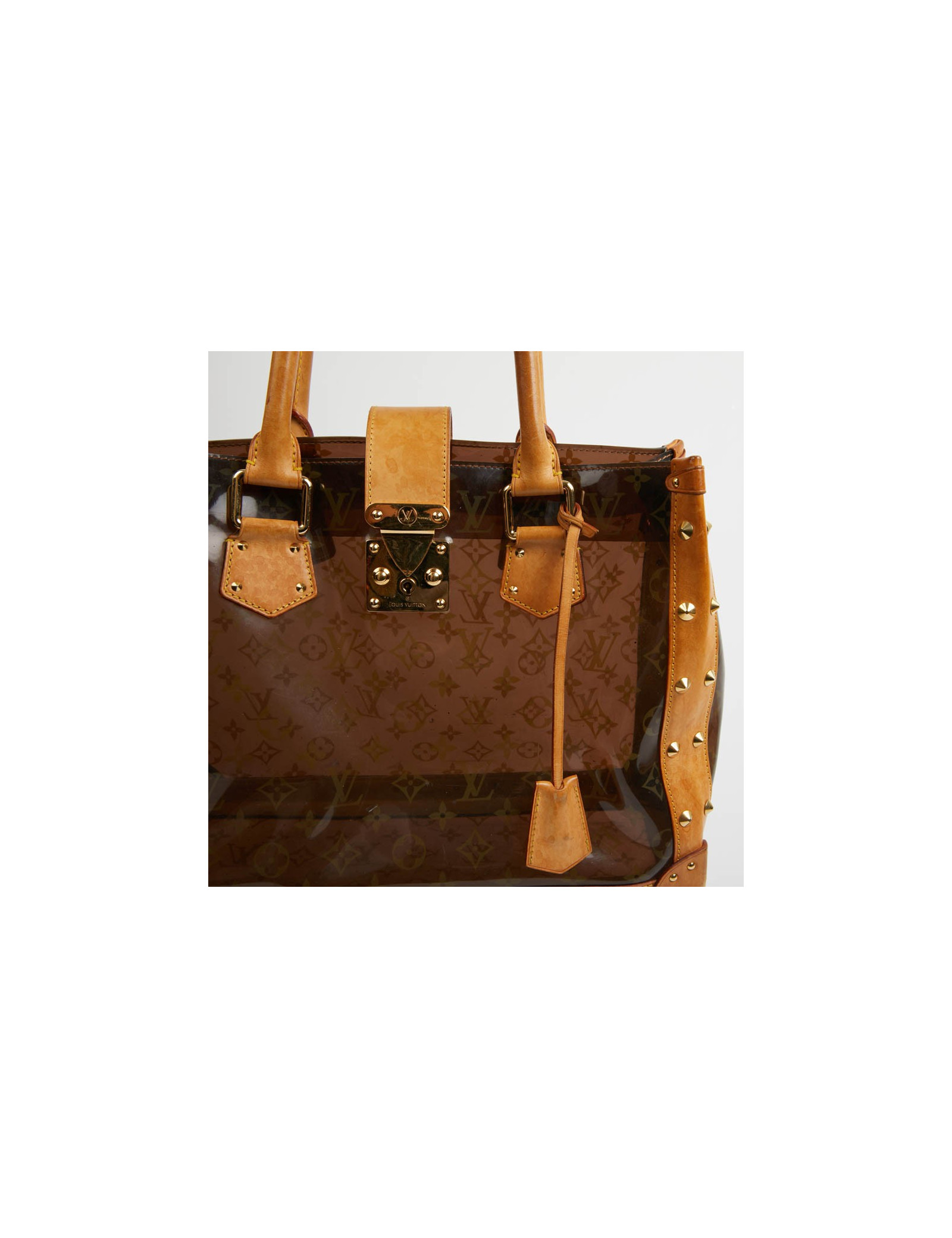Pièce rare. Cette édition limitée Croisière Ambre Néo, de la Maison VUITTON allie originalité et savoir faire. Les détails nous rappellent les malles de la Maison, avec les rivets cloutés, le fermoir estampillé, la clochette et sa clé. Le sac cabas est en vynil Monogram transparent et cuir. La bijouterie est dorée.