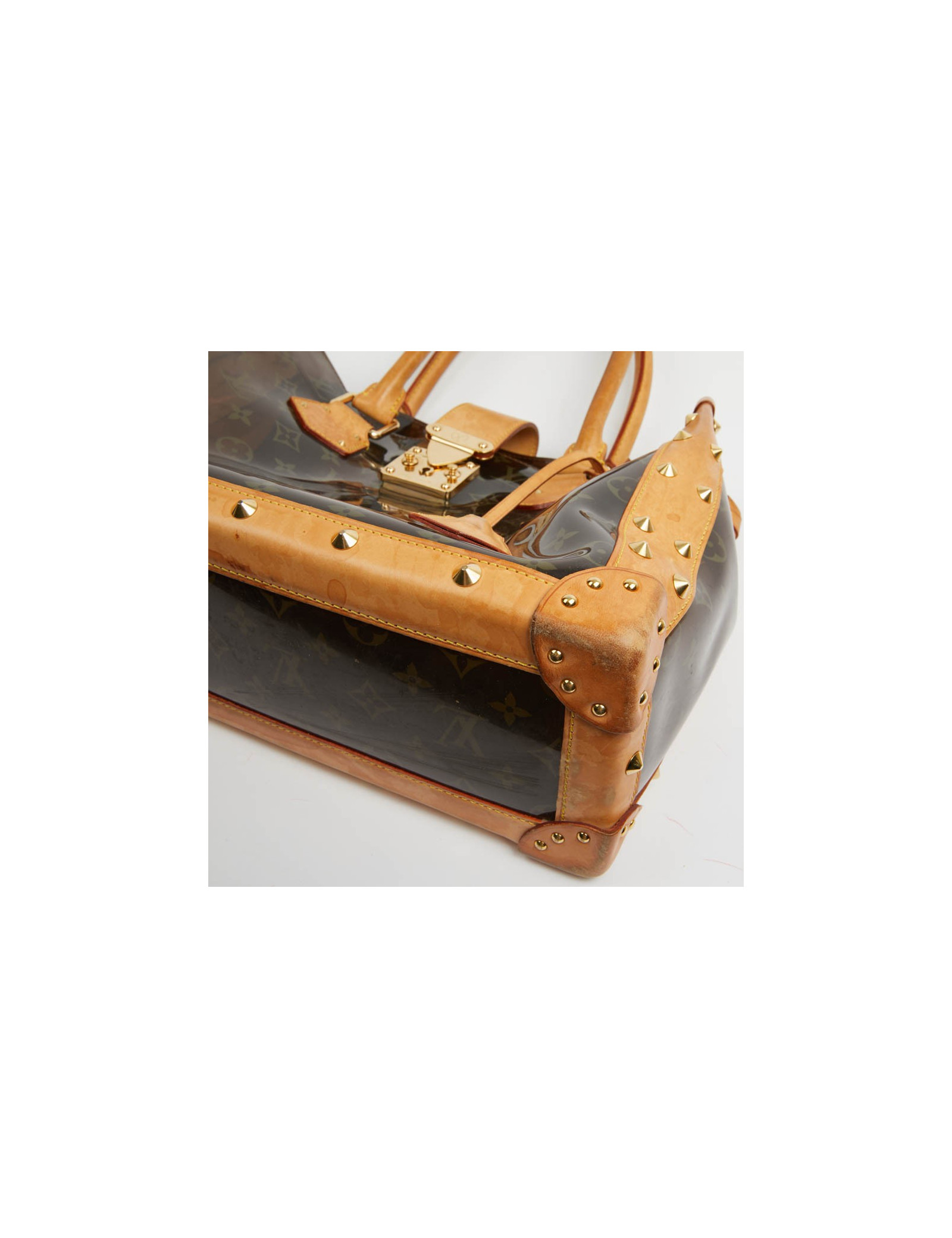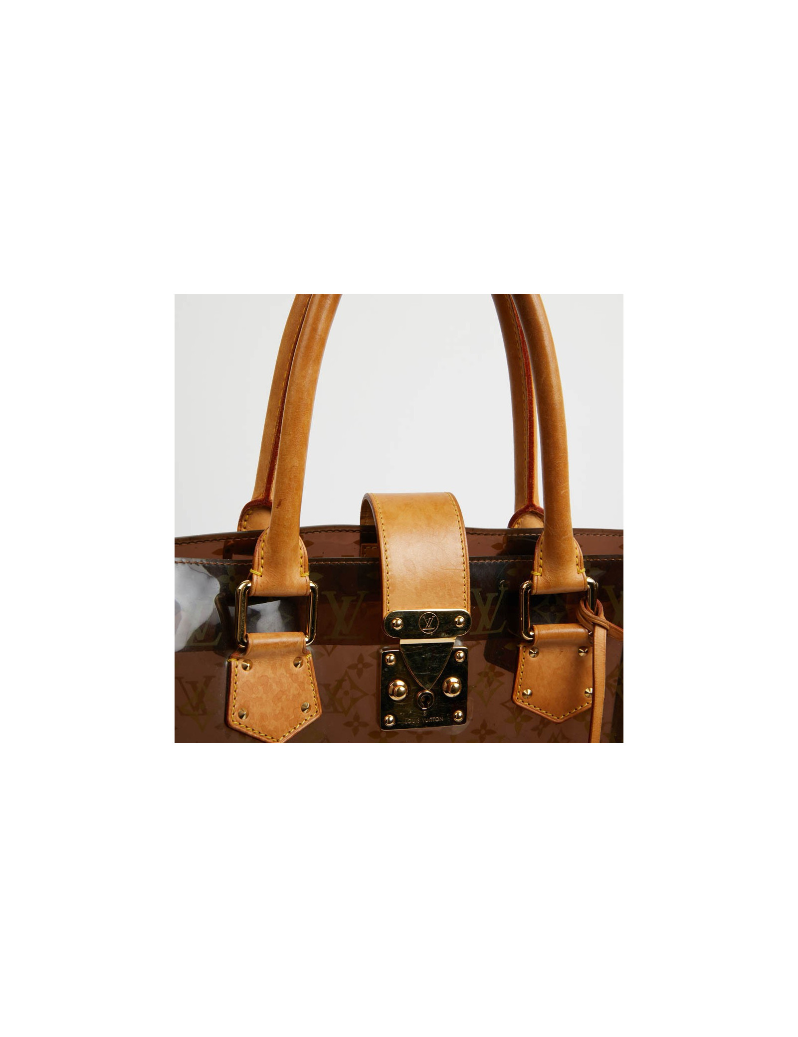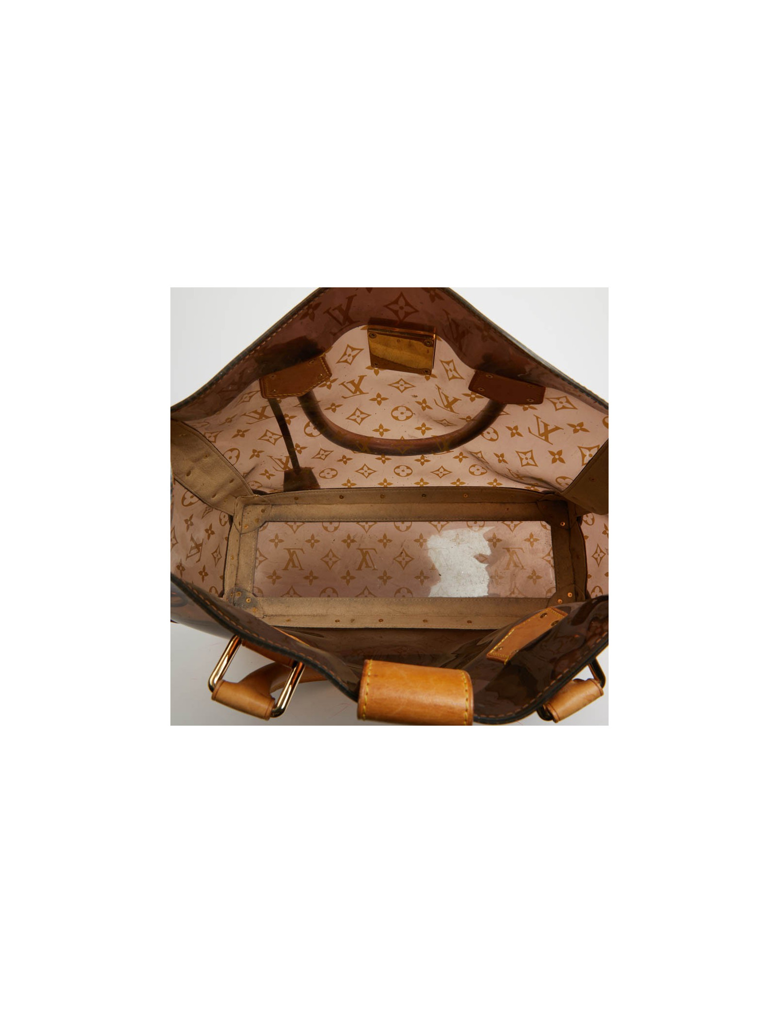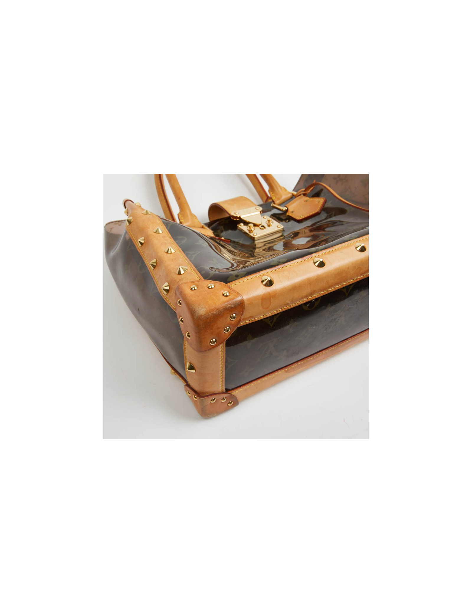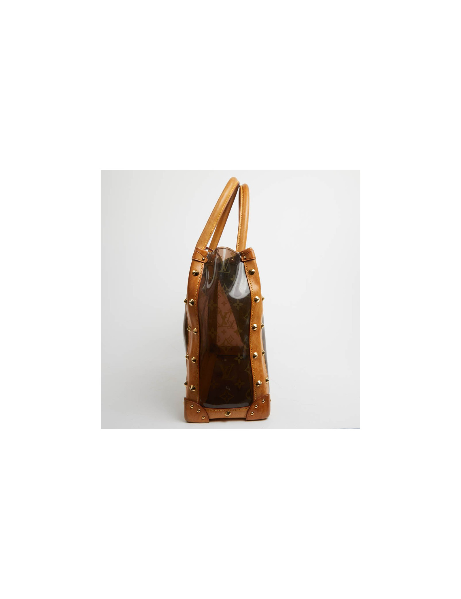Pièce rare. Cette édition limitée Croisière Ambre Néo, de la Maison VUITTON allie originalité et savoir faire. Les détails nous rappellent les malles de la Maison, avec les rivets cloutés, le fermoir estampillé, la clochette et sa clé. Le sac cabas est en vynil Monogram transparent et cuir. La bijouterie est dorée.