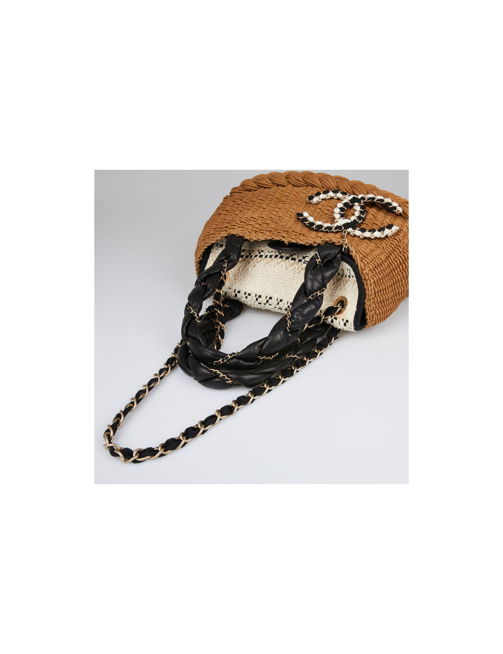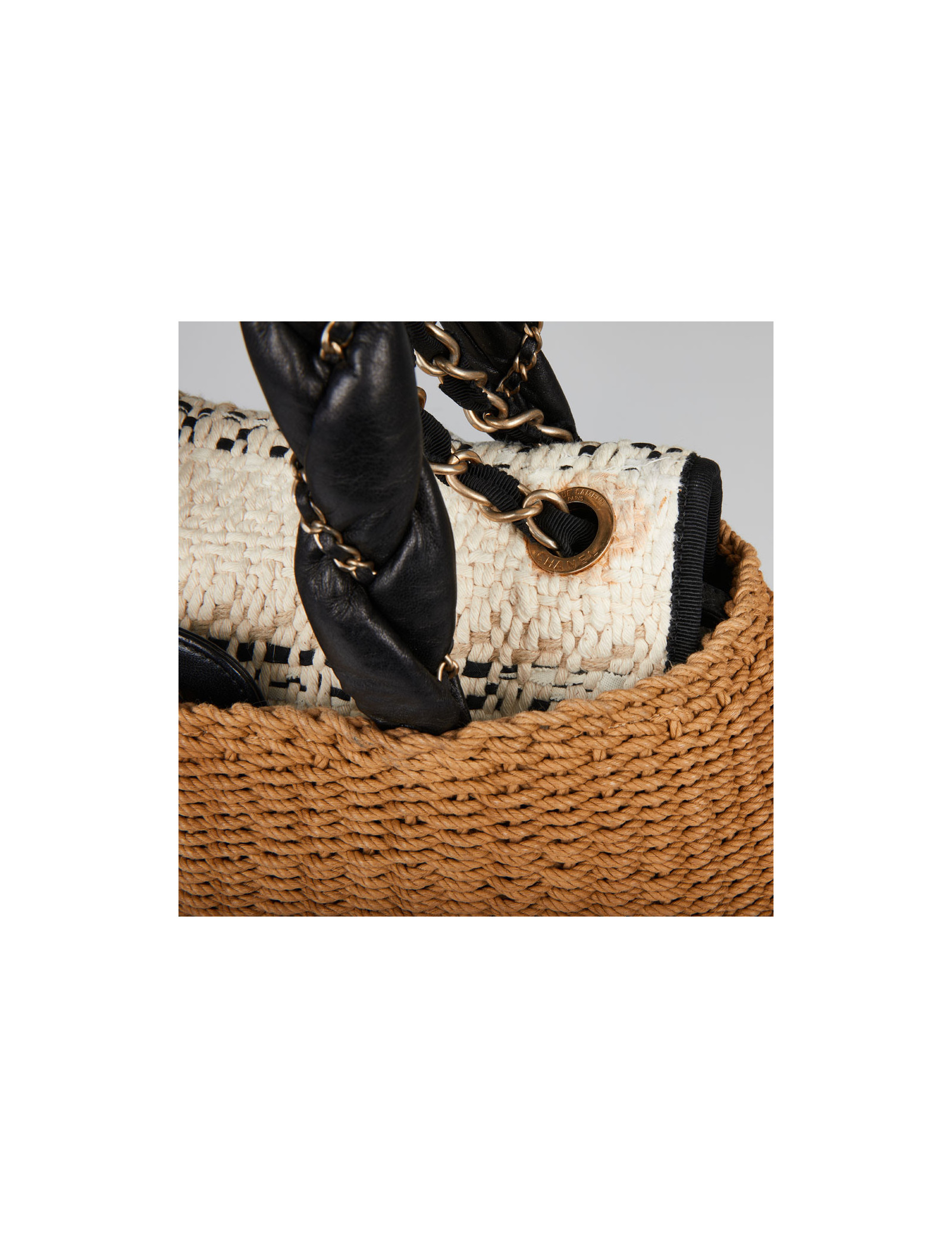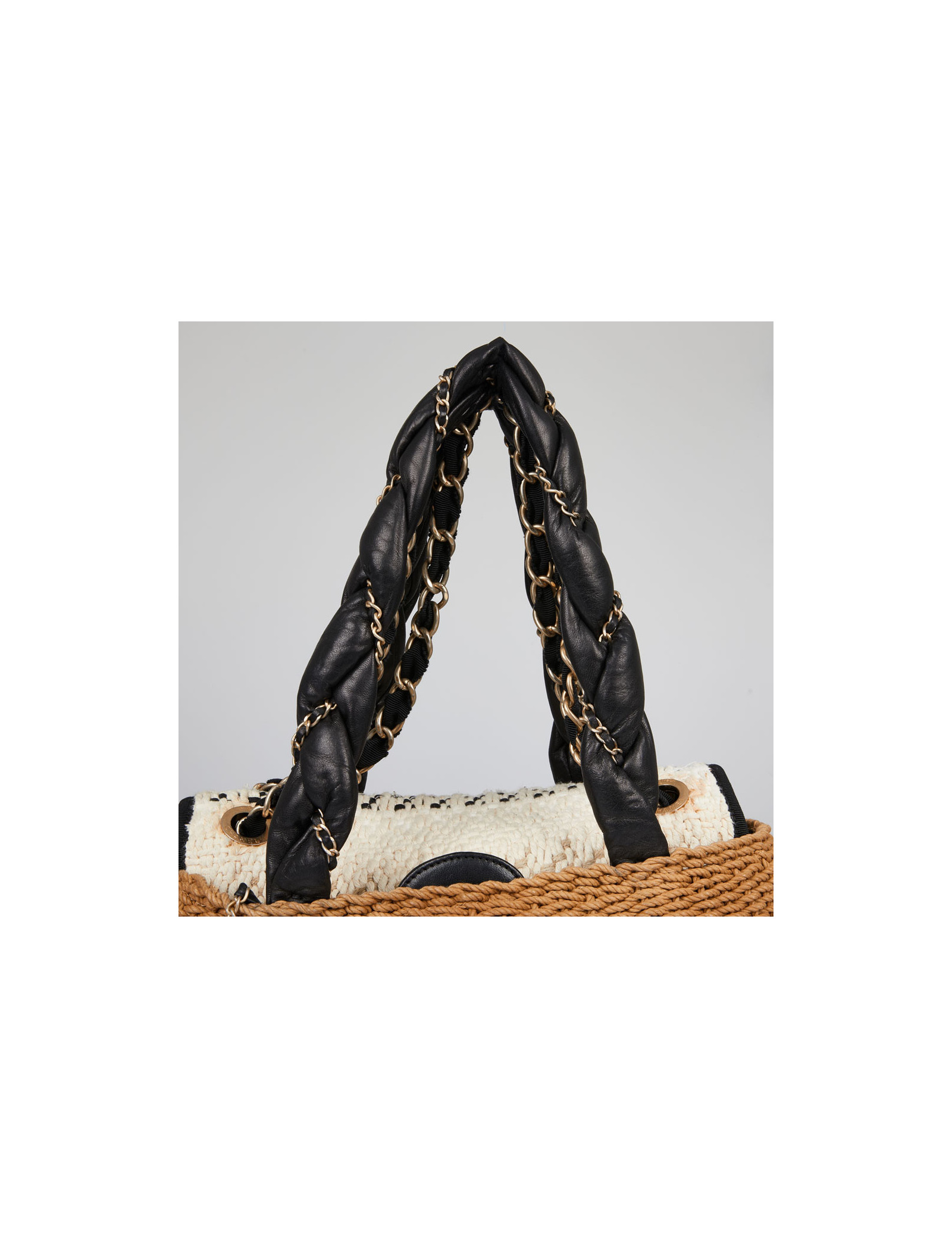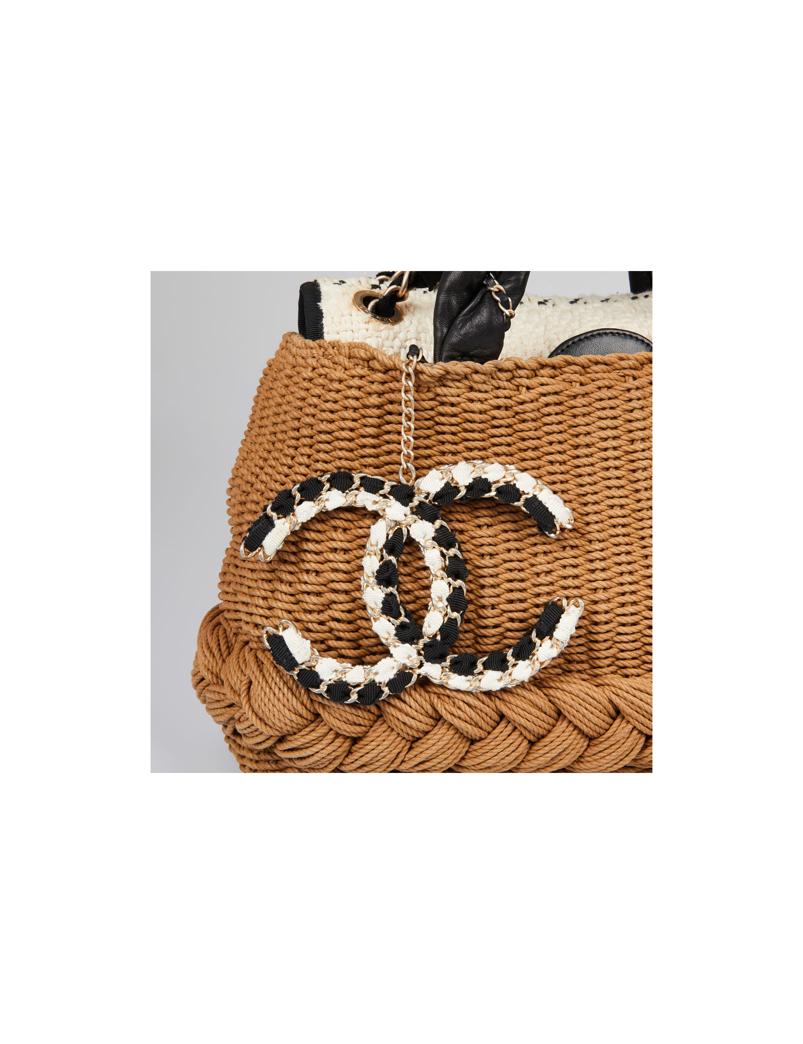 Détails : Sac panier en corde nattée et tressée, rabat en coton effet tweed, anses en cuir et gros bijou CC pendant. Le tweed présente une petite auréole jaune autour des 2 œillets du rabat mais le sac est en très bon état général.