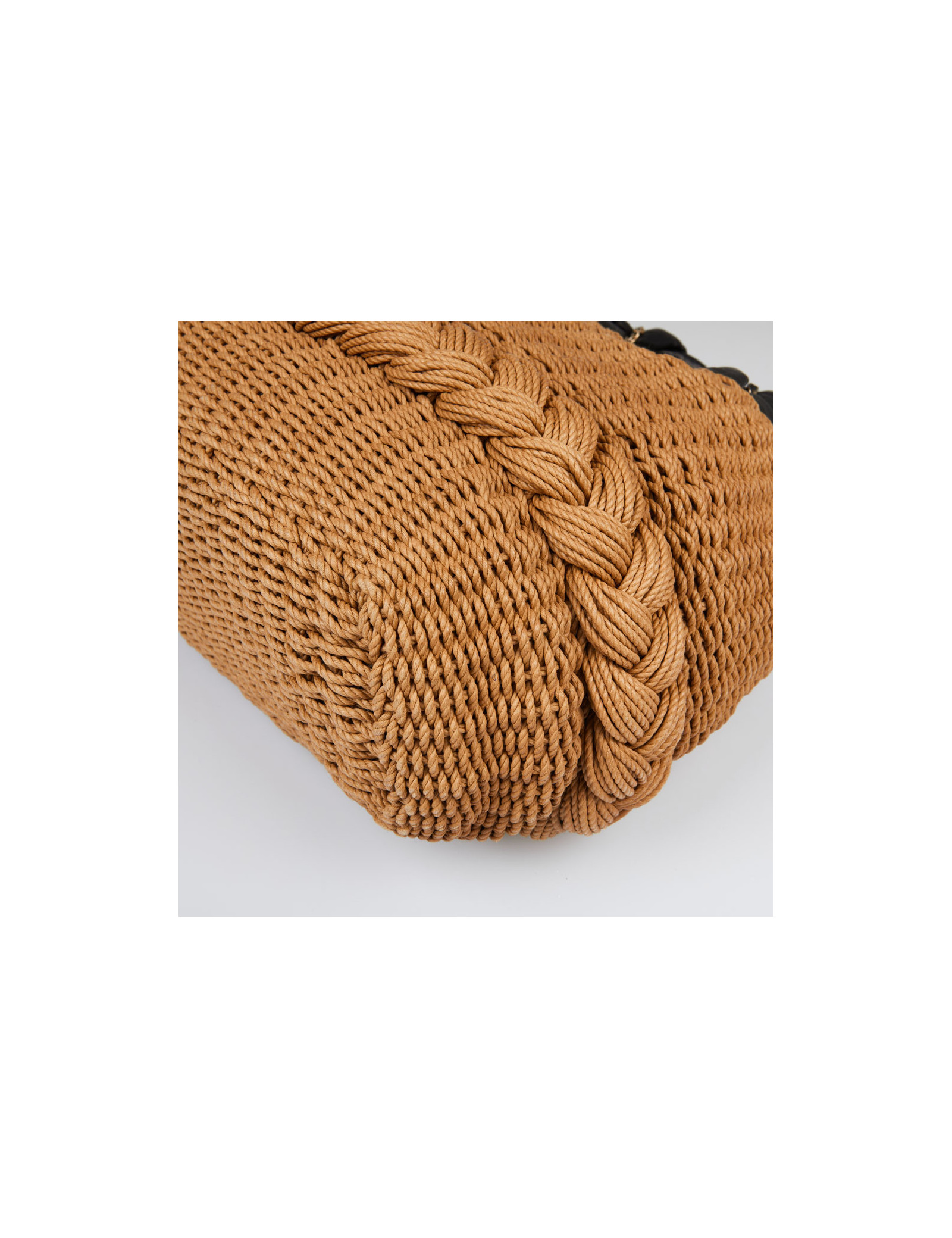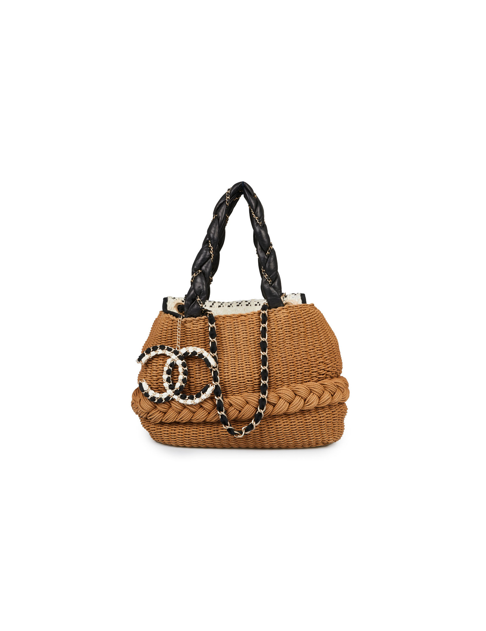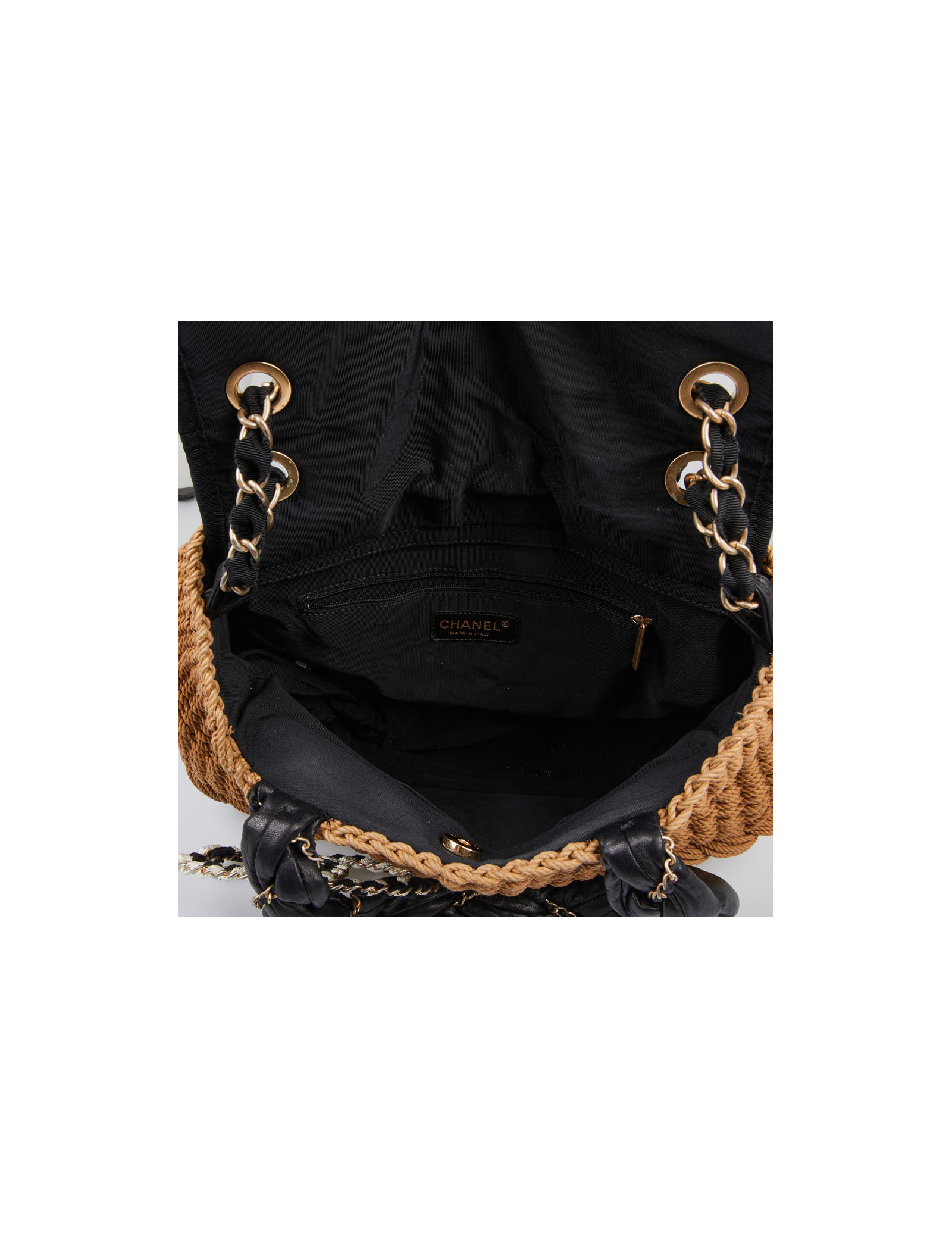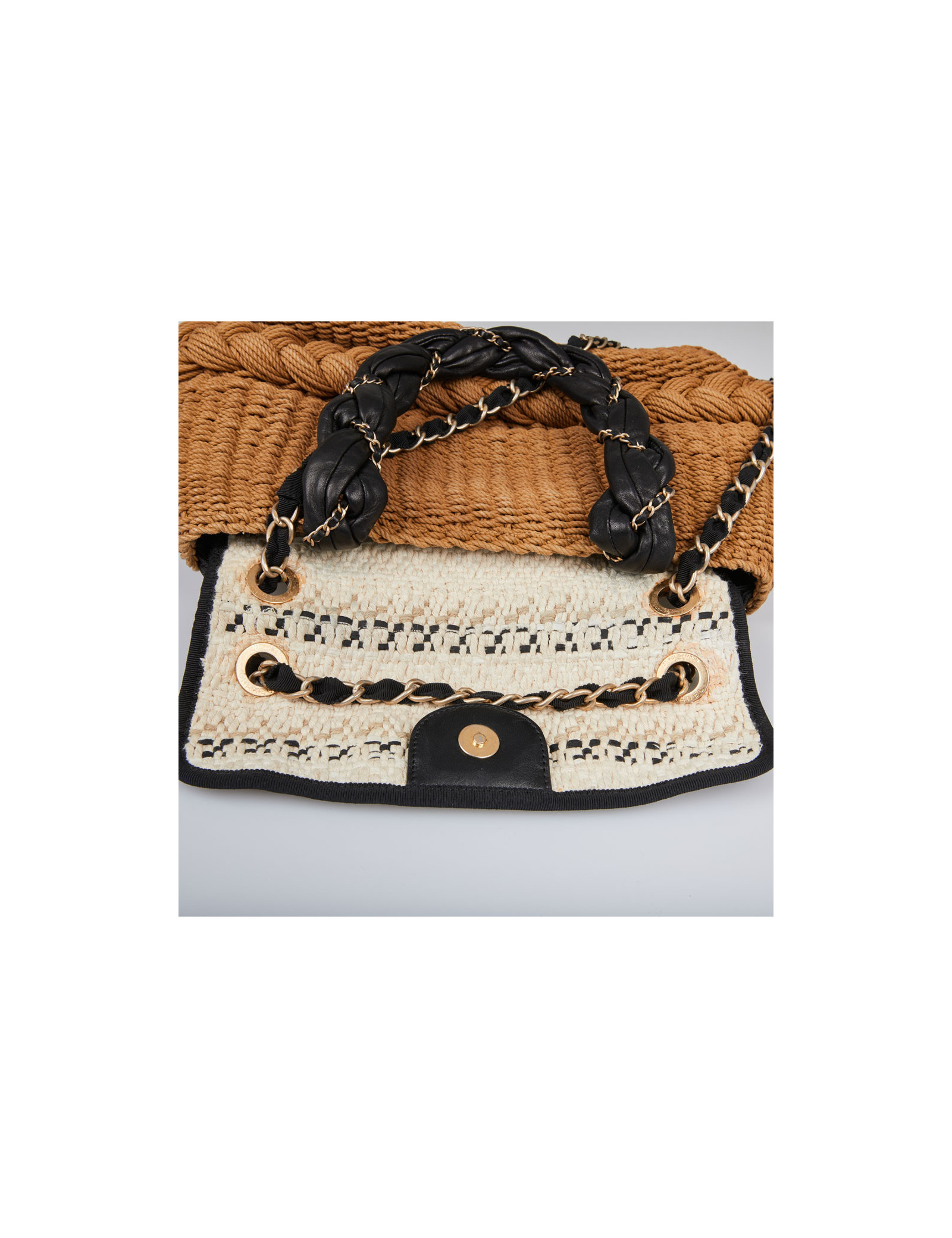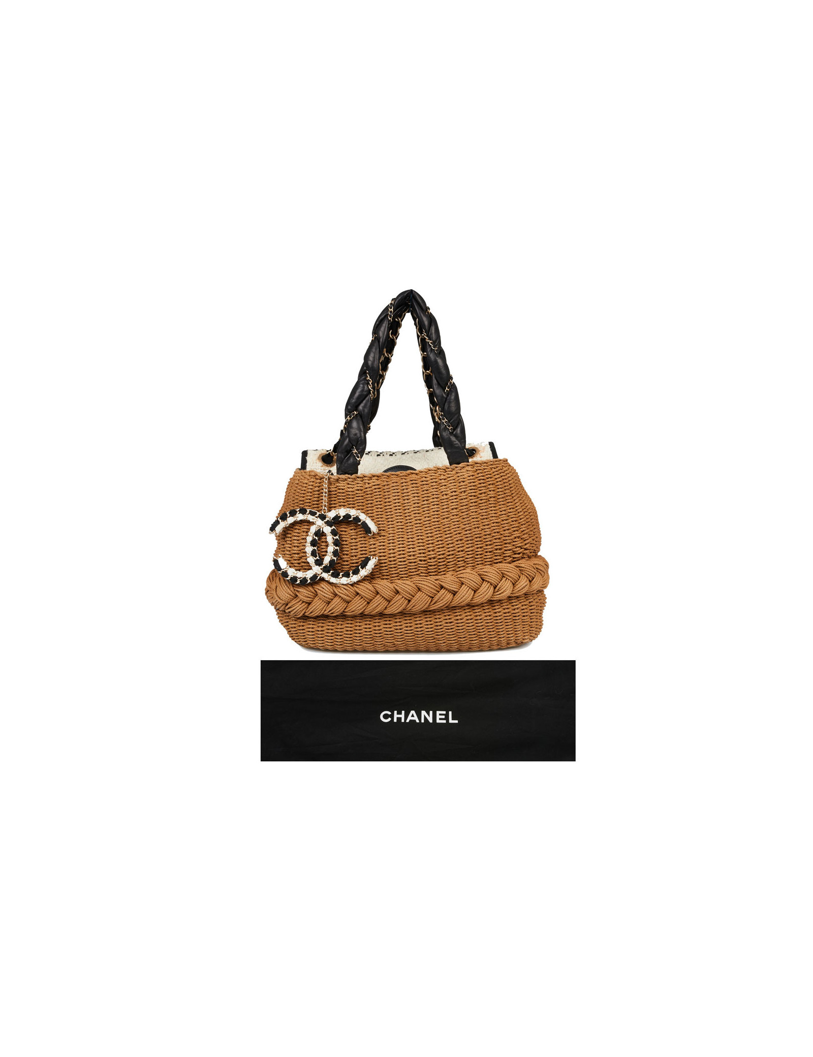 Détails : Sac panier en corde nattée et tressée, rabat en coton effet tweed, anses en cuir et gros bijou CC pendant. Le tweed présente une petite auréole jaune autour des 2 œillets du rabat mais le sac est en très bon état général.