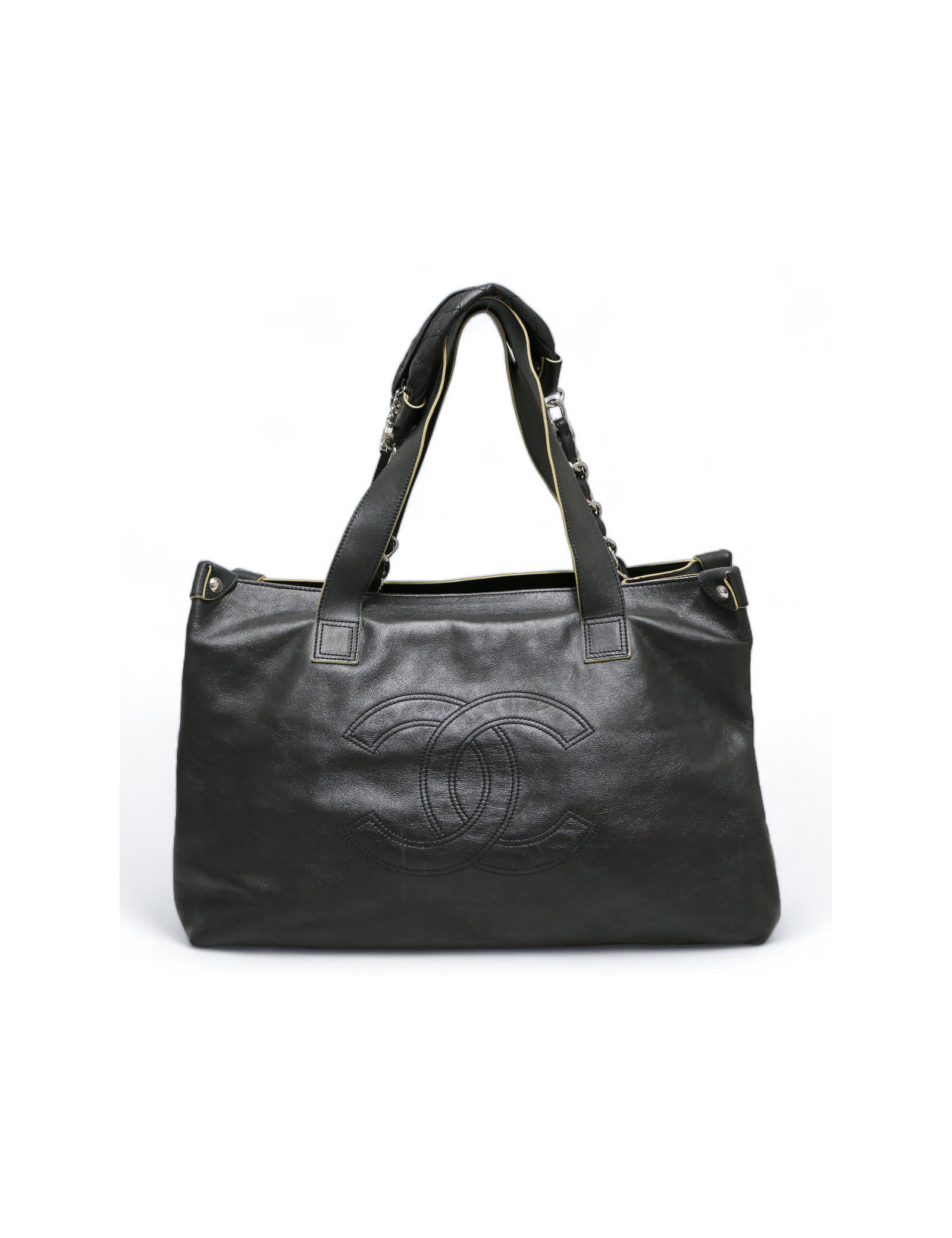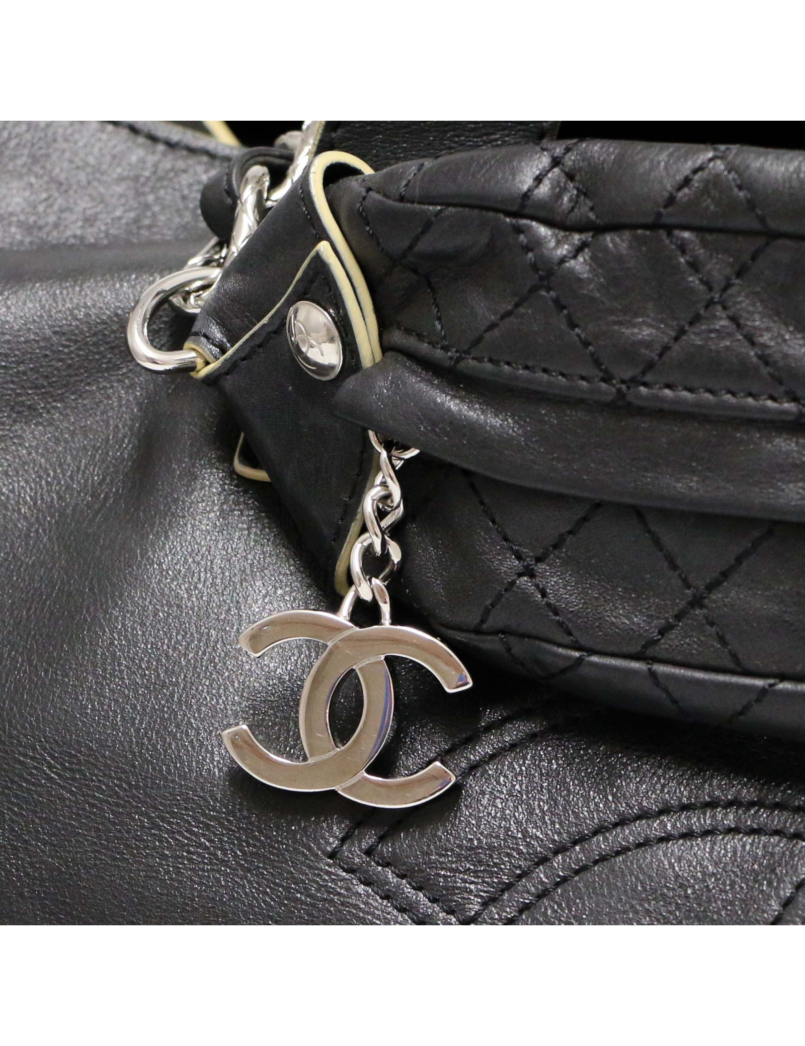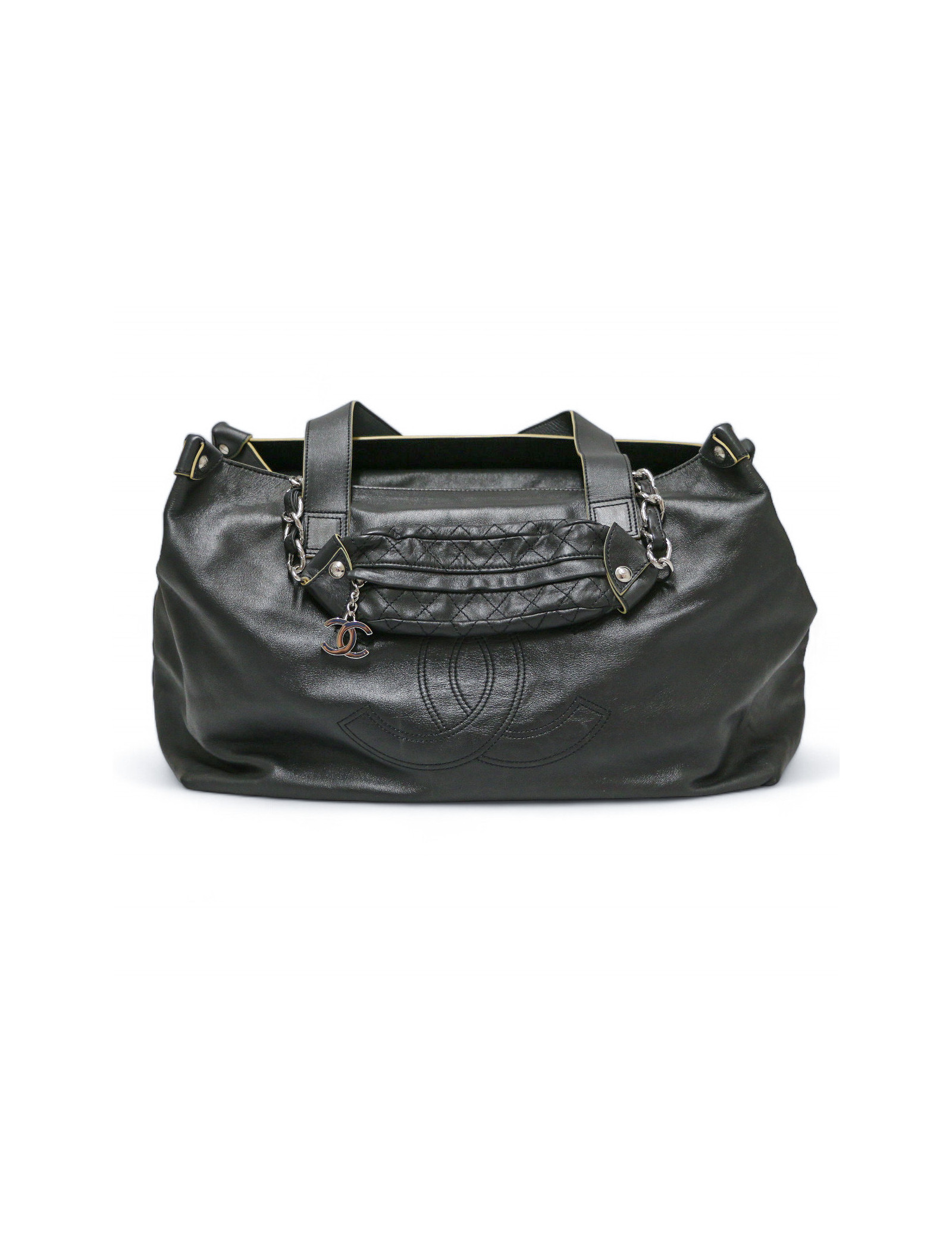 Détails : fermeture zippée, trois petites poches intérieures dont une zippée. Deux anses en cuir et une anse en chaîne argenté et cuir comportement une petite pochette zippée matelassée agrémentée d'un charms CC. Gros logo CC sur le devant. Bon état, quelques traces sur le cuir, peu visibles