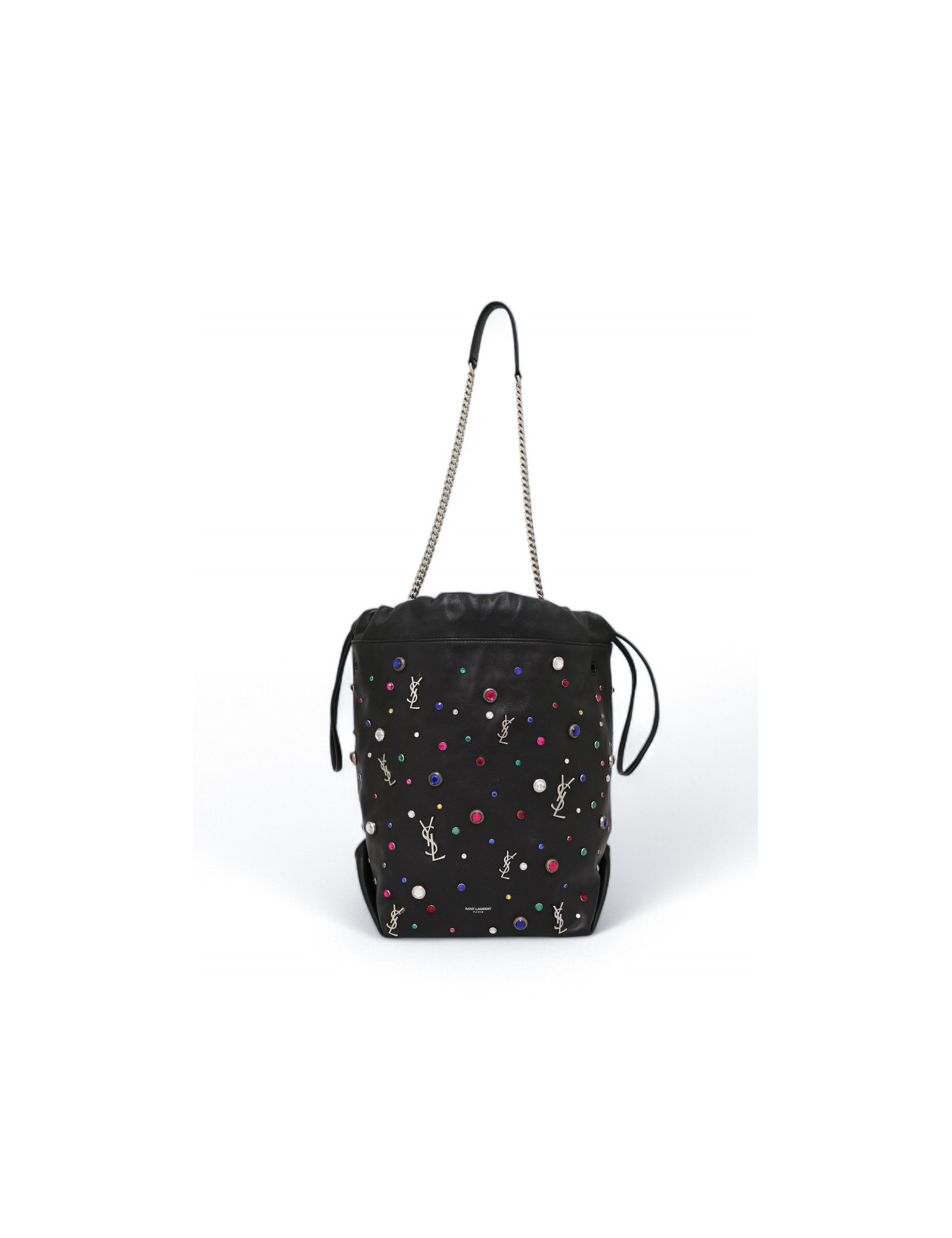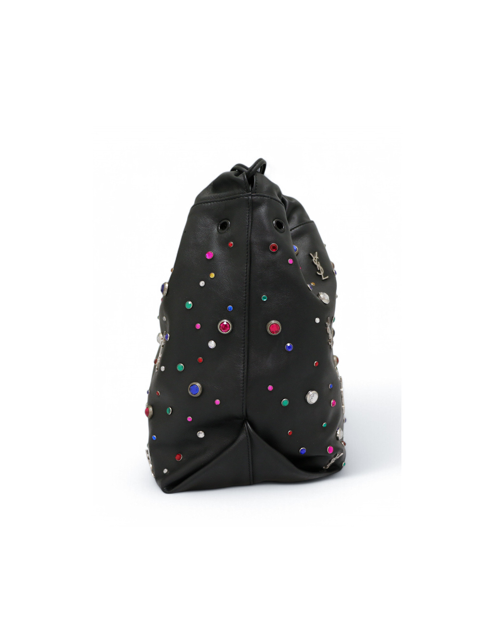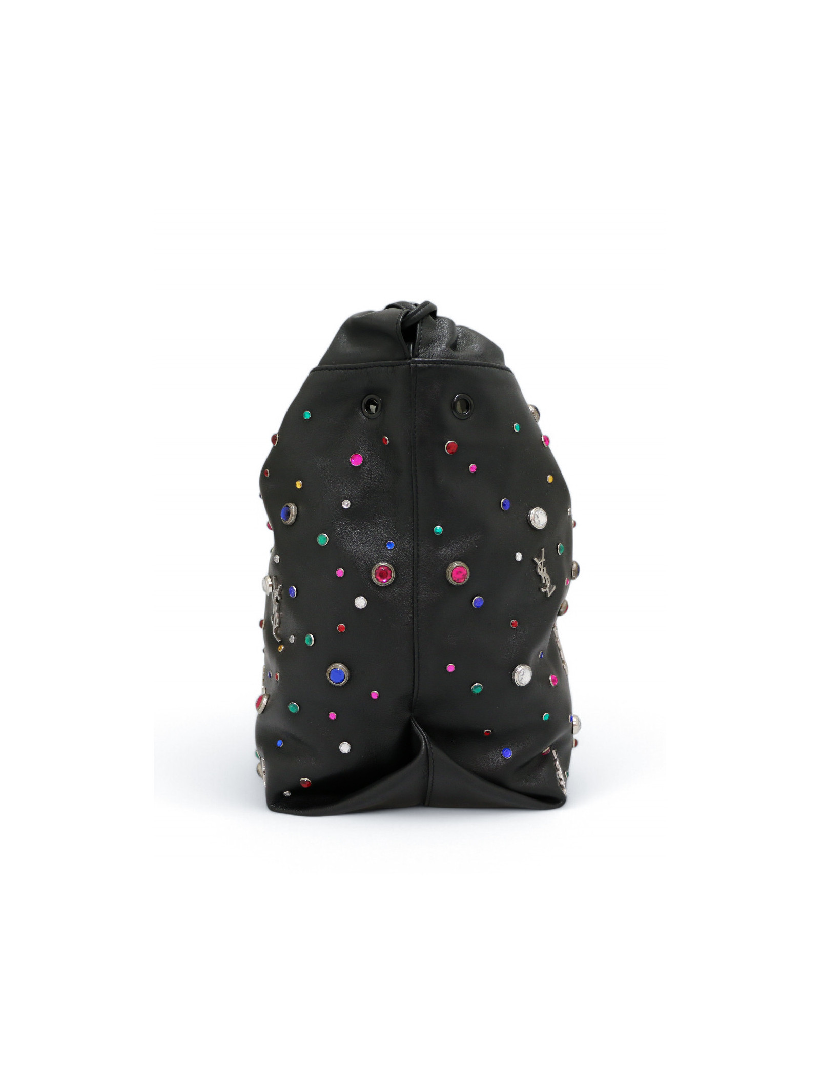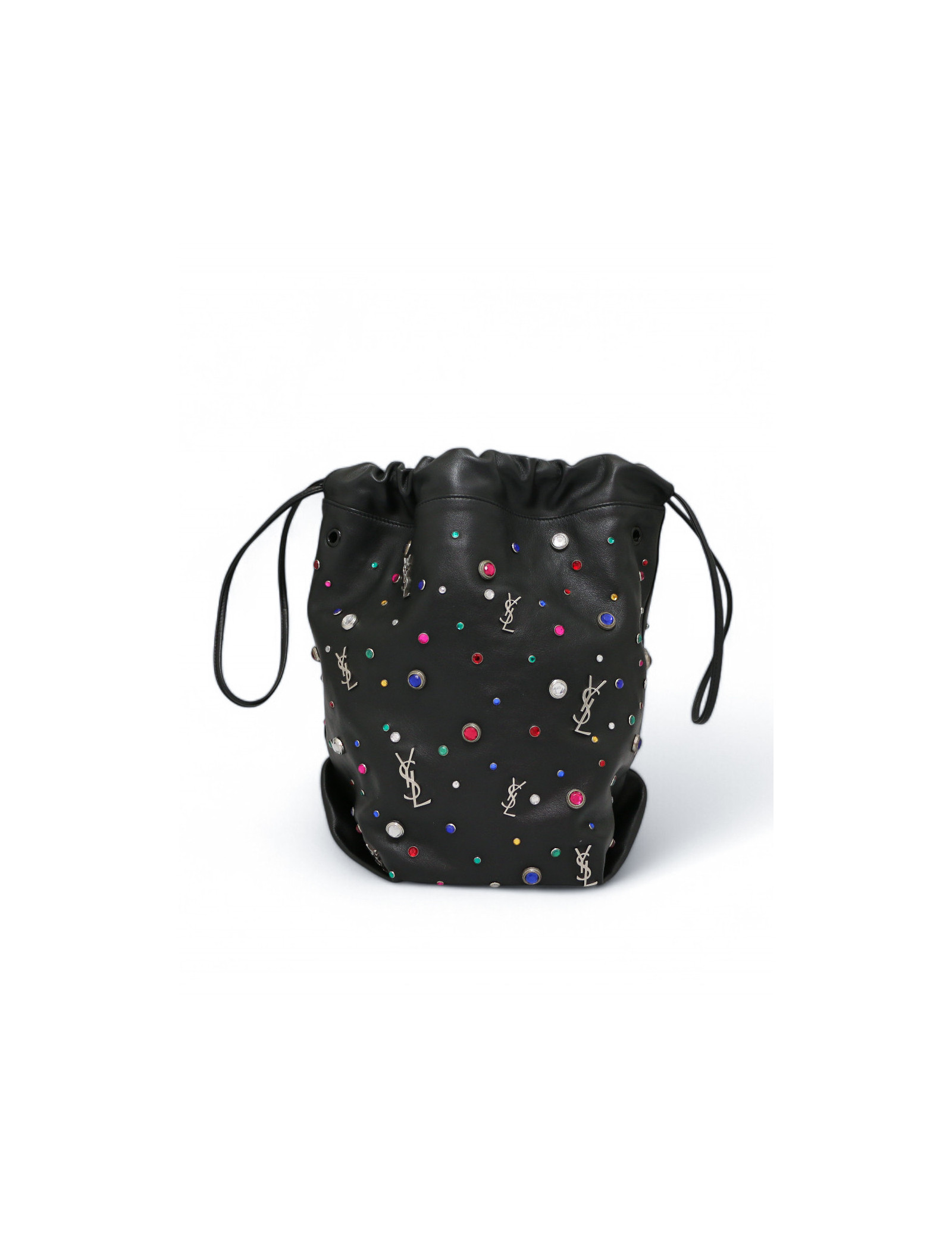 Détails : forme seau, porté épaule, fermeture par un cordon en cuir, une poche intérieure avec fermeture à glissière. Cristaux multicolores et petits logos YSL des deux côtés du sac. Très bon état malgré un strass manquant, presque invisible quand le sac est porté.
