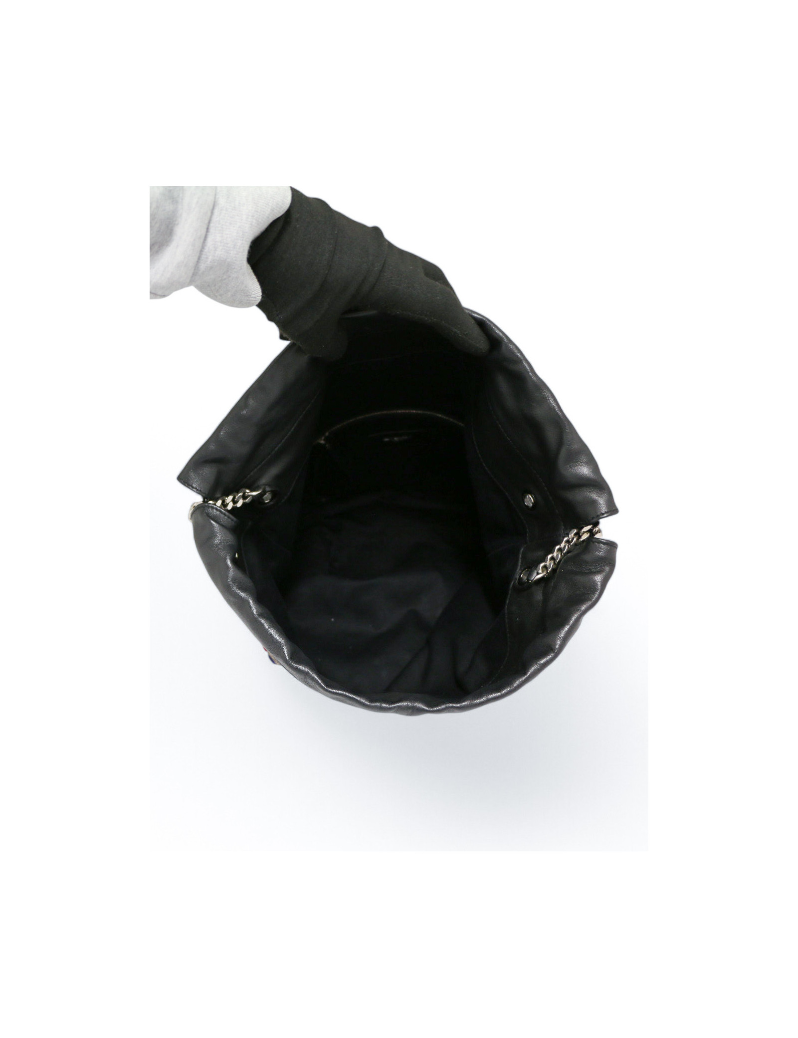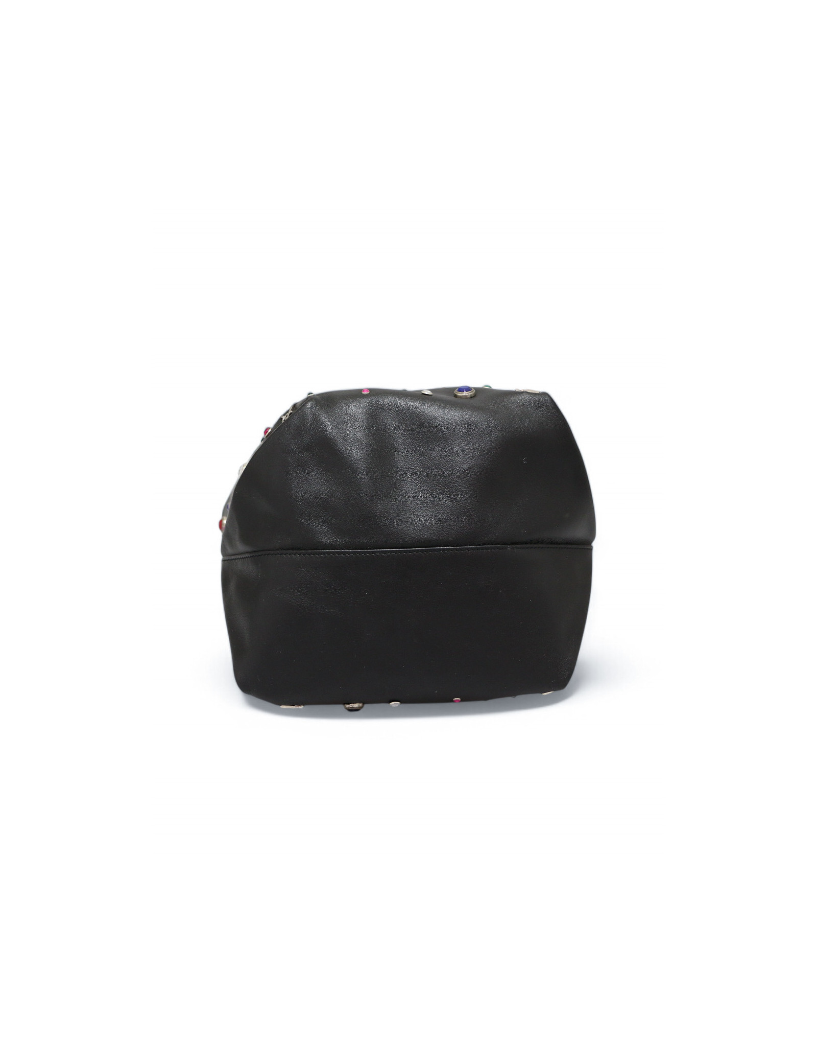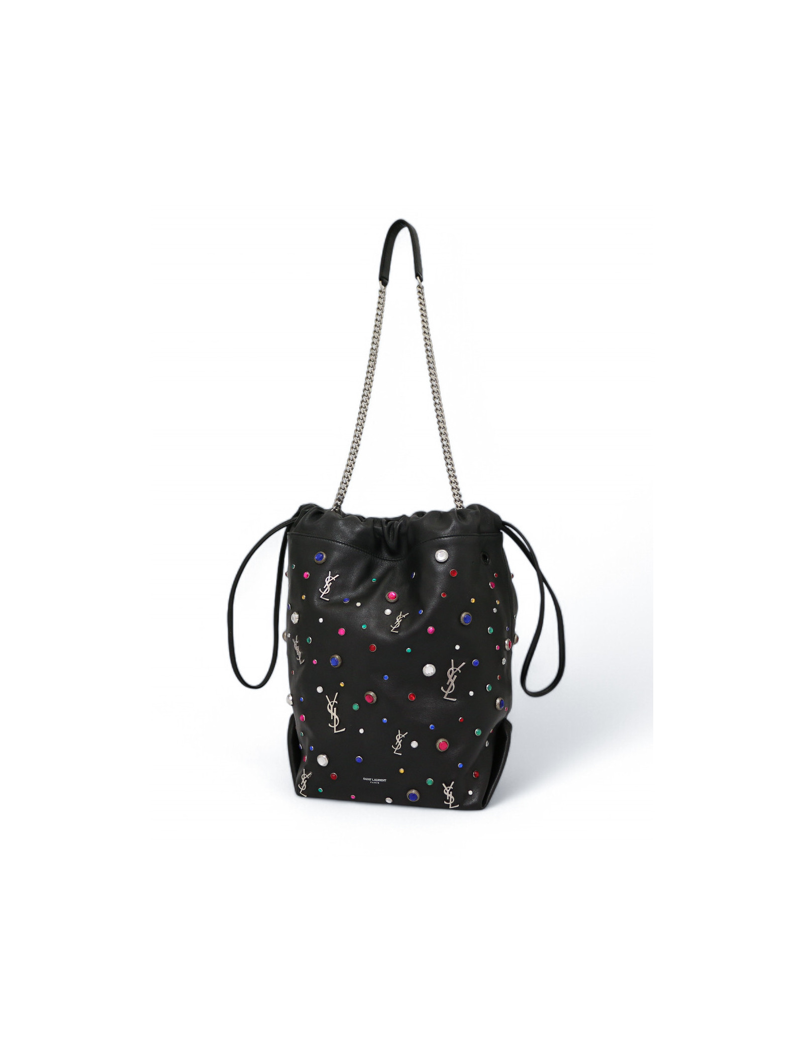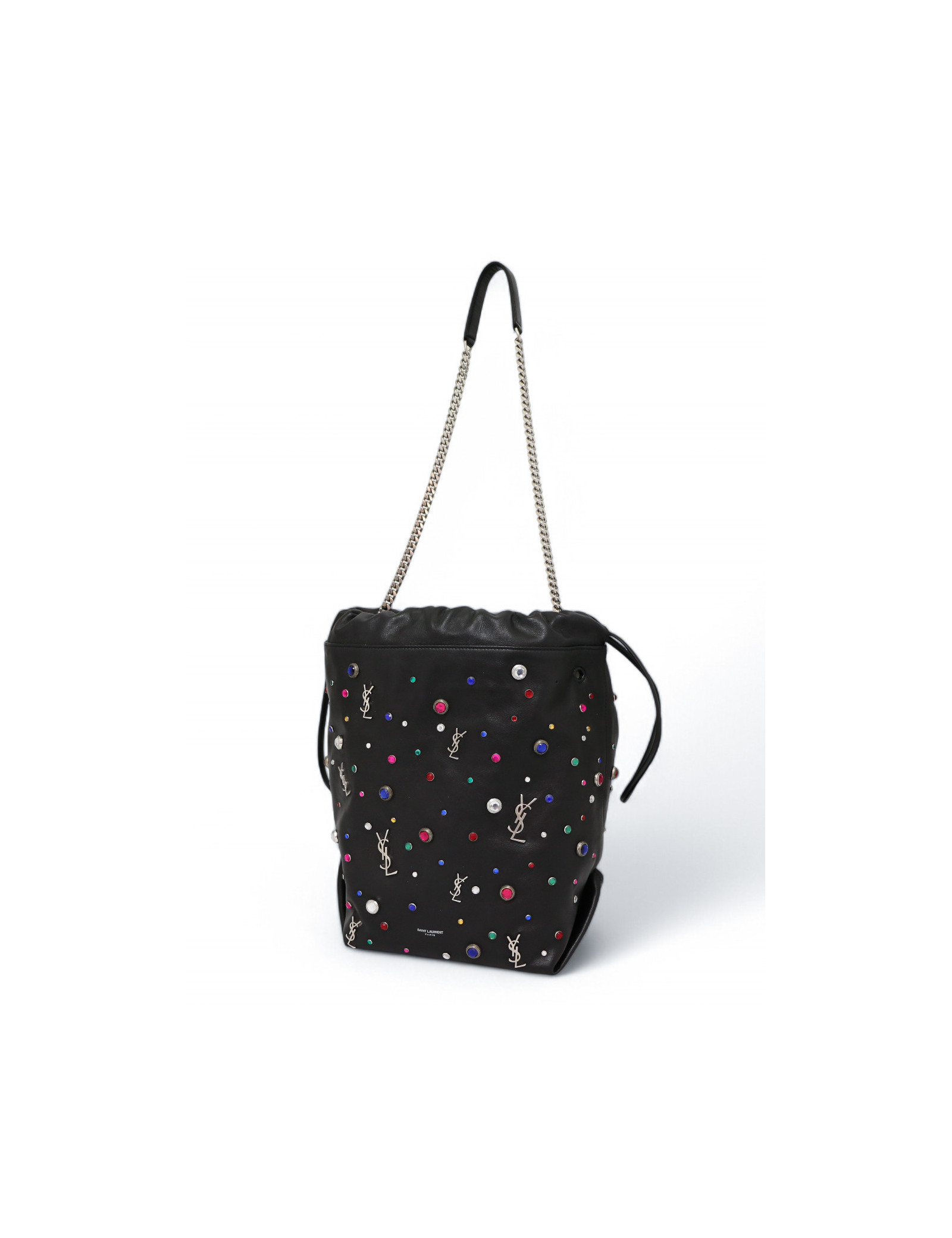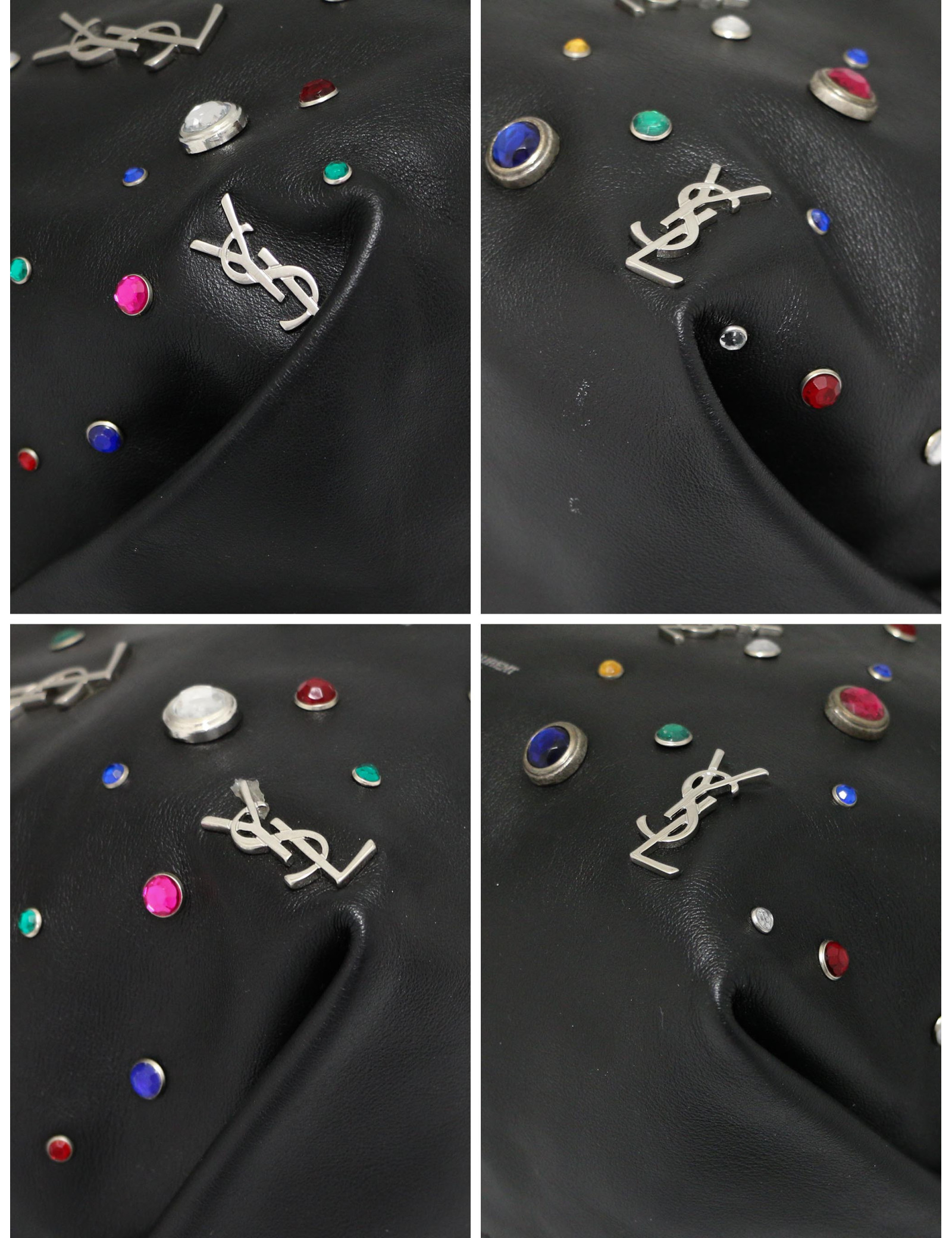 Détails : forme seau, porté épaule, fermeture par un cordon en cuir, une poche intérieure avec fermeture à glissière. Cristaux multicolores et petits logos YSL des deux côtés du sac. Très bon état malgré un strass manquant, presque invisible quand le sac est porté.