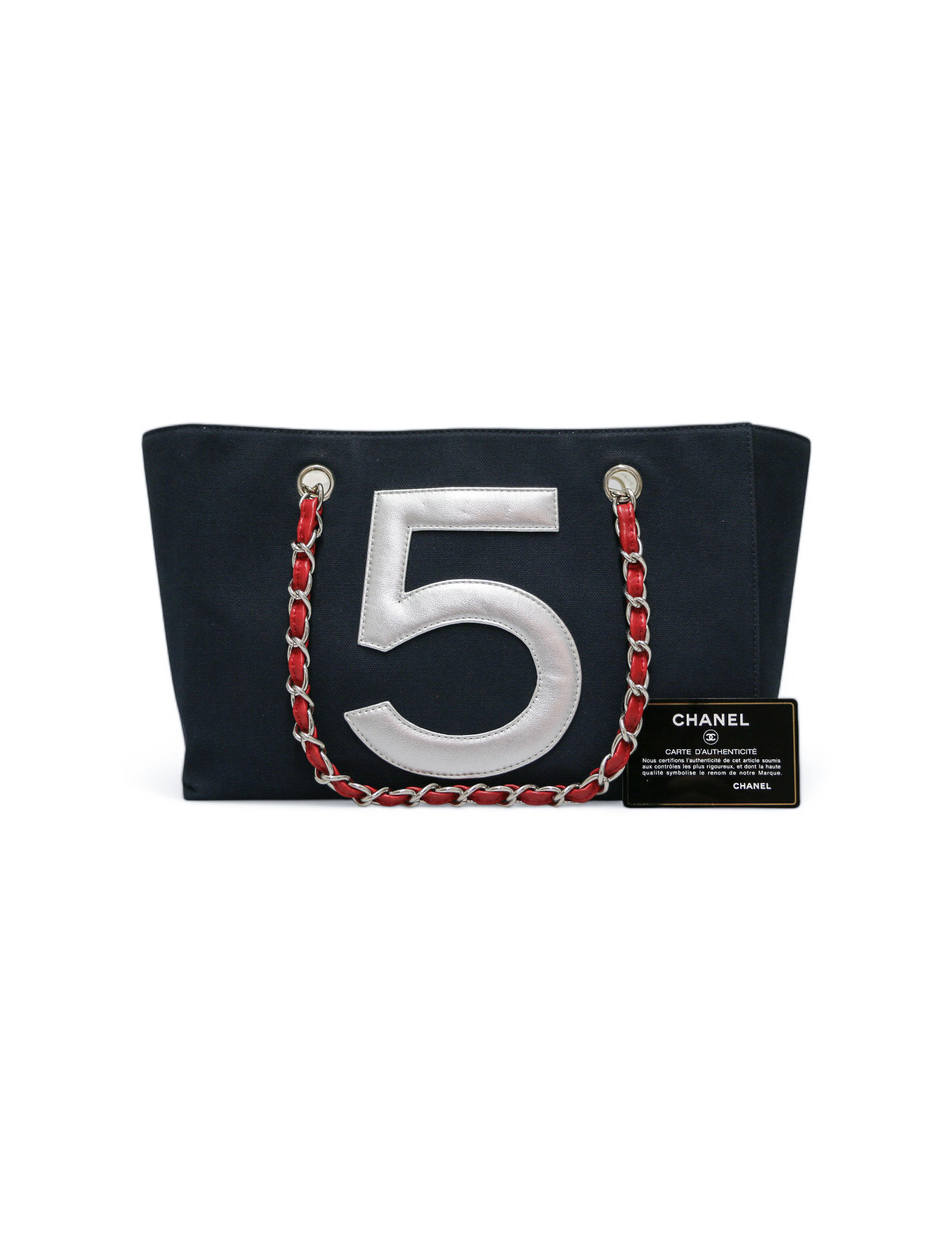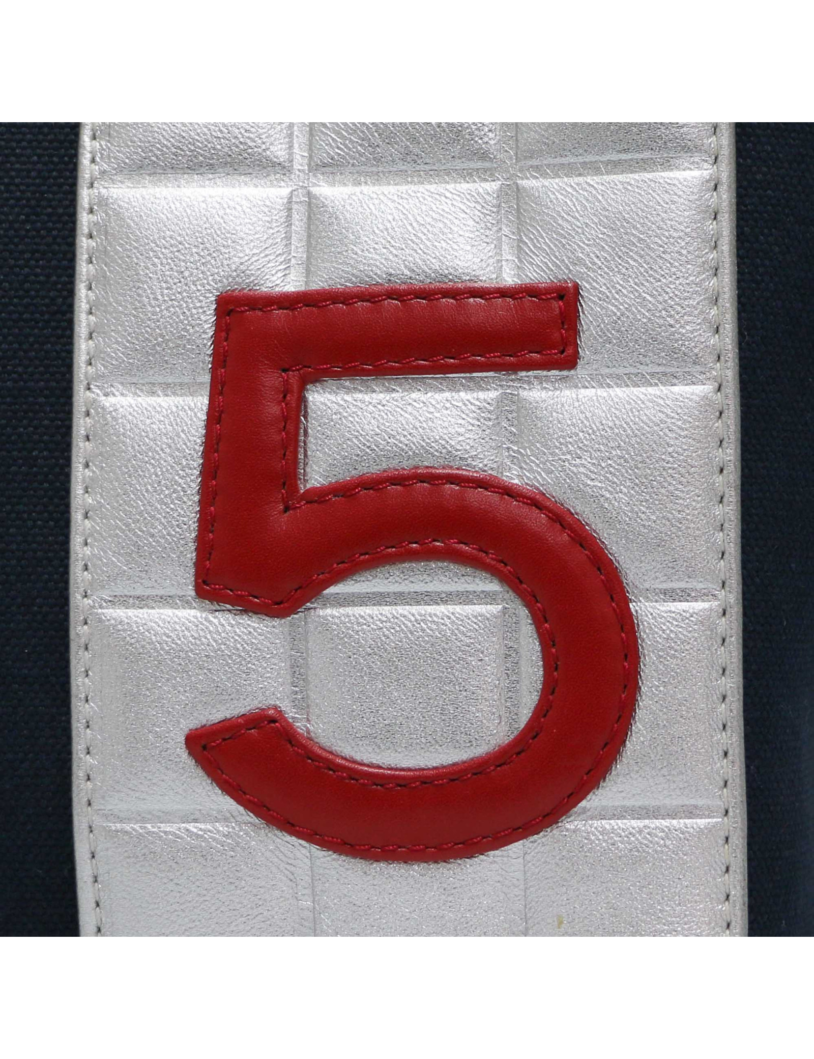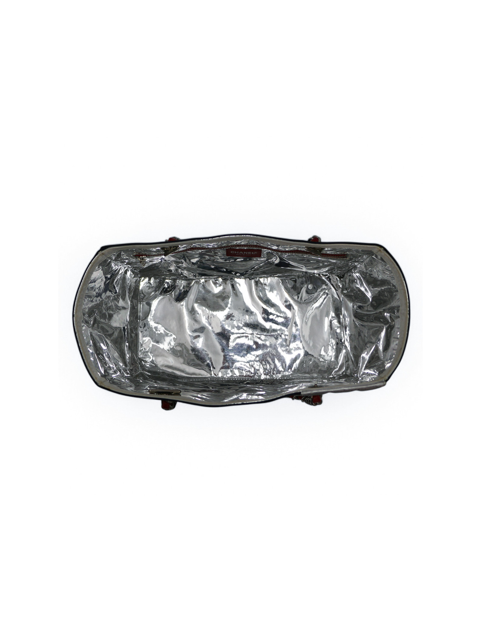 Détails : cabas avec le logo CC en cuir blanc et deux 5 en cuir, un rouge à l’avant et un argenté à l’arrière. Petit poche plaquée zippée à l’intérieur. Extérieur en très bon état couleur aluminium, des petites tâches sur la bordure intérieure.