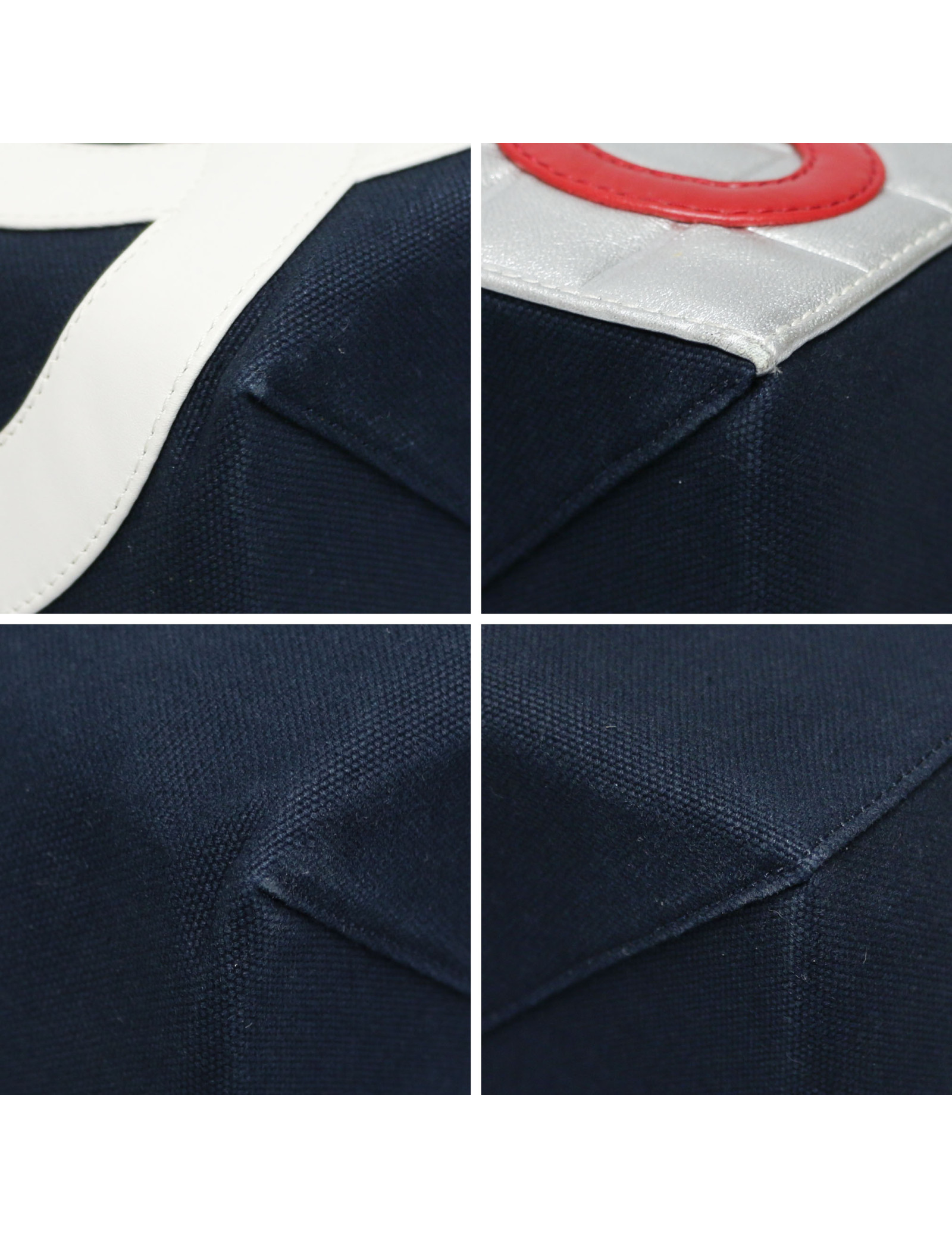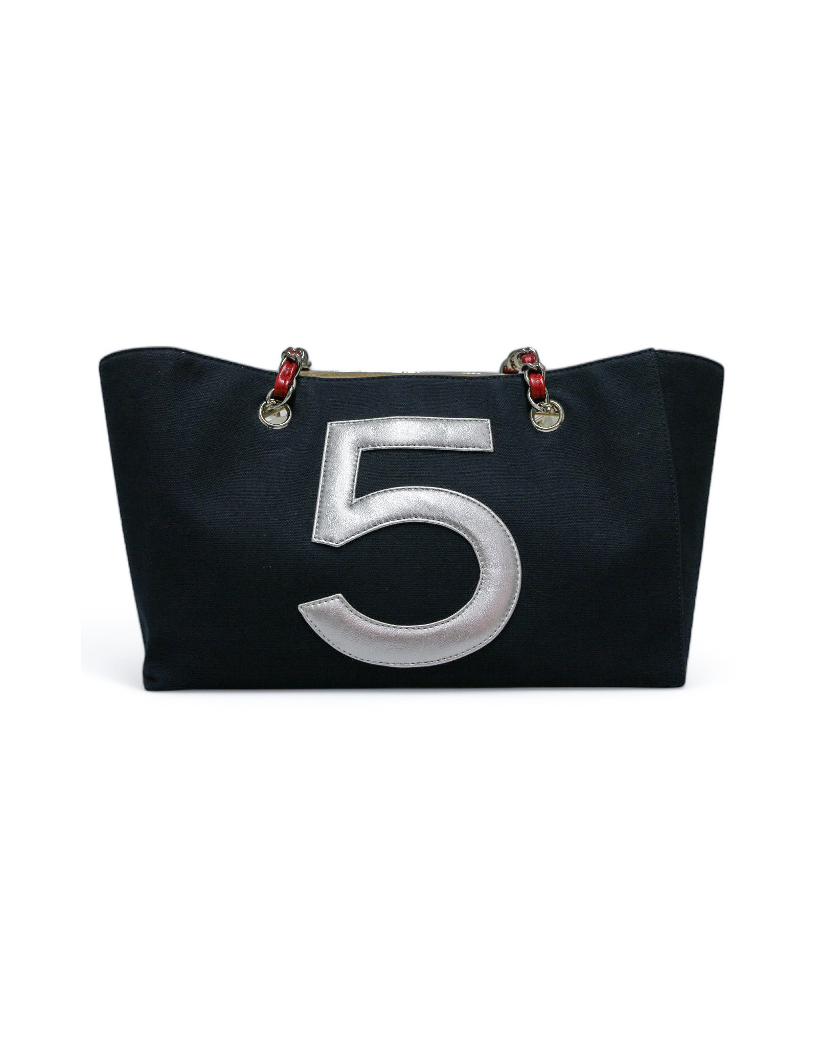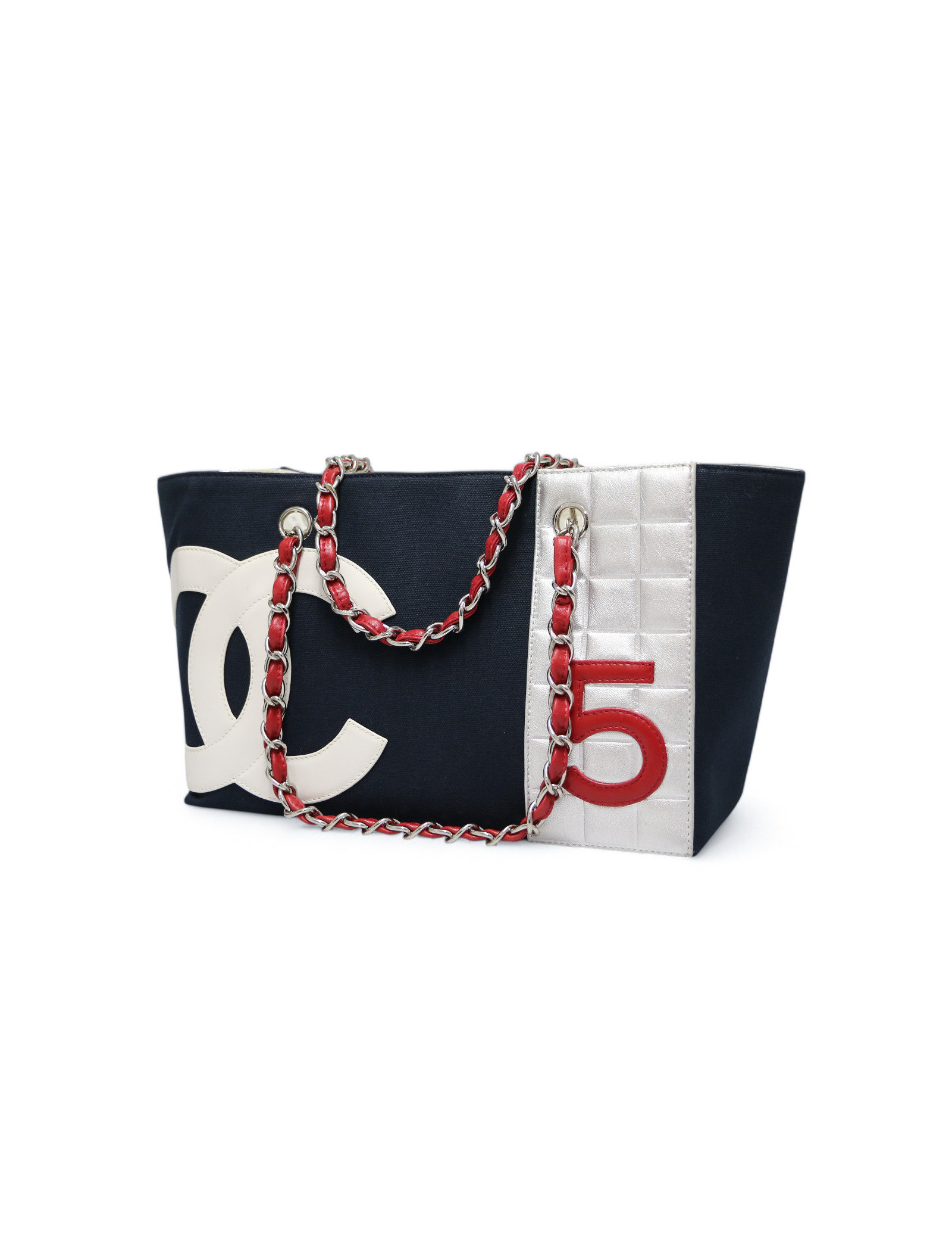 Détails : cabas avec le logo CC en cuir blanc et deux 5 en cuir, un rouge à l’avant et un argenté à l’arrière. Petit poche plaquée zippée à l’intérieur. Extérieur en très bon état couleur aluminium, des petites tâches sur la bordure intérieure.