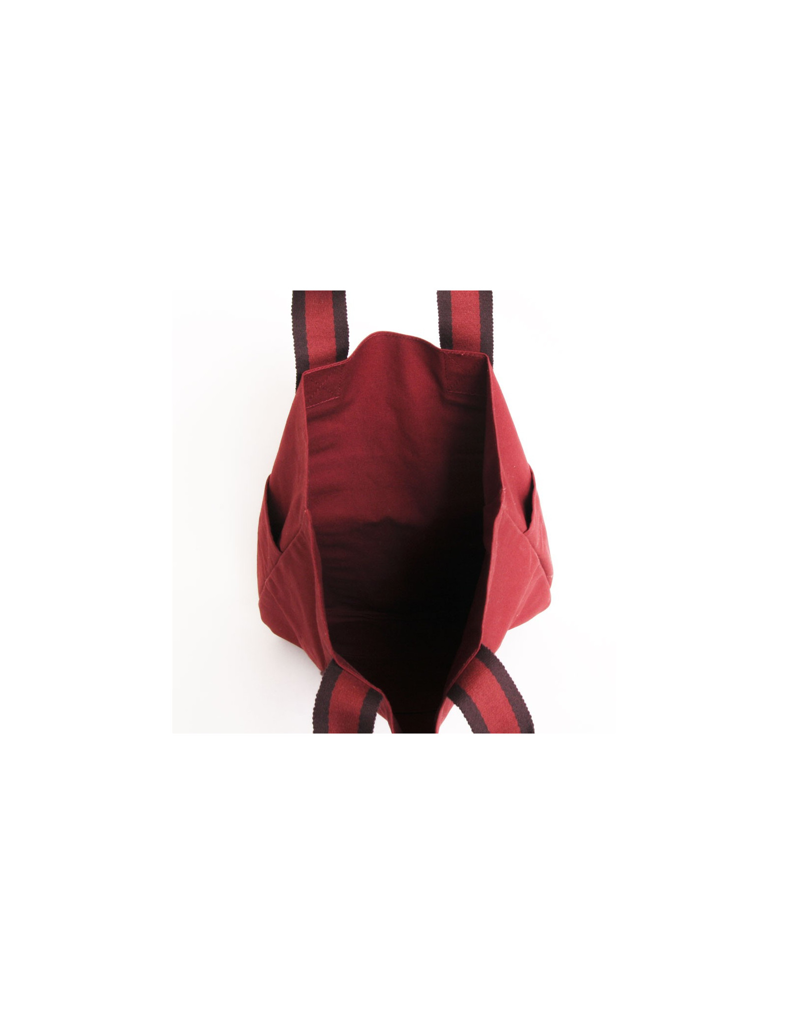 Sac cabas hermès, rouge H avec des bandes bordeaux, étiquette de la marque manquante. Il se porte à la main et peut contenir des dossiers ou bien un ordinateur. L'intérieur est doublé à l'identique.