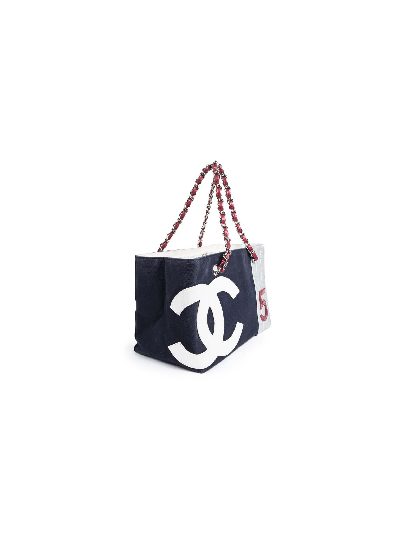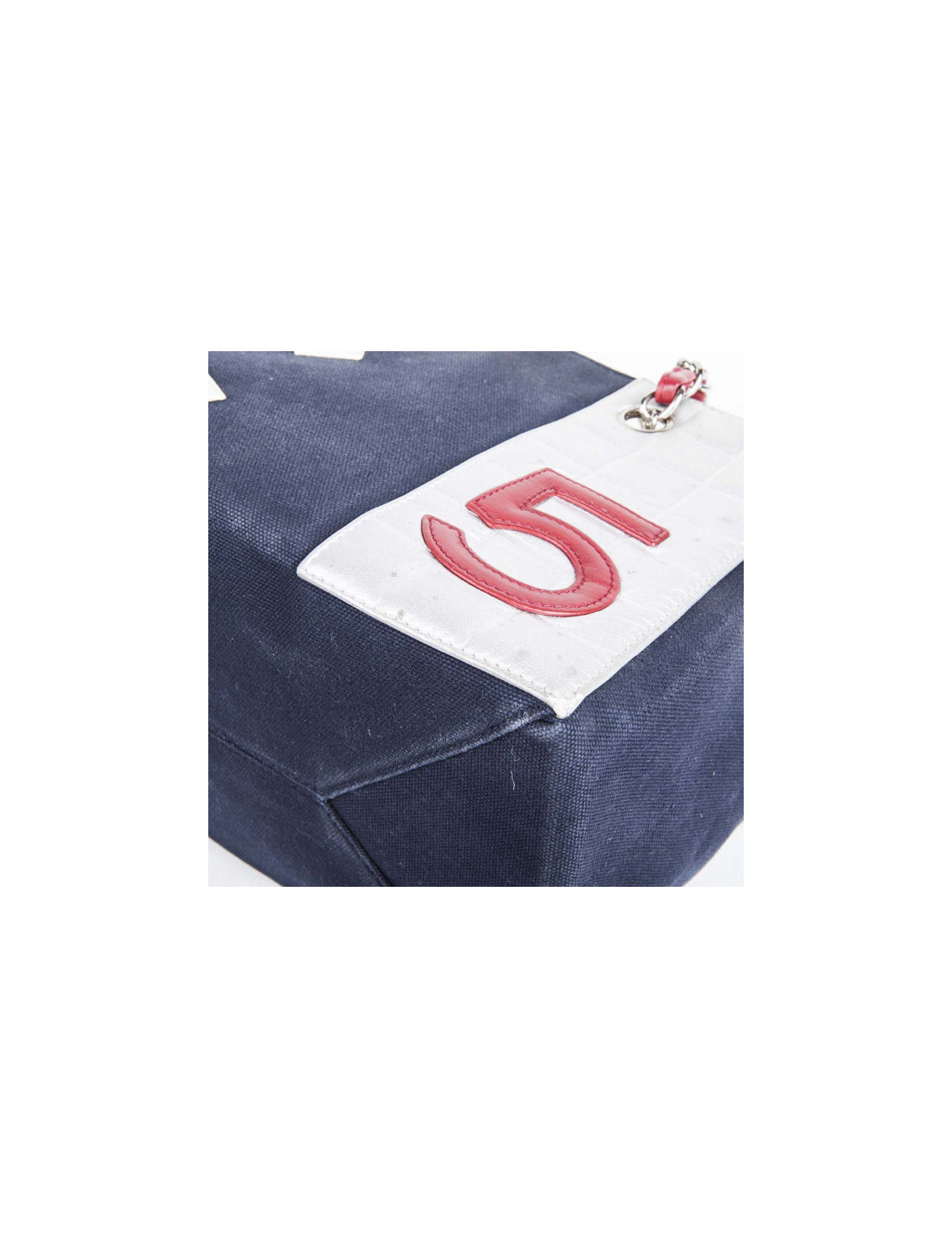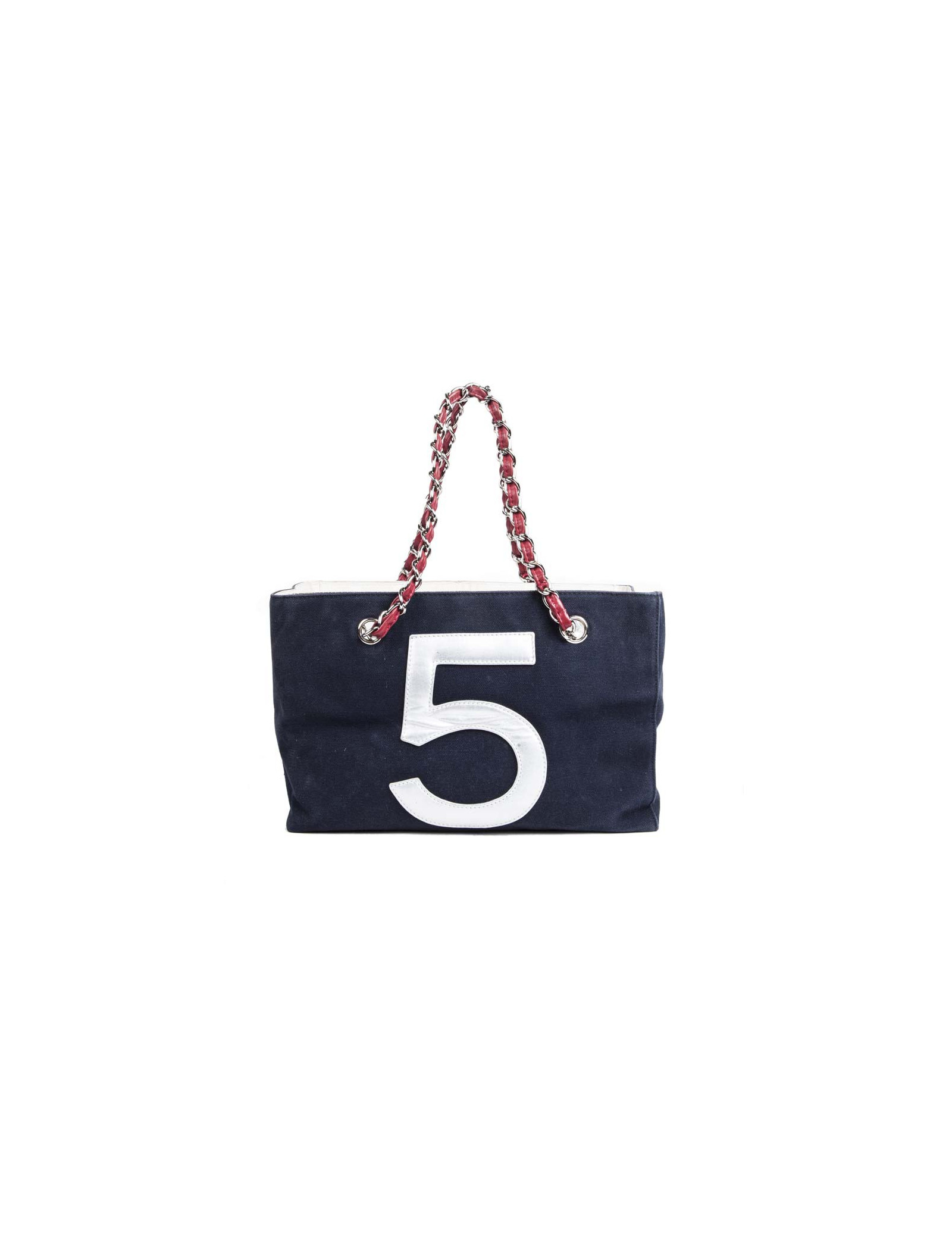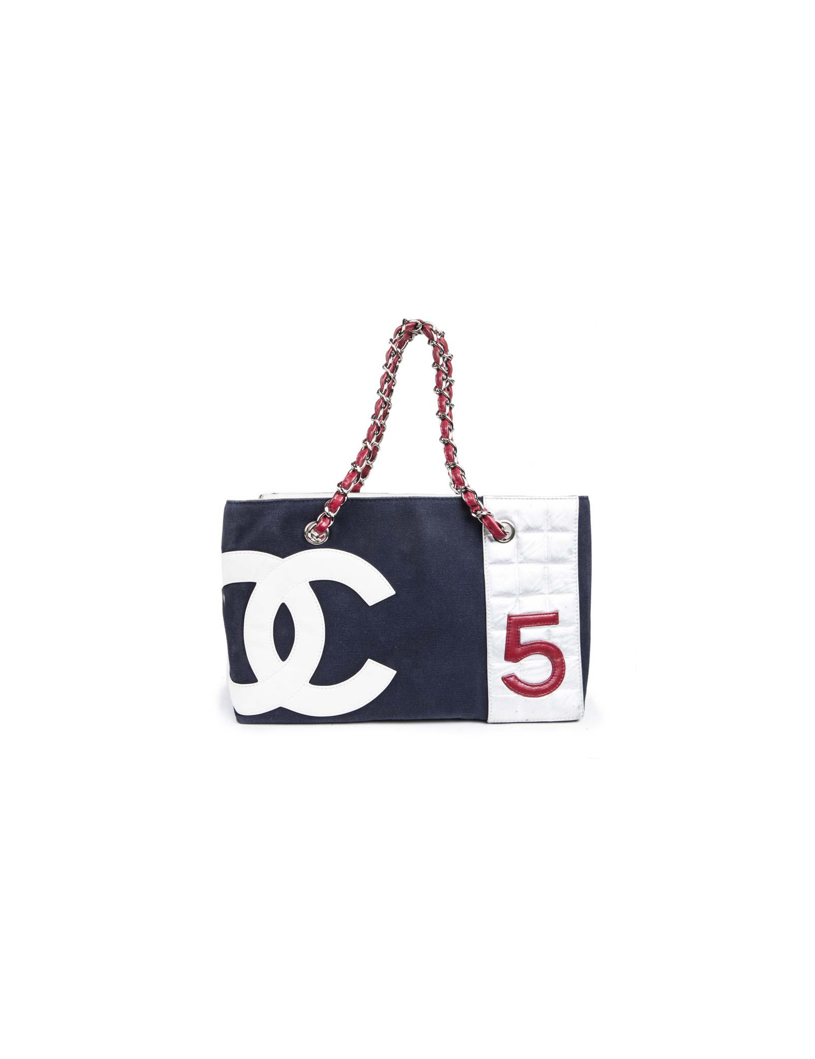 Collector. Sac de la Maison Chanel en toile bleu marine et cuir argenté matelassé. Le 'CC' est en cuir blanc et le numéro '5' en cuir rouge. Deux anses en chaîne argentée entrelacée de cuir rouge.