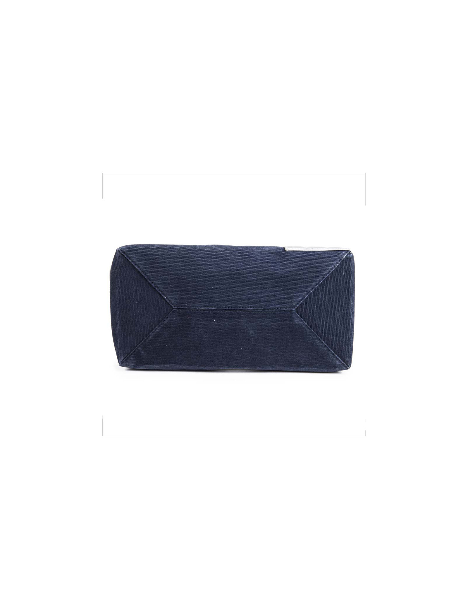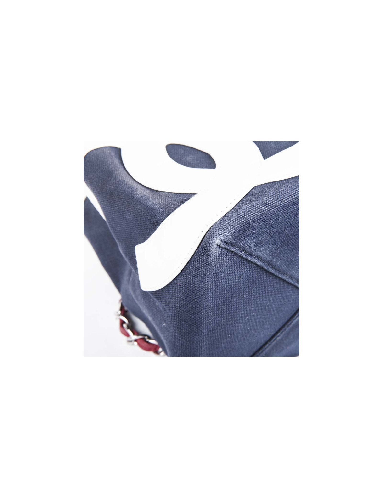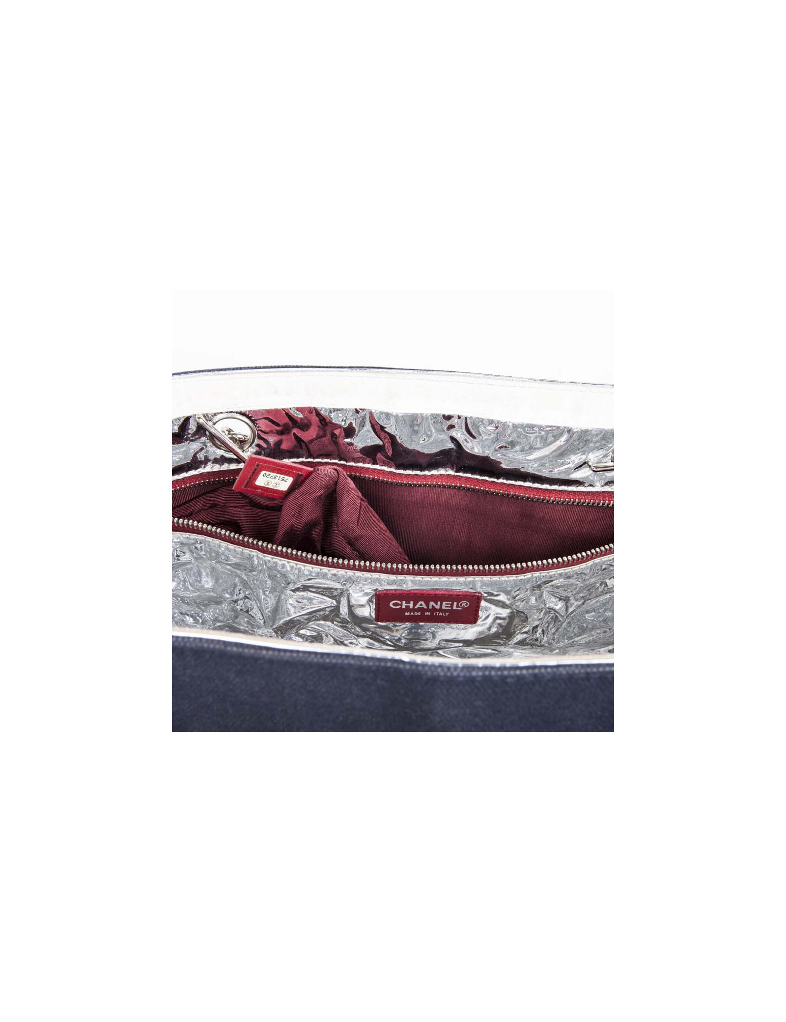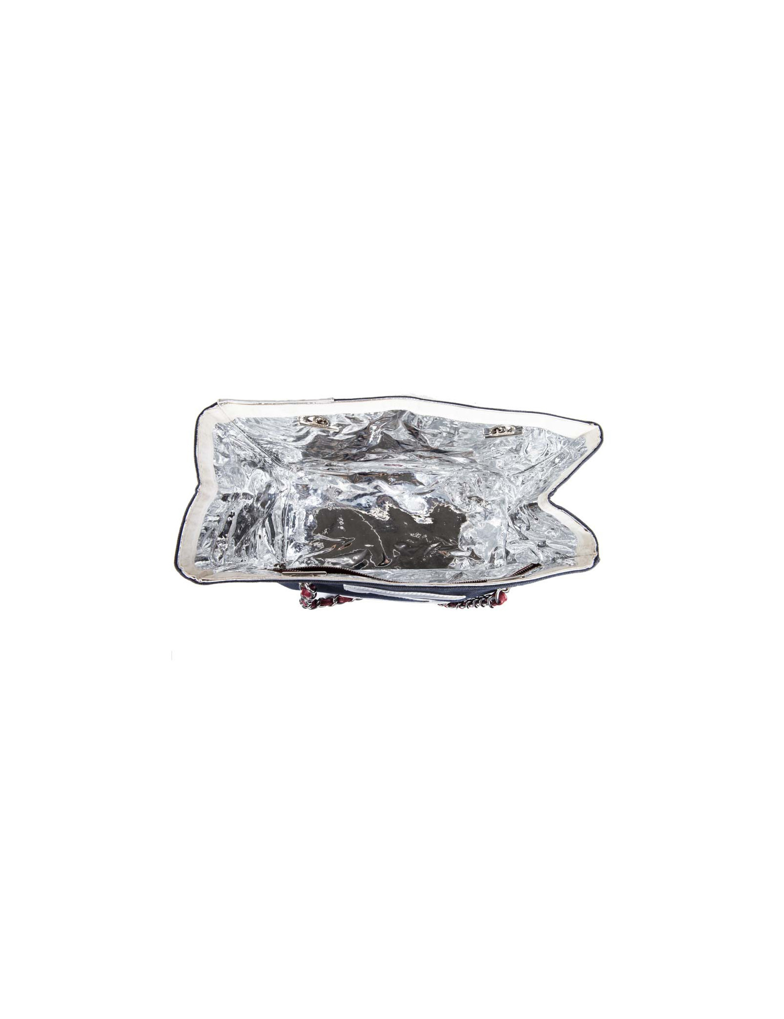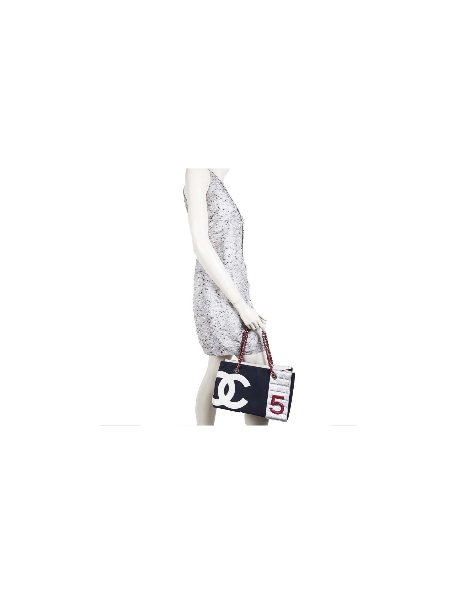 Collector. Sac de la Maison Chanel en toile bleu marine et cuir argenté matelassé. Le 'CC' est en cuir blanc et le numéro '5' en cuir rouge. Deux anses en chaîne argentée entrelacée de cuir rouge.