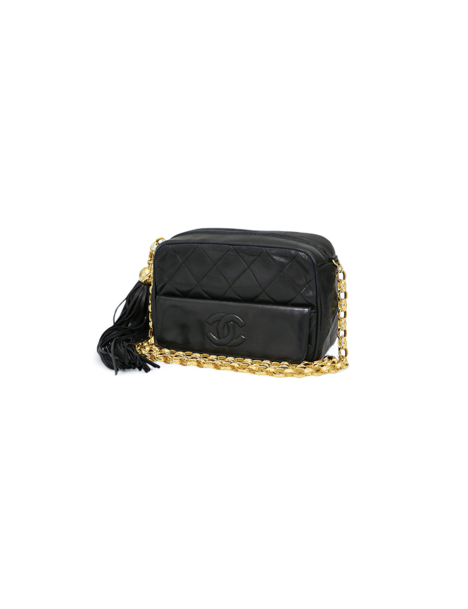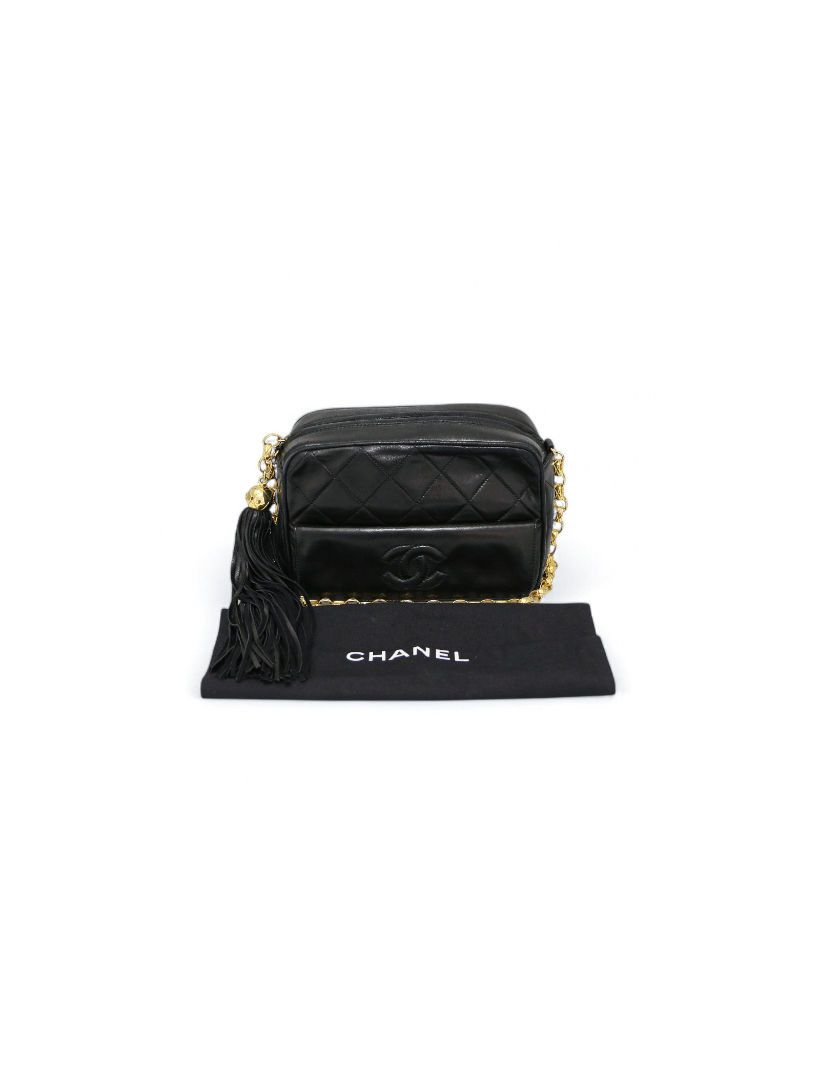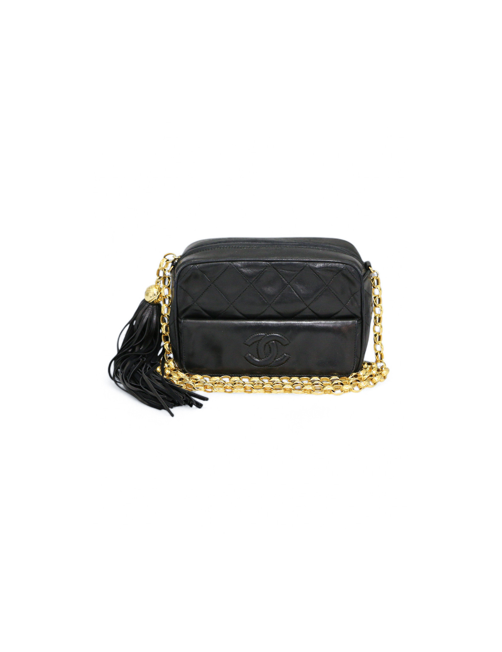 Détails : sac vintage avec une fermeture zippée sur le dessus, agrémenté d'un pompon charms. Il se porte croisé avec sa bandoulière en métal doré qui nous rappelle les ceintures emblématiques de l'époque. Une poche zippée à l'intérieur. A l'avant une petite poche plaquée fermée par un rabat aimanté avec un CC embossé. Aucune usure.
