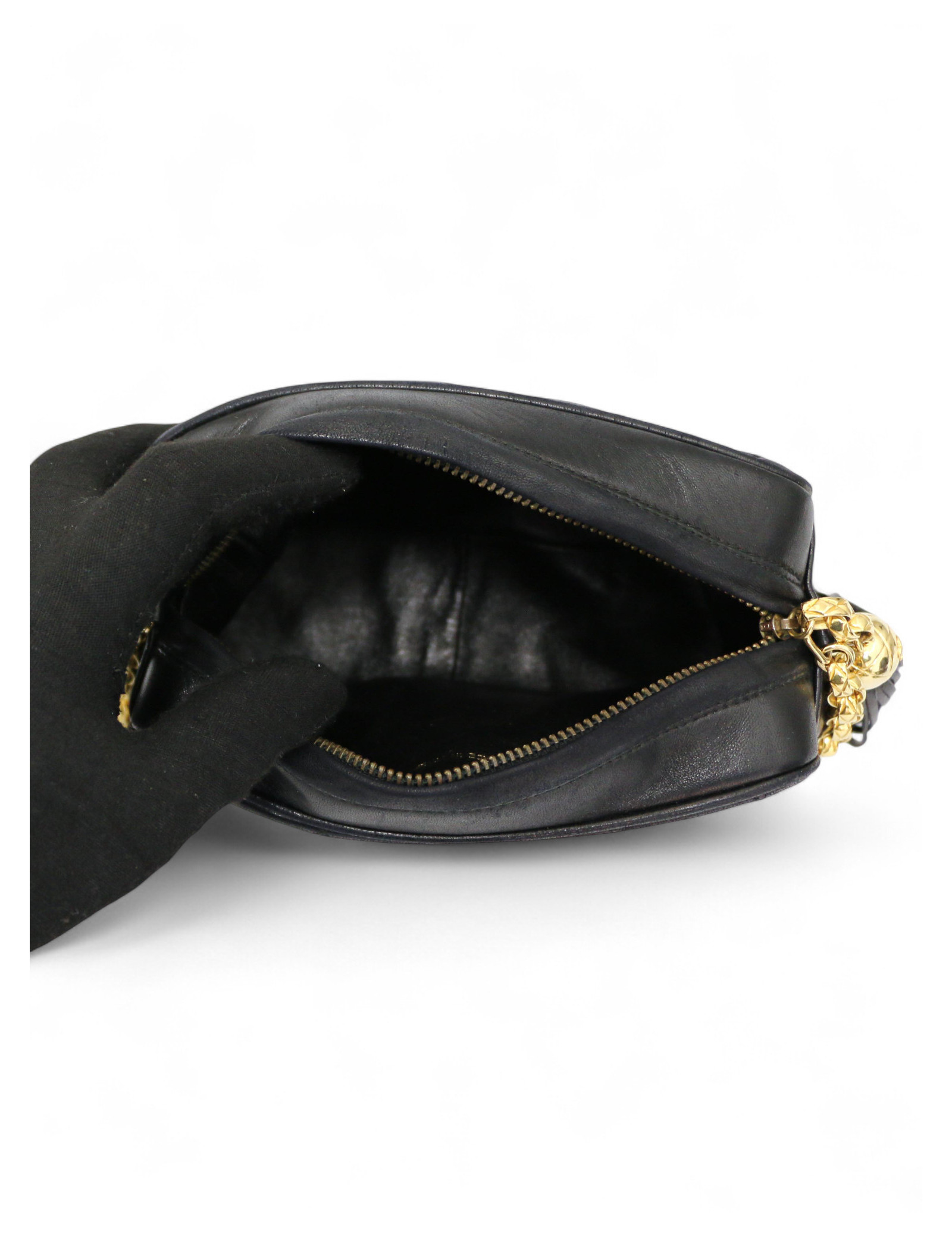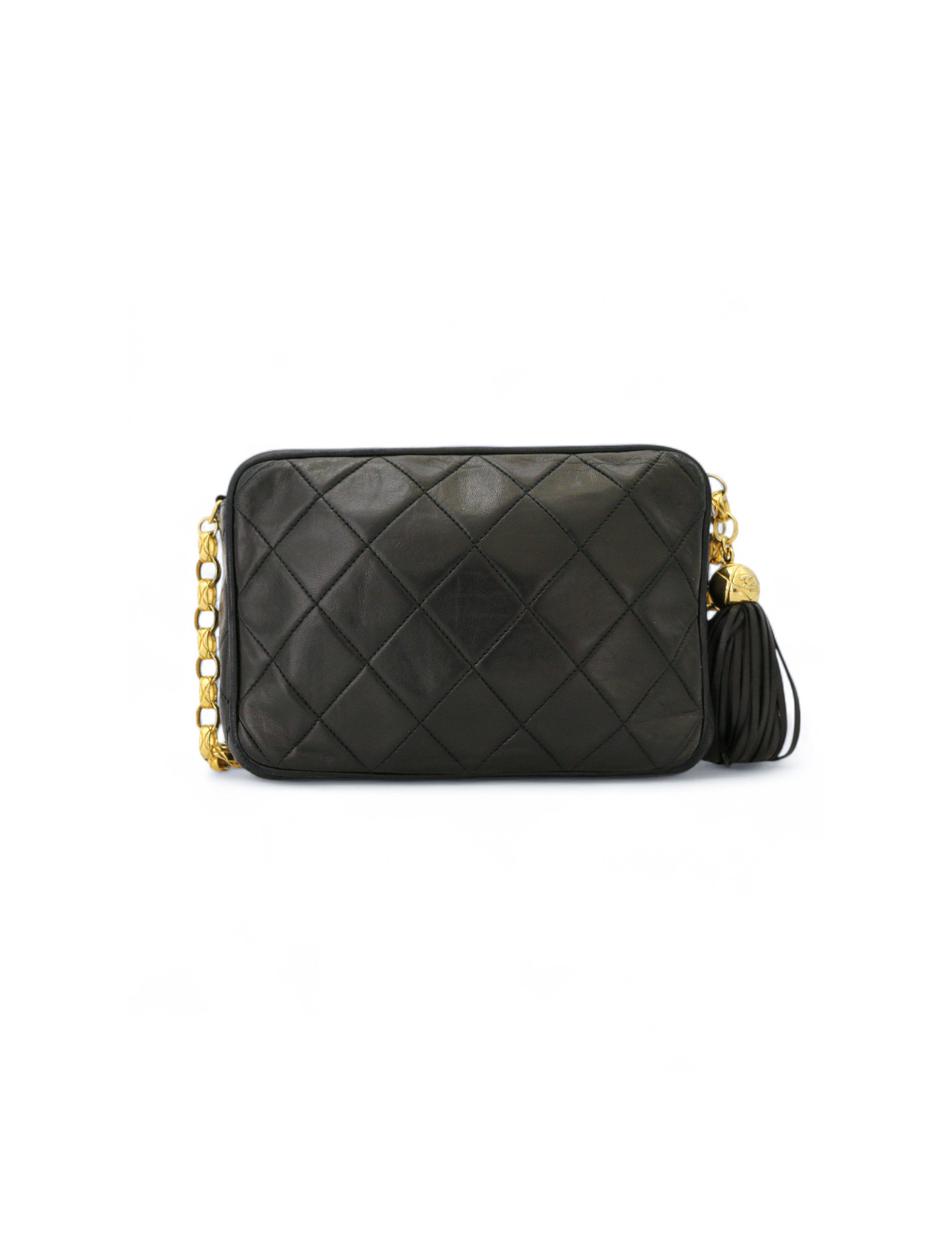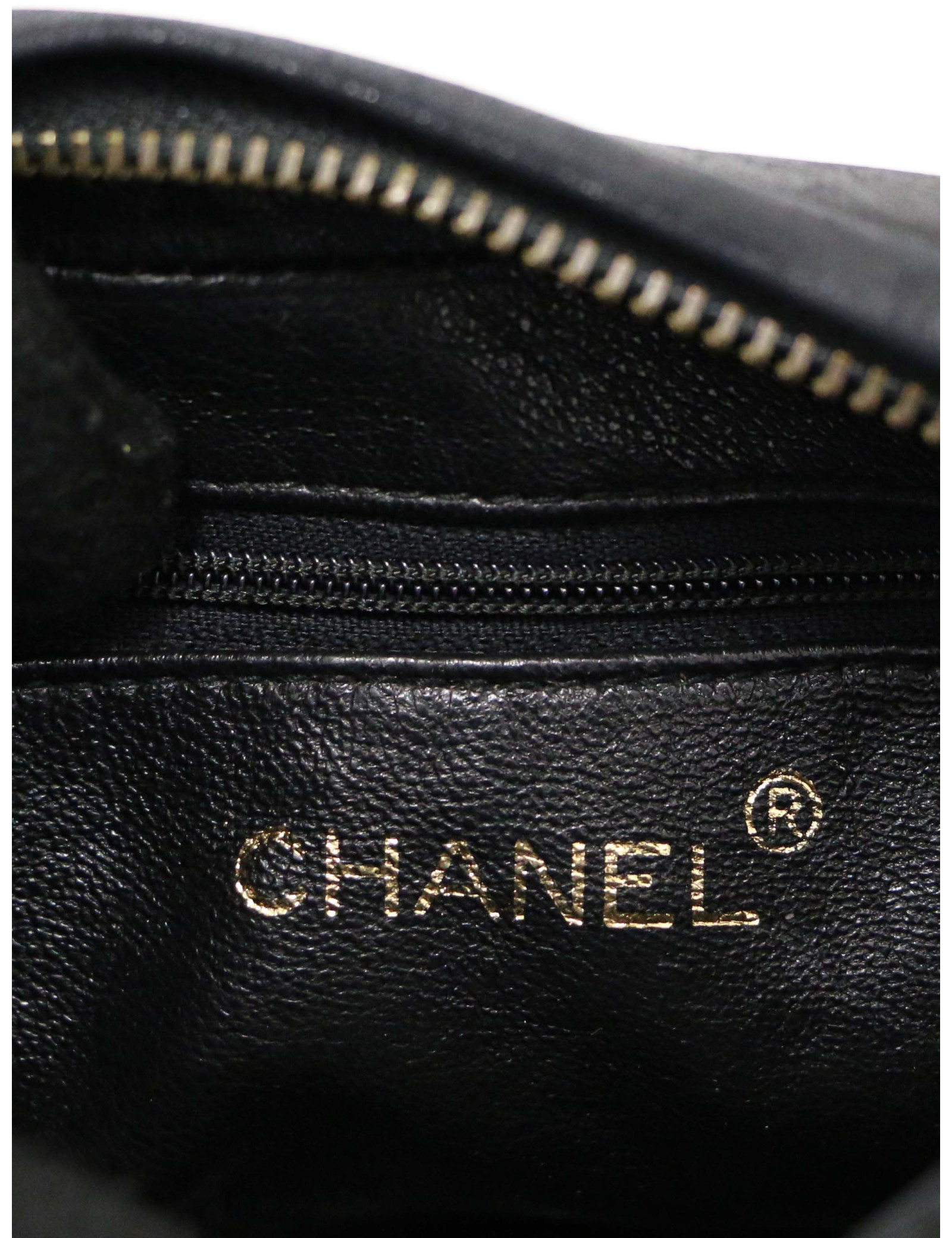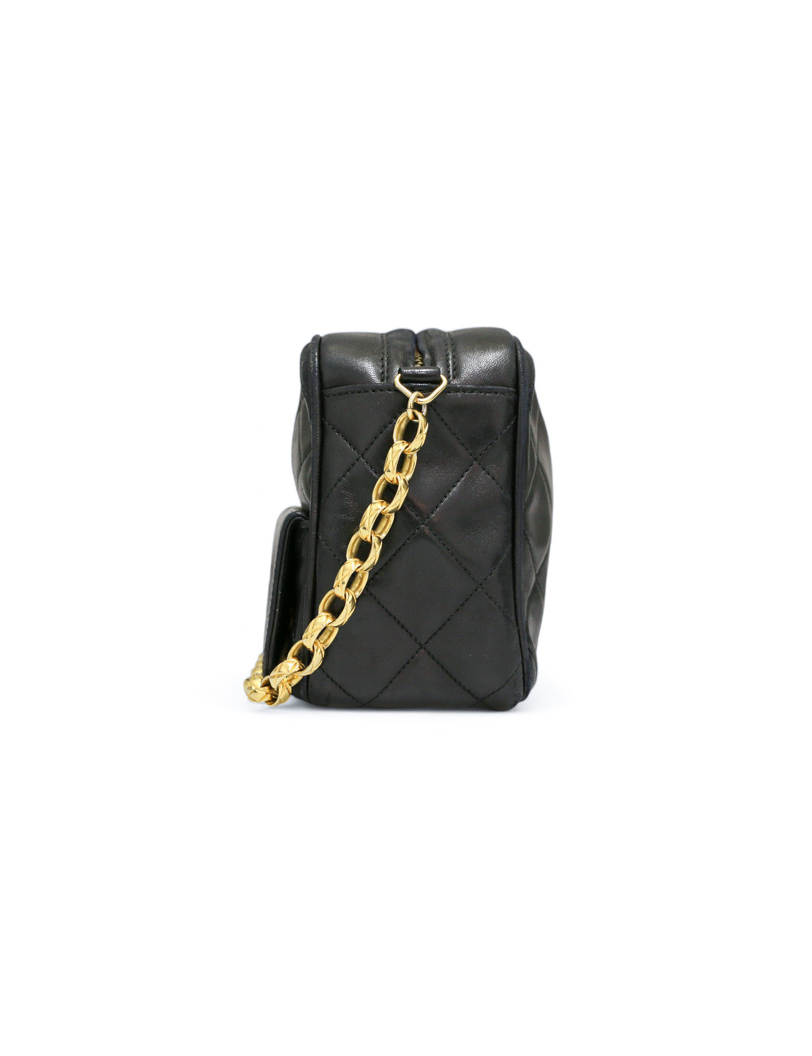 Détails : sac vintage avec une fermeture zippée sur le dessus, agrémenté d'un pompon charms. Il se porte croisé avec sa bandoulière en métal doré qui nous rappelle les ceintures emblématiques de l'époque. Une poche zippée à l'intérieur. A l'avant une petite poche plaquée fermée par un rabat aimanté avec un CC embossé. Aucune usure.