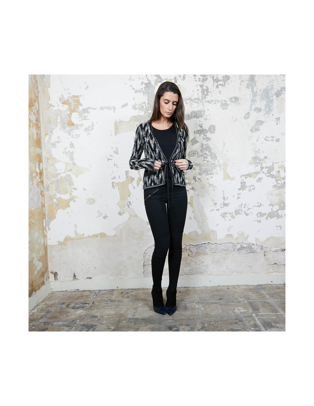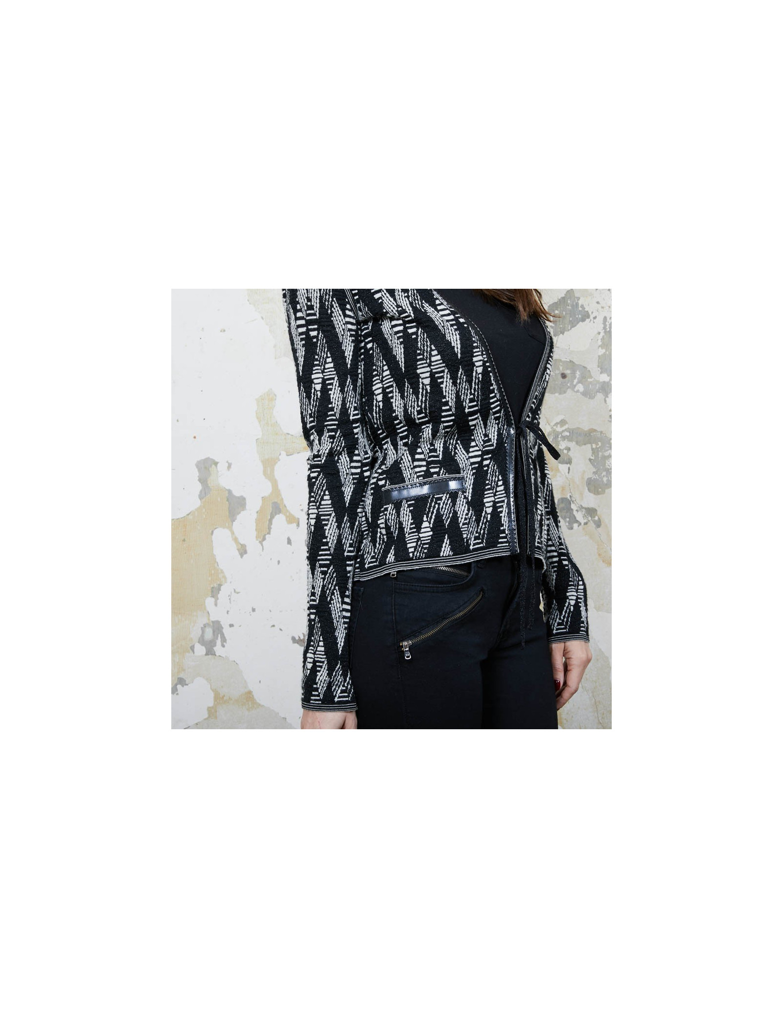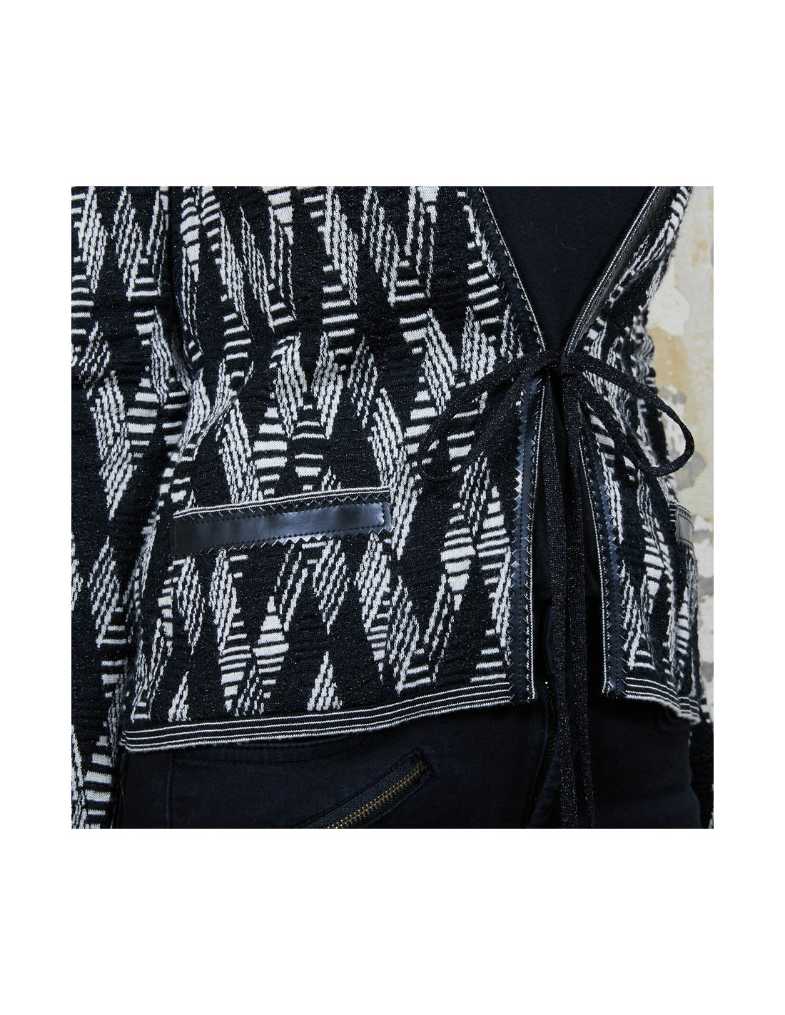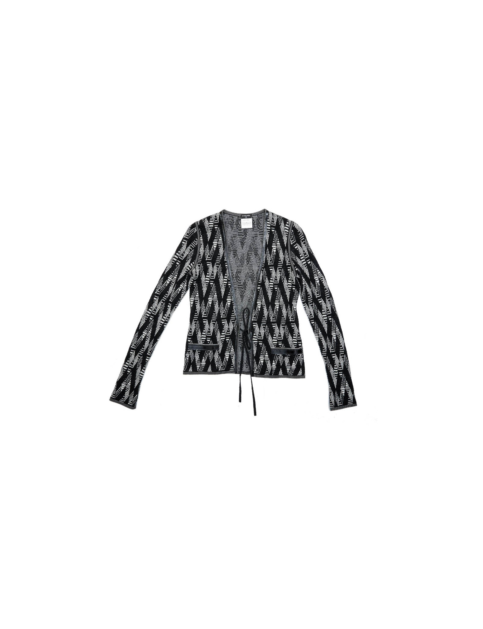 Gilet Chanel à motifs géométriques noir et blanc et fils d'argent et gansé de matière plastifiée, qui se resserre à la taille à l'aide de deux petits rubans noirs pailletés.