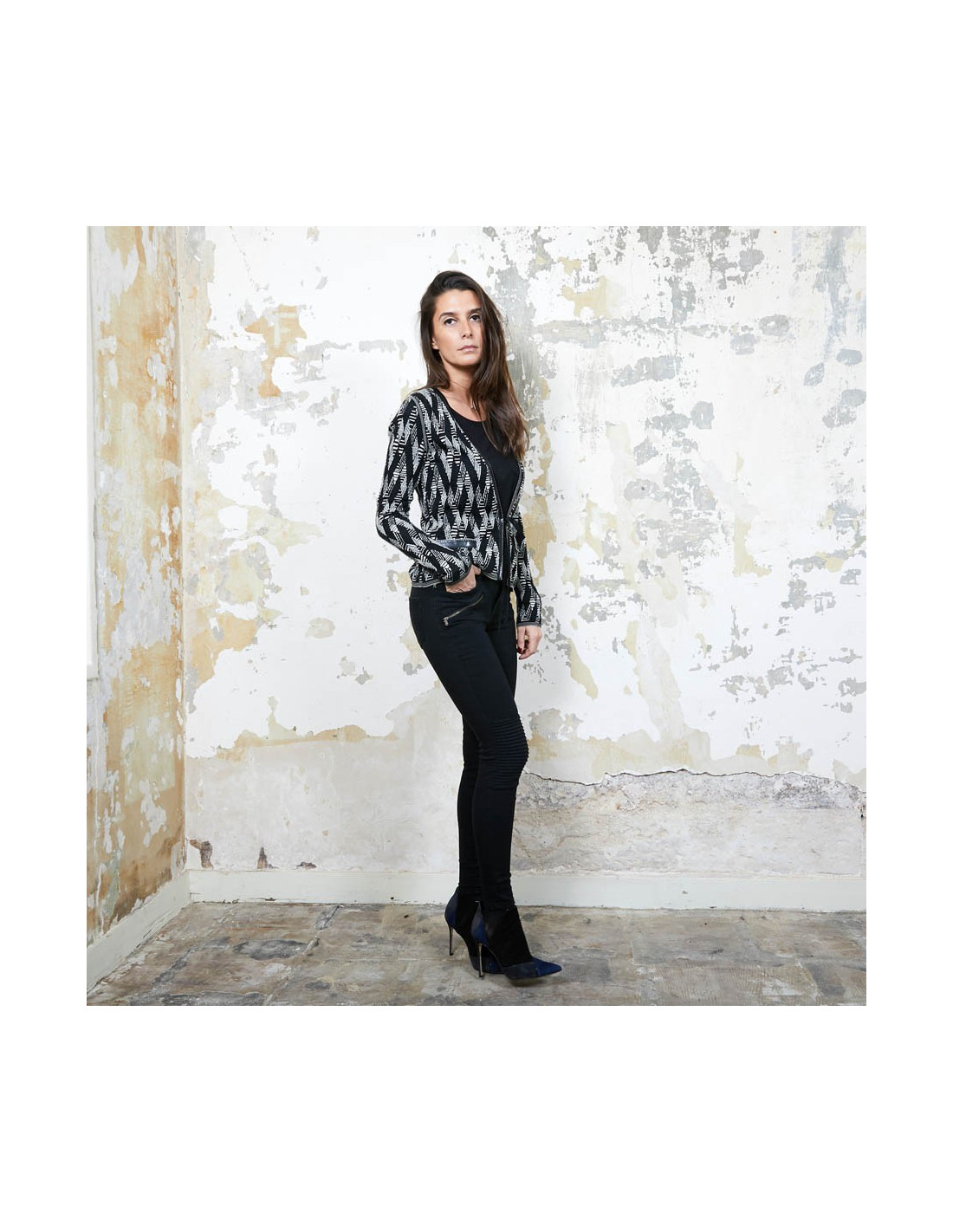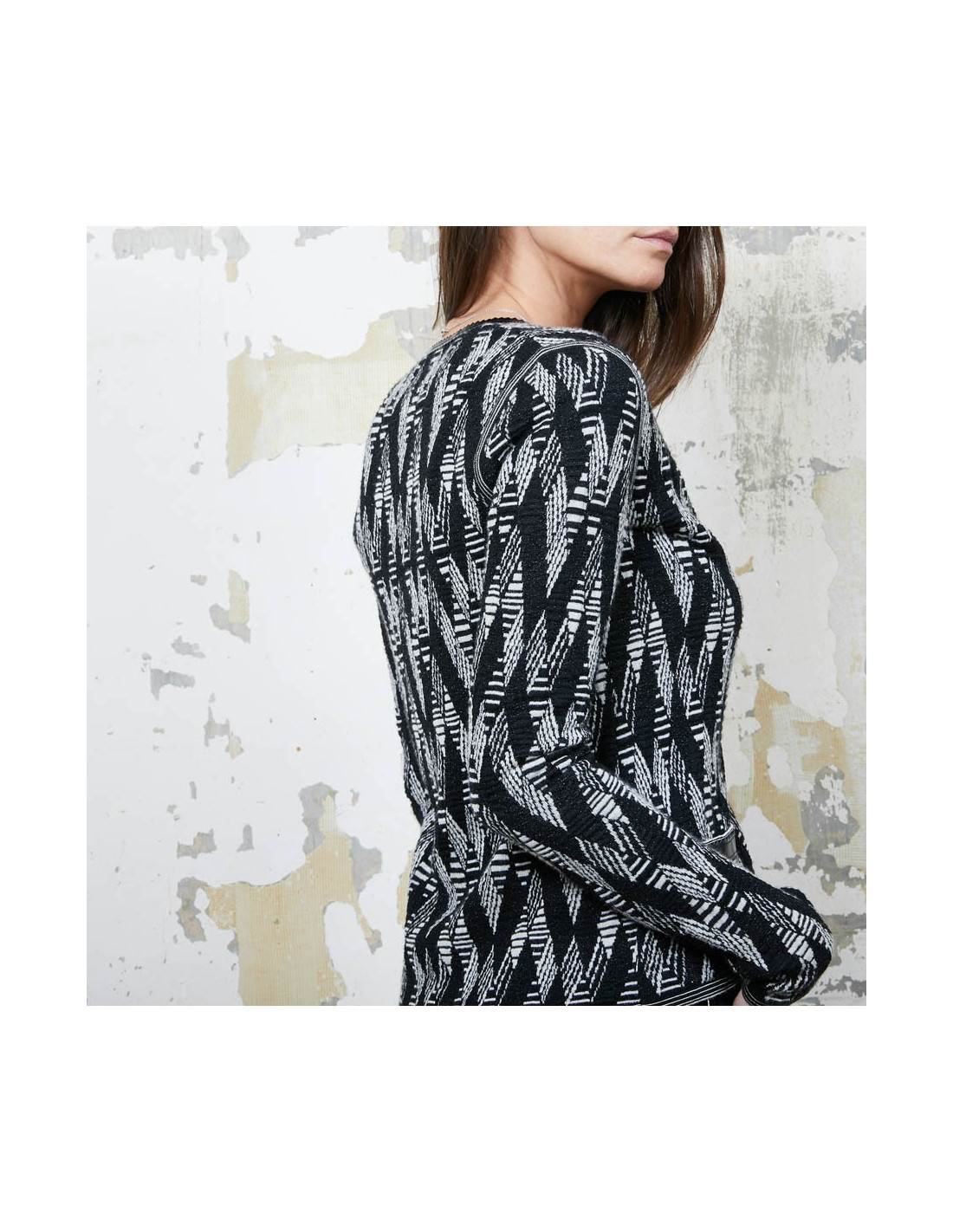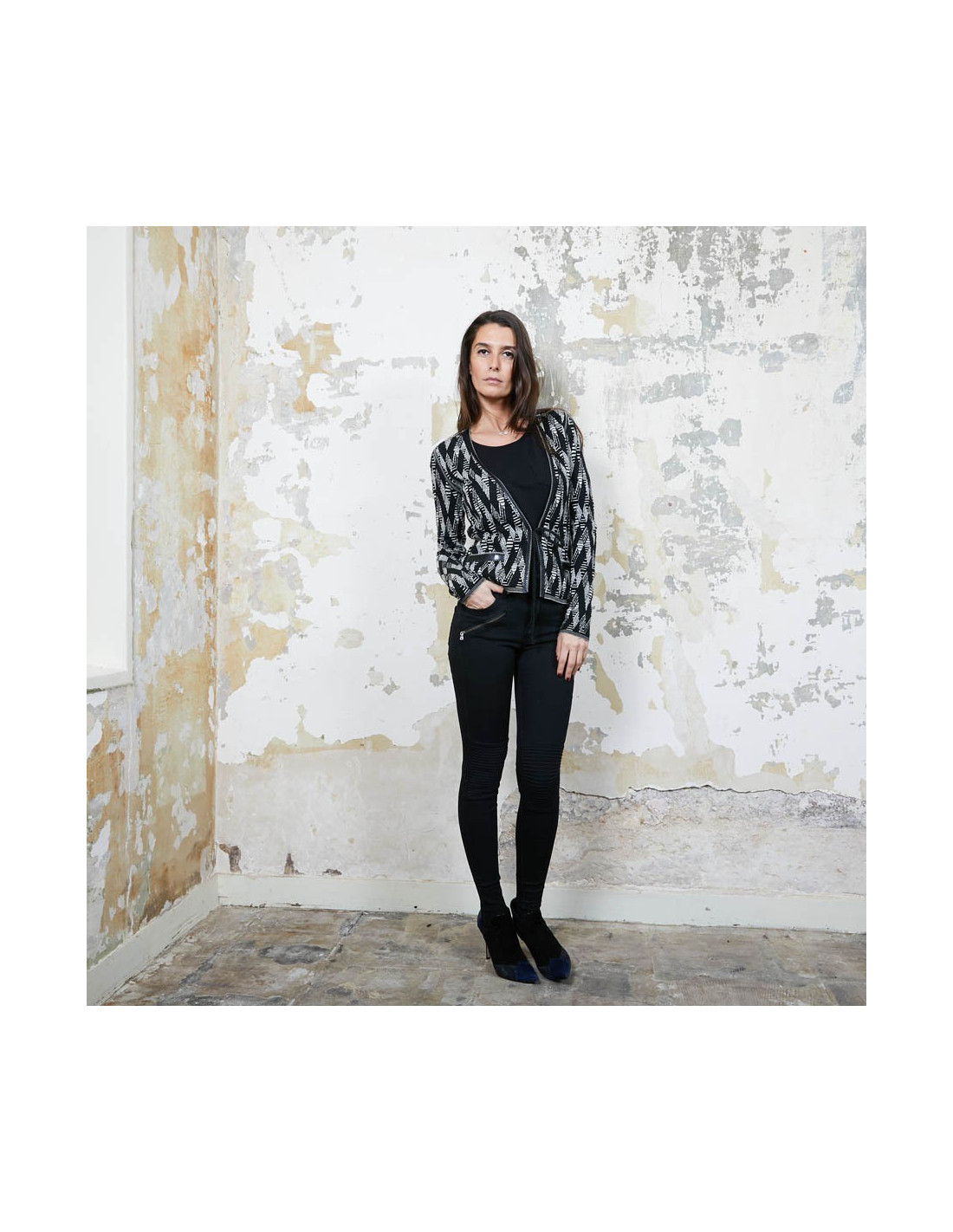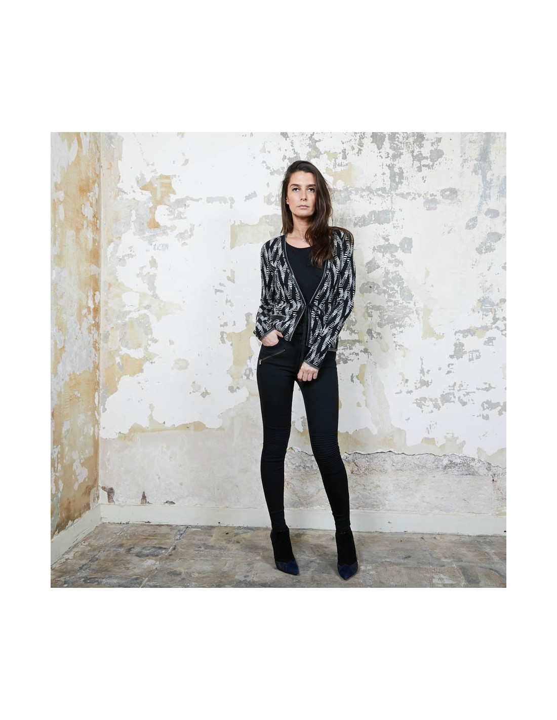 Gilet Chanel à motifs géométriques noir et blanc et fils d'argent et gansé de matière plastifiée, qui se resserre à la taille à l'aide de deux petits rubans noirs pailletés.