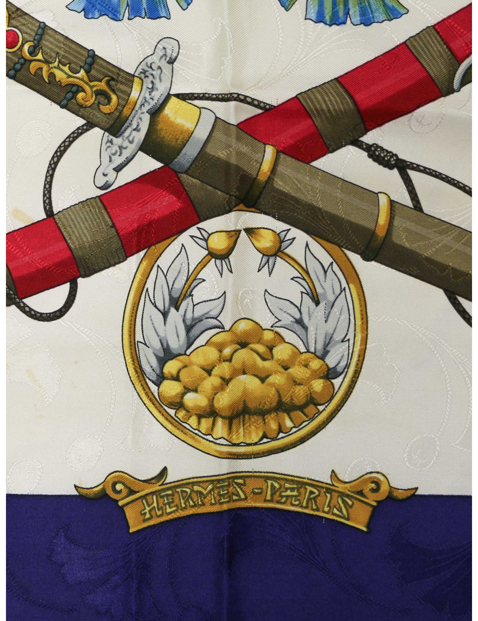 Détails : Ce carré rend hommage à la culture asiatique, et plus particulièrement à l'esthétique du Japon. Bon état car de petites traces en particulier sur la partie basse écrue, c'est peu visible lorsque le foulard est porté.
