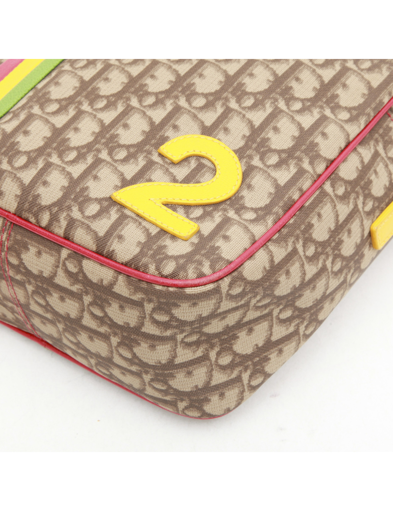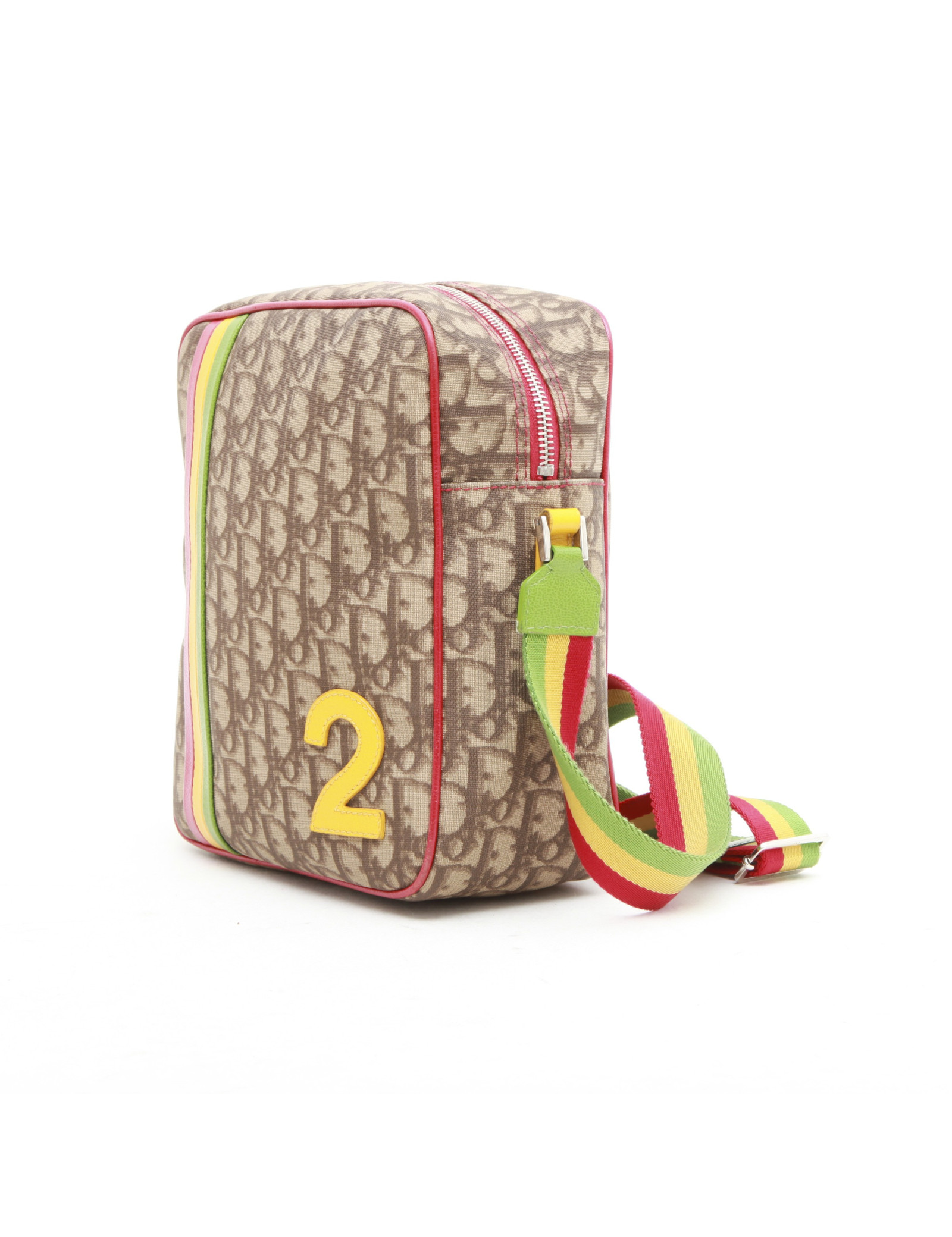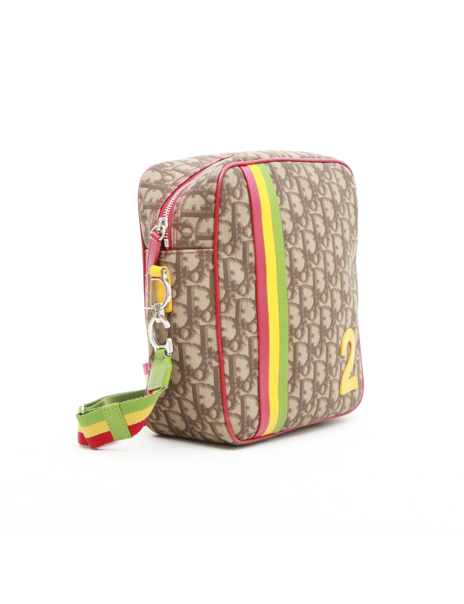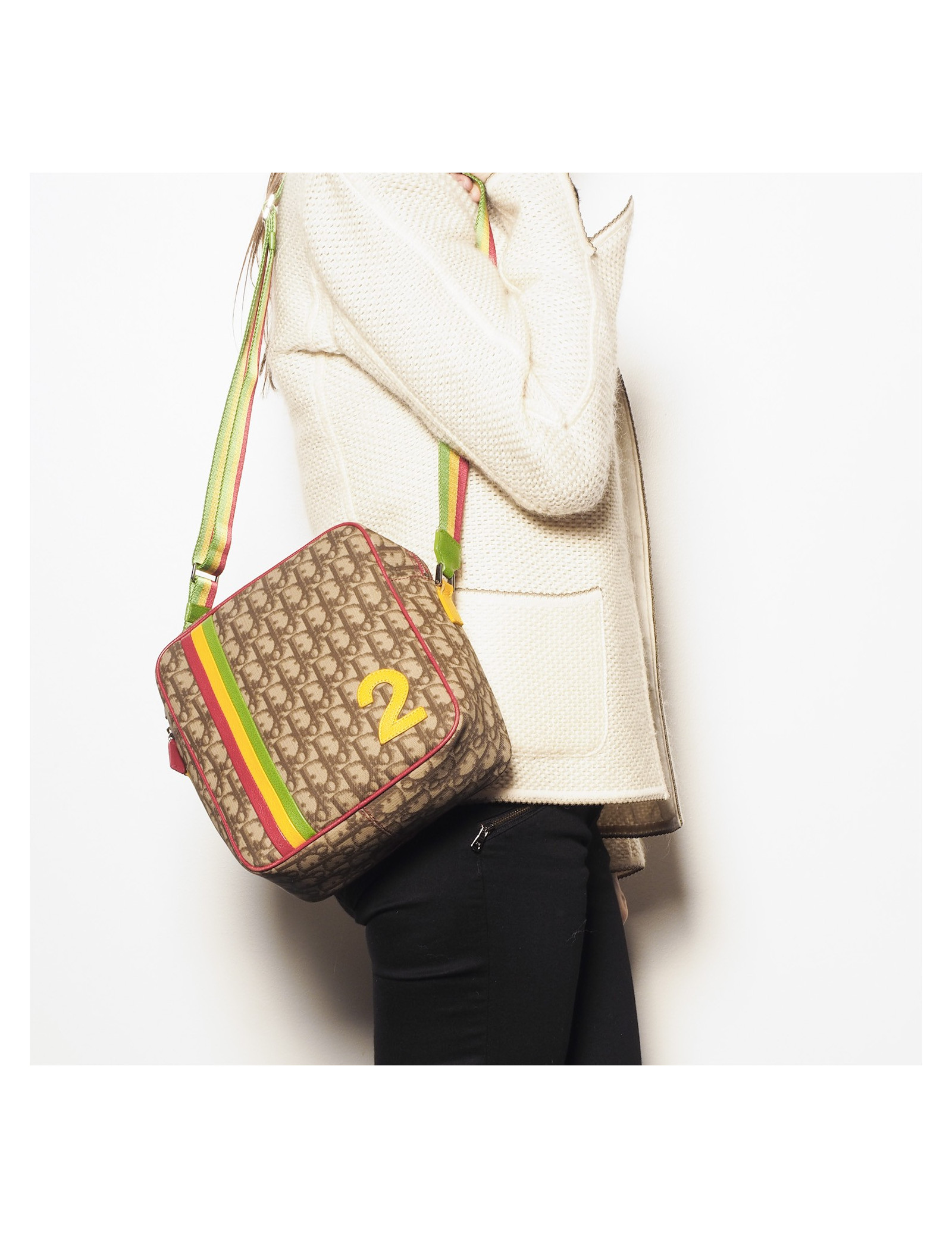 Sacoche Vintage en toile enduite et gansé de cuir rouge, ains que la bande tricolore Dior, revient en force dans les Magazines comme Vogue US. Il est porté par les grandes stars. La doublure est en satin rouge avec une poche zippée. Fabrication en Italie. Numéro de série sous la languette à l'intérieur01-MA - ***