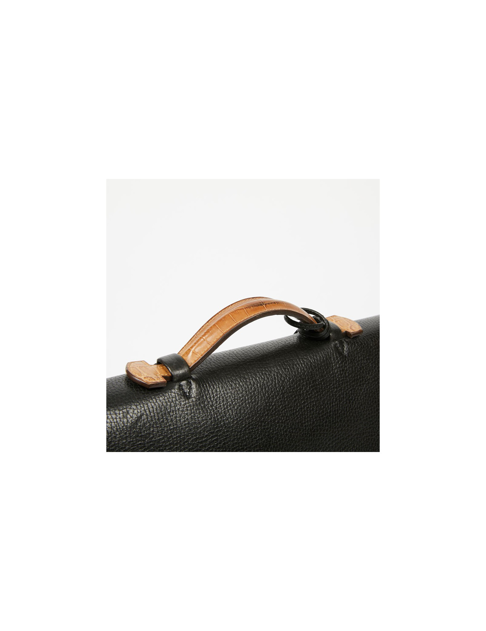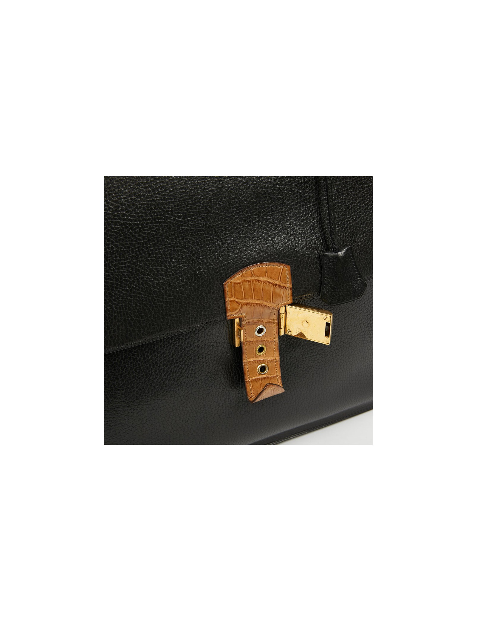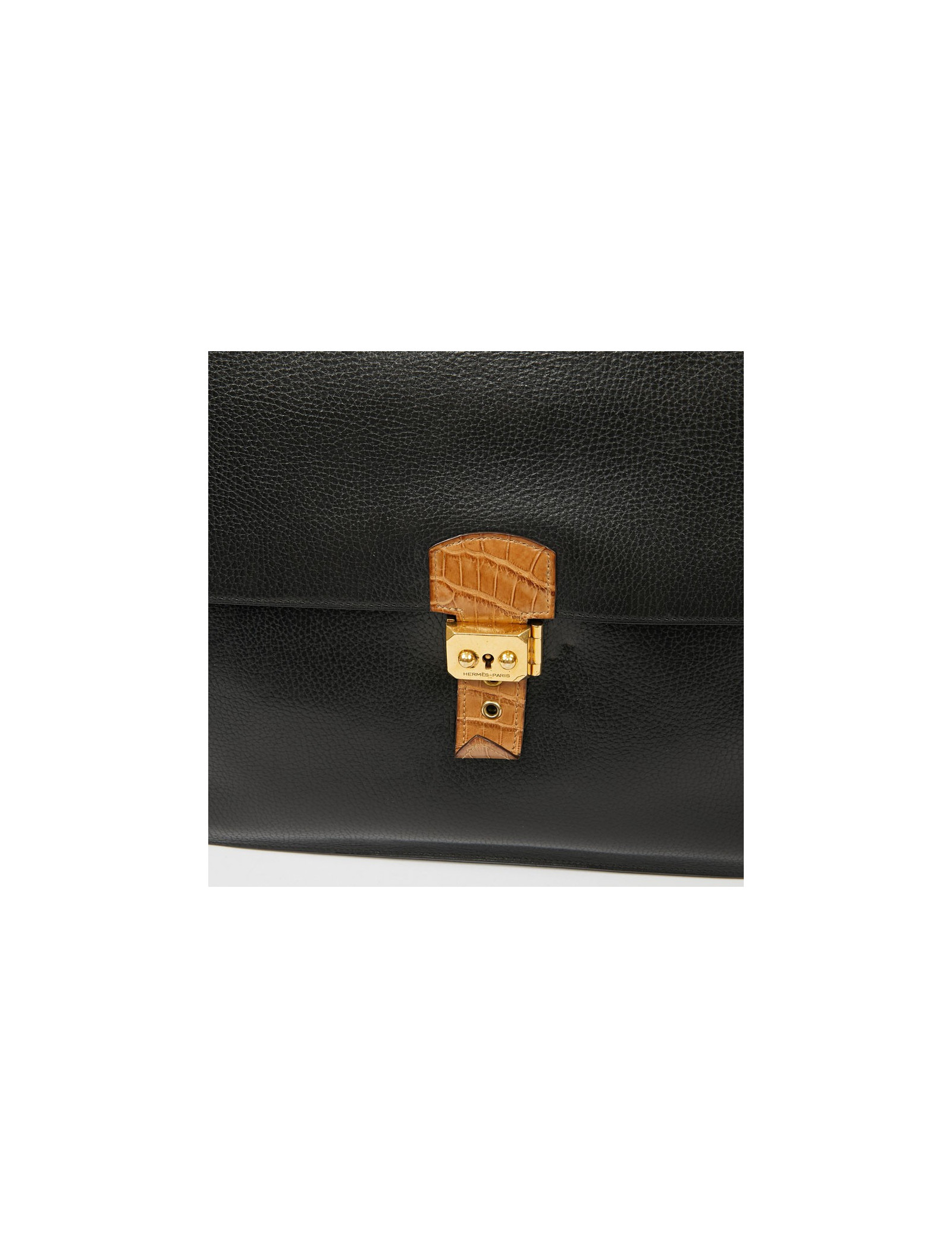 Ce très beau sac à dépêches HERMES est en cuir grainé noir. Il se porte à main avec son unique poignée en crocodile beige. La fermeture par un loquet permet au rabat de s'ouvrir sur un intérieur en cuir et suède. La languette est en crocodile beige identique à la poignée. Il a un compartiment de rangement à deux soufflets, avec une poche plaquée. L'extérieur est en parfait état. A l'intérieur une légère déchirure sur le cuir entre les deux volets. Il est possible de fermer la serrure à clé. Ce porte documents possède également sa tirette, clochette et clé.