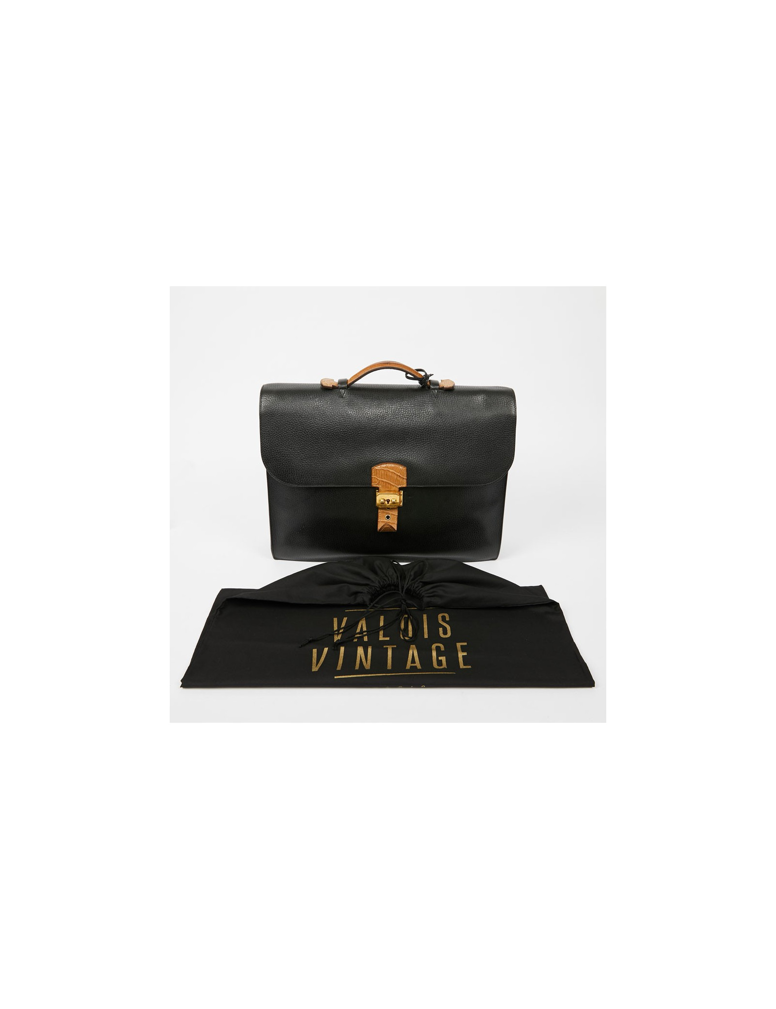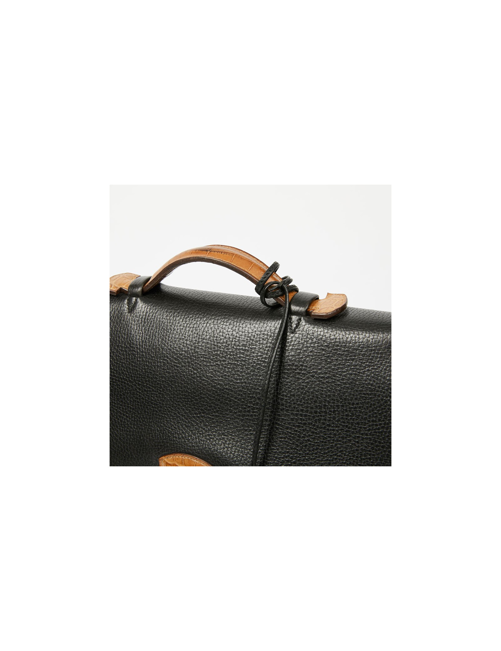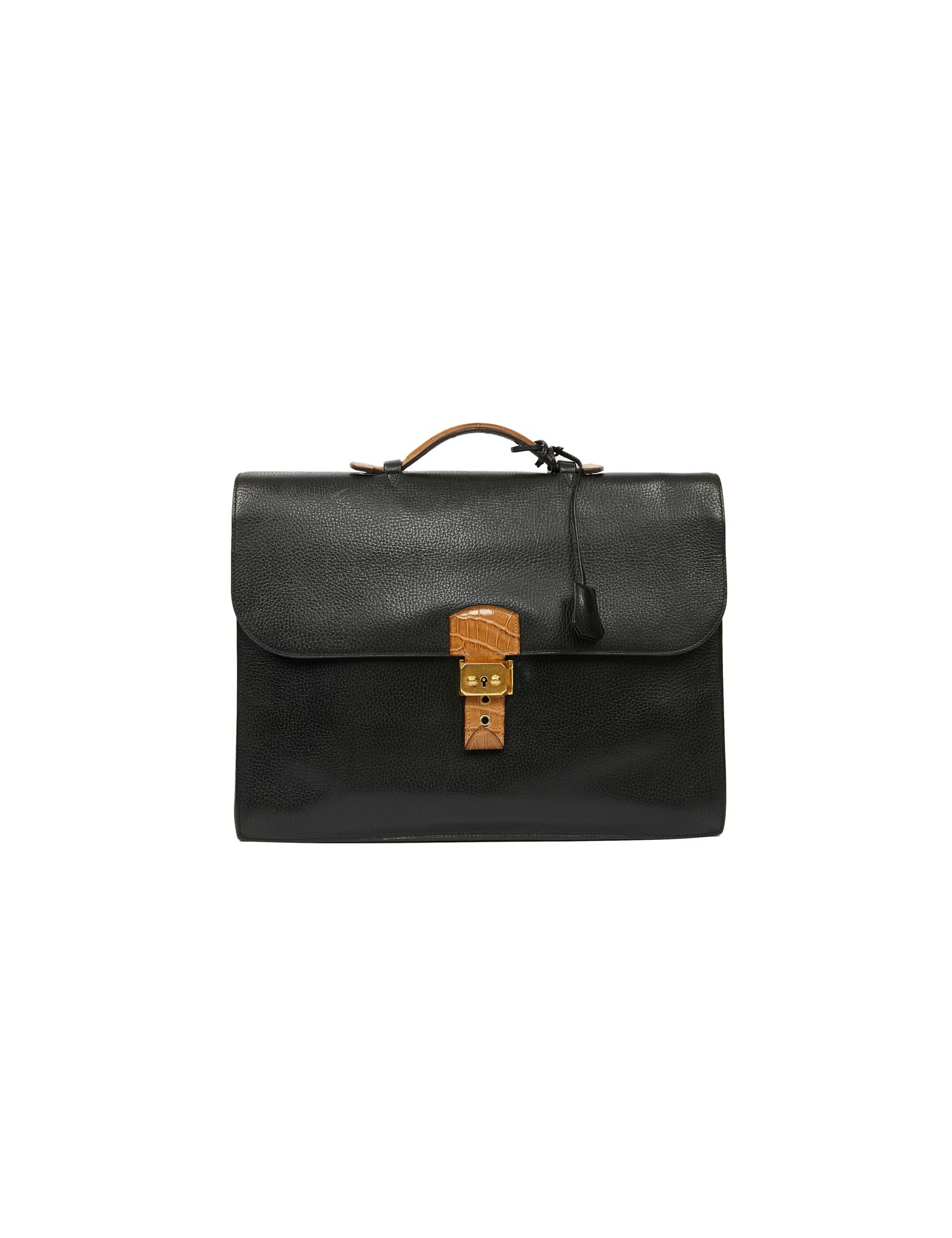 Ce très beau sac à dépêches HERMES est en cuir grainé noir. Il se porte à main avec son unique poignée en crocodile beige. La fermeture par un loquet permet au rabat de s'ouvrir sur un intérieur en cuir et suède. La languette est en crocodile beige identique à la poignée. Il a un compartiment de rangement à deux soufflets, avec une poche plaquée. L'extérieur est en parfait état. A l'intérieur une légère déchirure sur le cuir entre les deux volets. Il est possible de fermer la serrure à clé. Ce porte documents possède également sa tirette, clochette et clé.