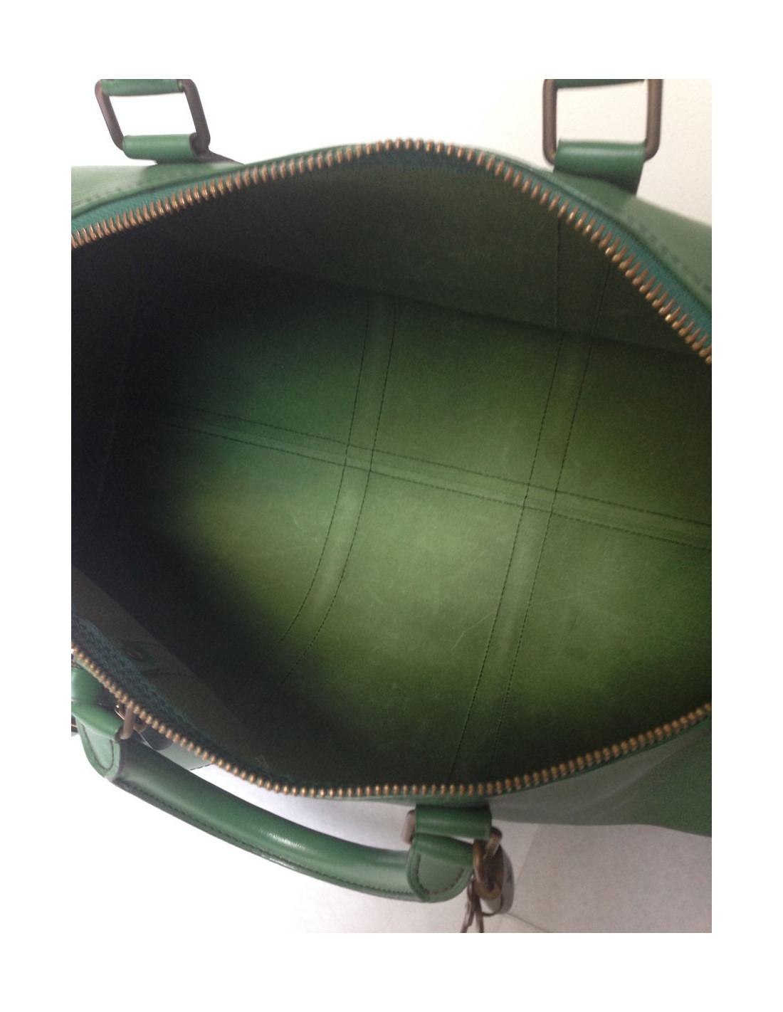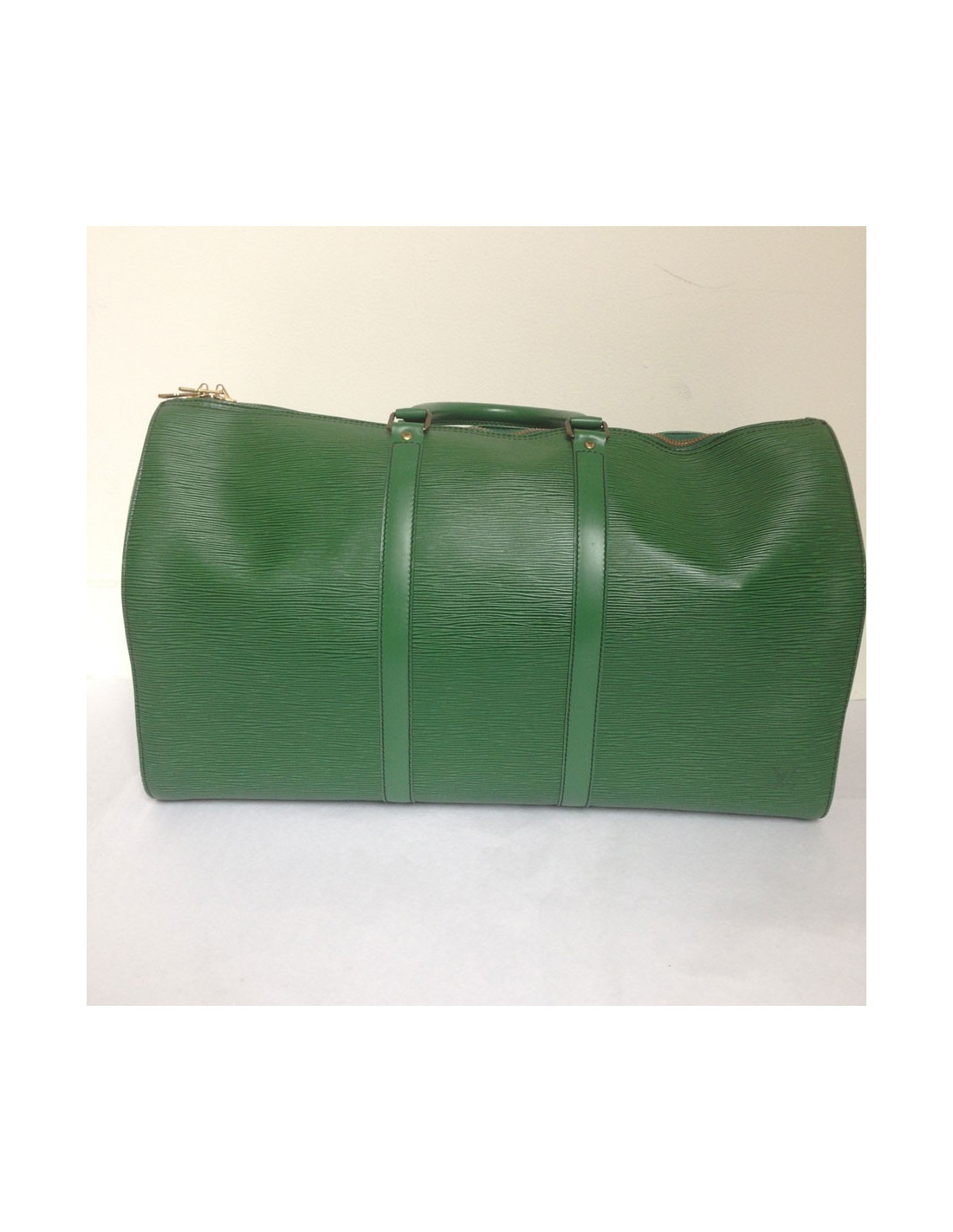 Sac, modèle Keepall Louis Vuitton , moyen modèle en cuir épi vert sapin, bijouterie dorée. Les anses double sont en cuir. La fermeture est zippée sur le dessus, avec une poche plaquée sur le coté
