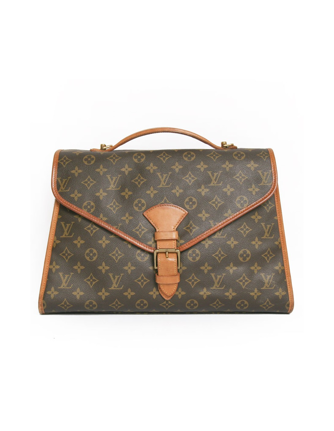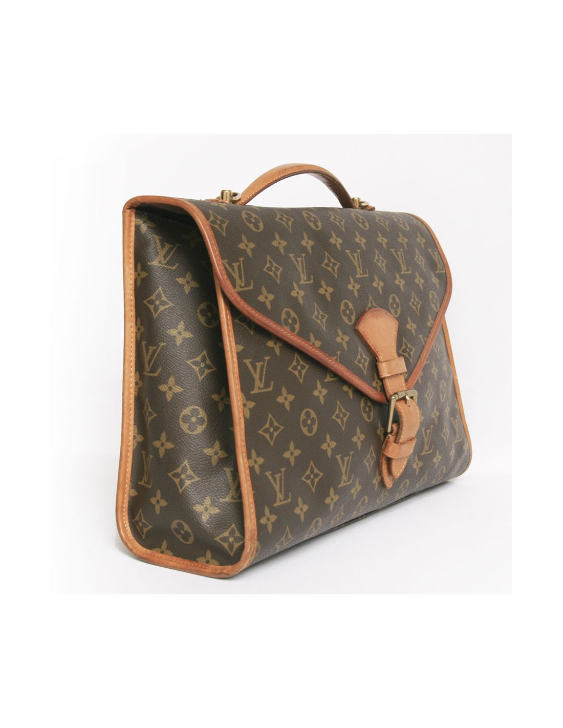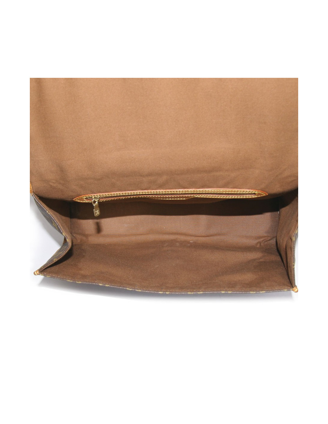 Porte-documets "Beverly", Louis Vuitton en toile monogram et cuir naturel, fermeture par boucle ardillon en cuir naturel sur rabat. Elle est pratique pour y ranger un ipad, petit mac , dossiers, etc.. Elle se porte à la main à l'aide d'une anse qui mesure 20cm. L'intérieur est en toile marron avec un grand espace de rangement et une grande poche zippée. La bijouterie est en métal doré. Très bon état. signature : Louis Vuitton made in France.