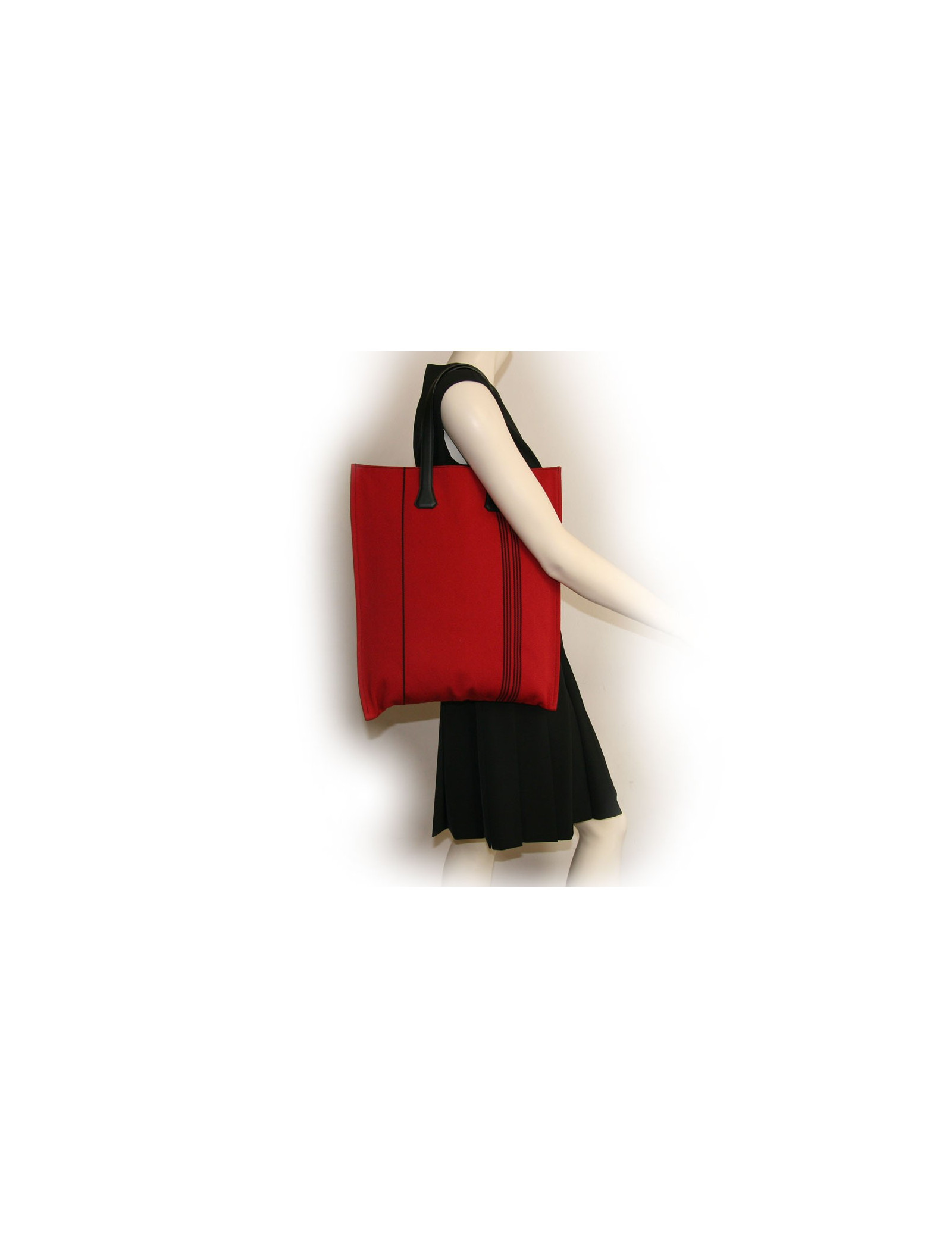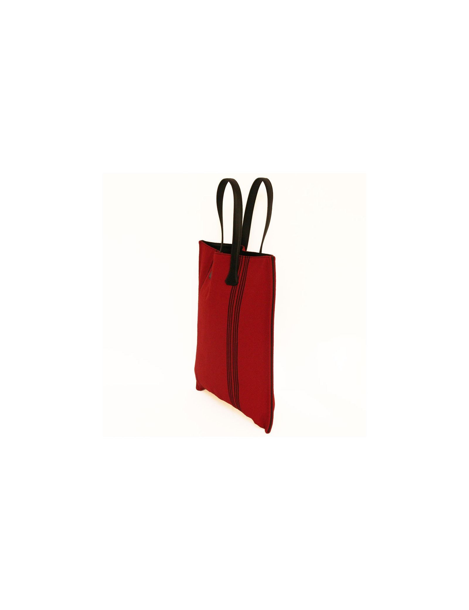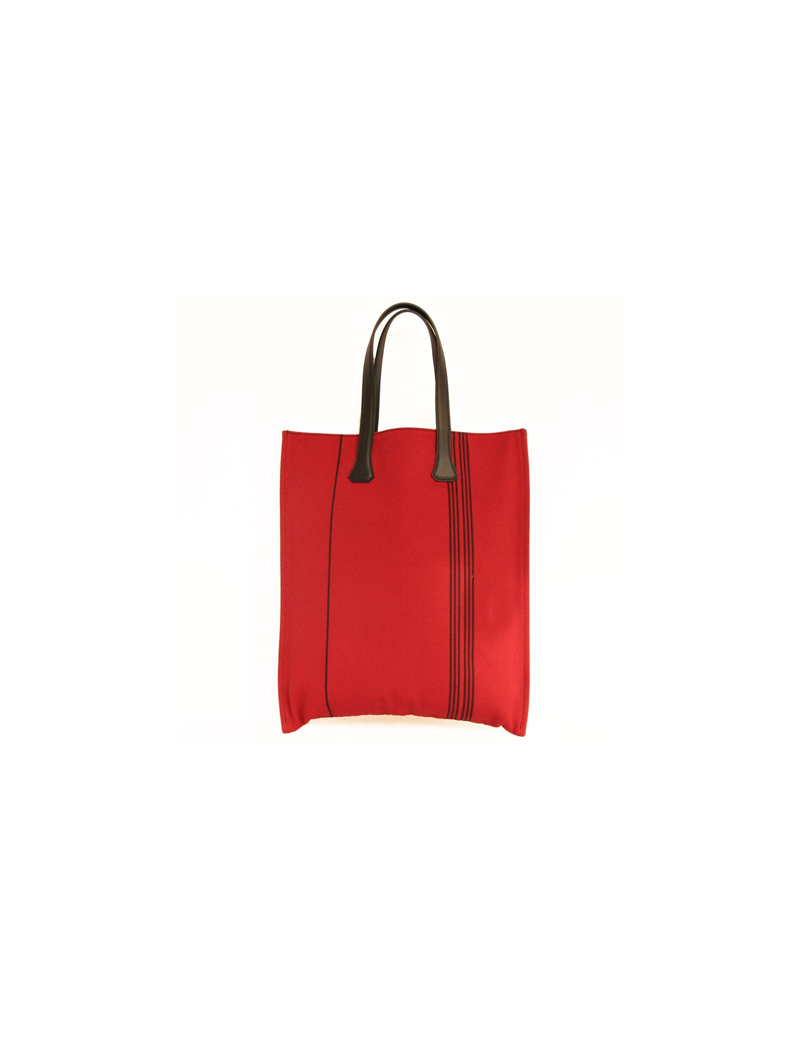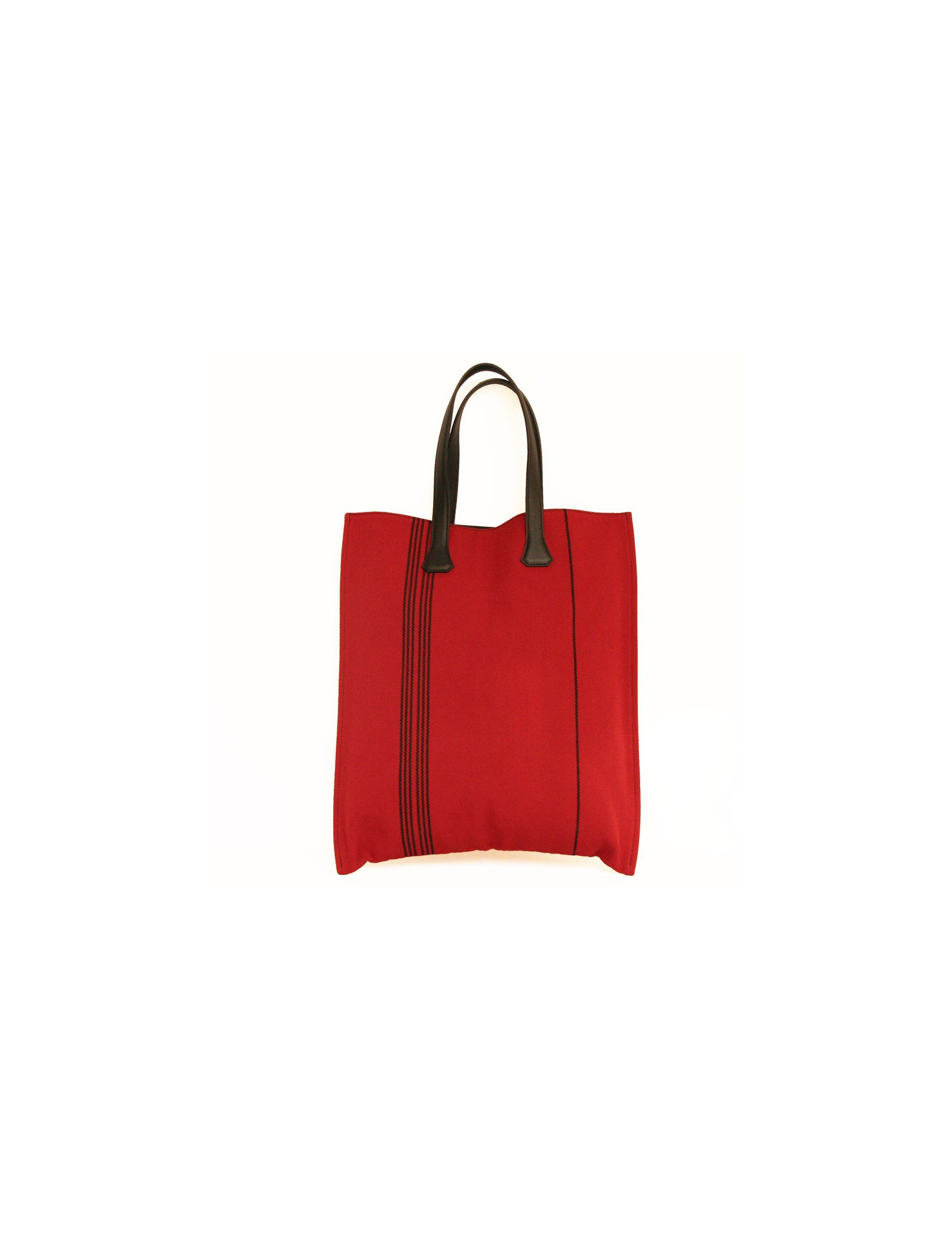 Sac cabas, Hermès en toile rouge et rayée noire. En très bon état (jamais porté) - il se porte soit au bras soit à l'épaule. Les anses sont en cuir noir ainsi que le renfort.