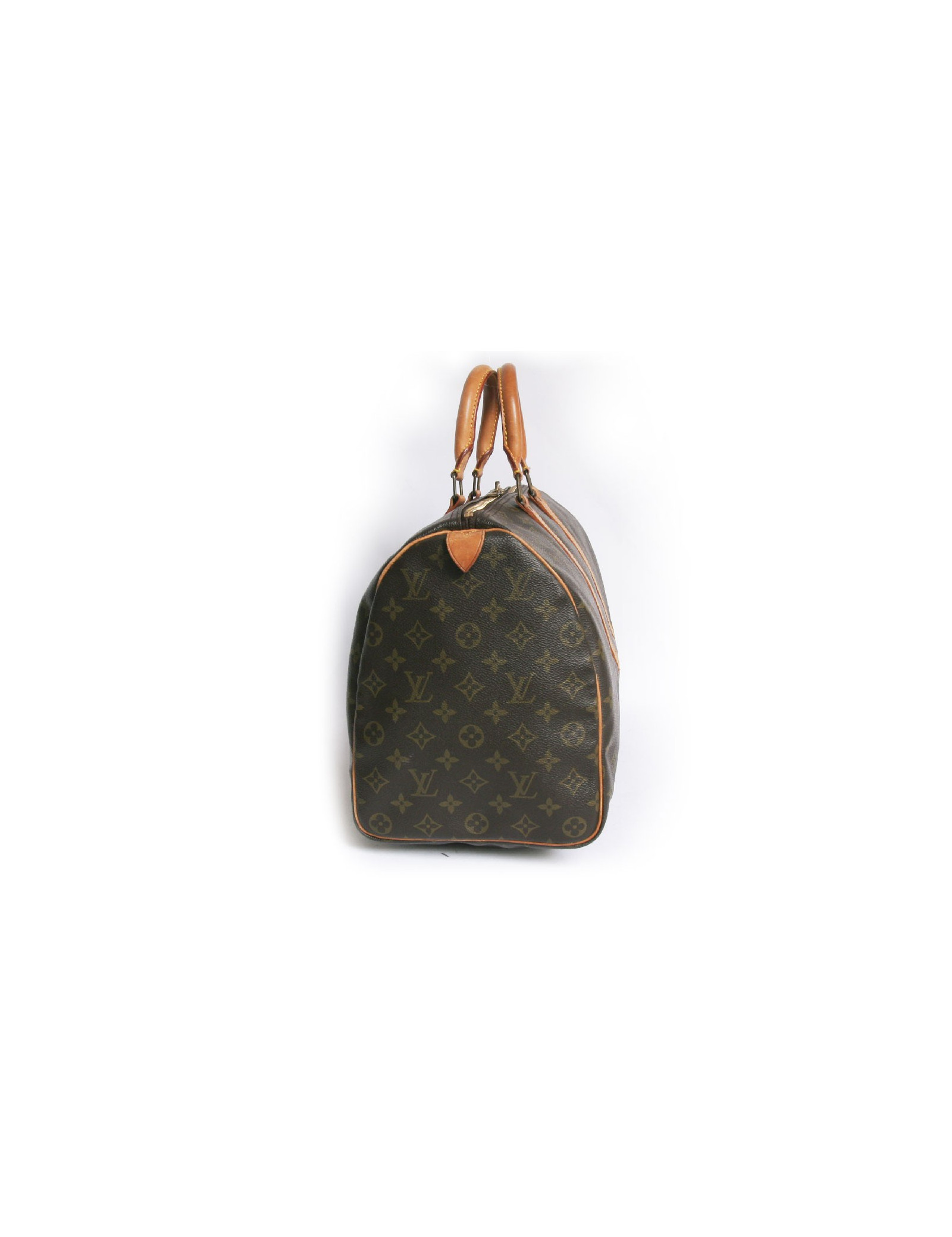 L'indémodable sac Keepall 45 de la Maison Louis Vuitton en toile monogram. L'accastillage est en laiton doré. Fermeture zippée. Il a été consu pour les week-end. Il se porte à la main à l'aide d'une double poignée. L'intérieur est en toile marron. En très bon état. Le cuir d'agneau est patiné ainsi que quelques marques d'usures sous le sac.