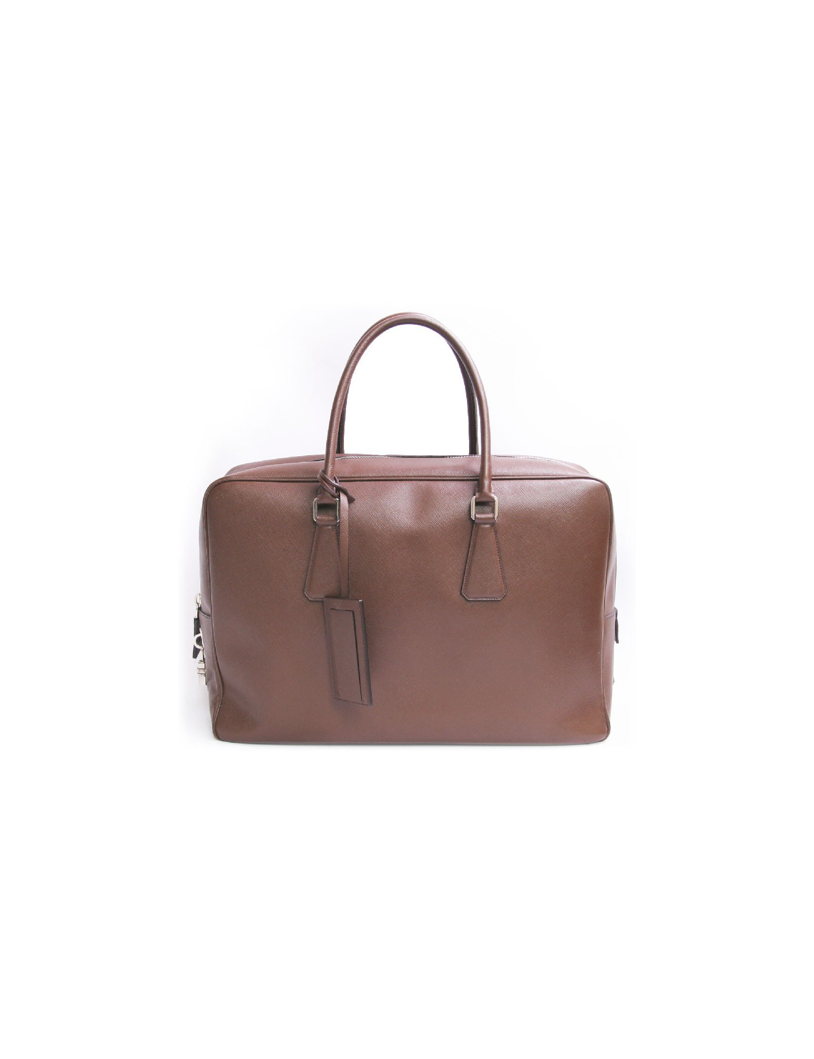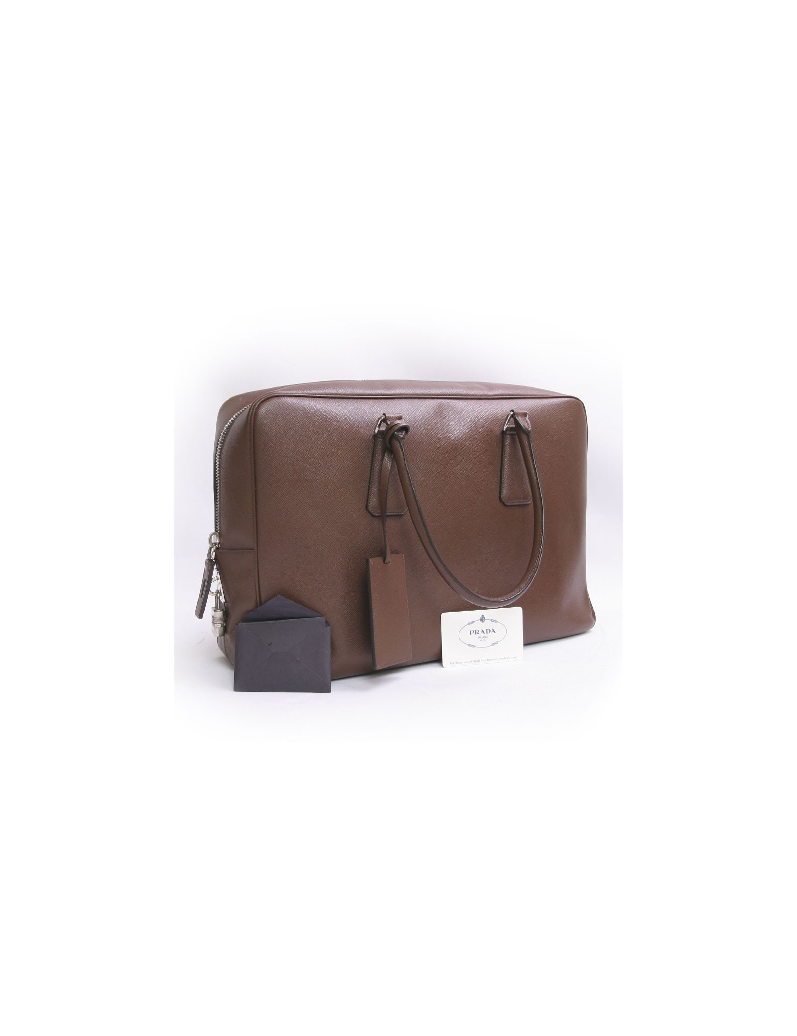 Sac Prada en cuir saffiano couleur cacao. Double poignée. Fermeture zippée. L'accastillage est en métal argenté. L'intérieur est en toile monogram avec deux grandes poches zippées, 3 emplacements pour stylos, 1 poche pour smartphone et 1 petite poche plaquée. Il a d'un porte adresse.En très bon état.