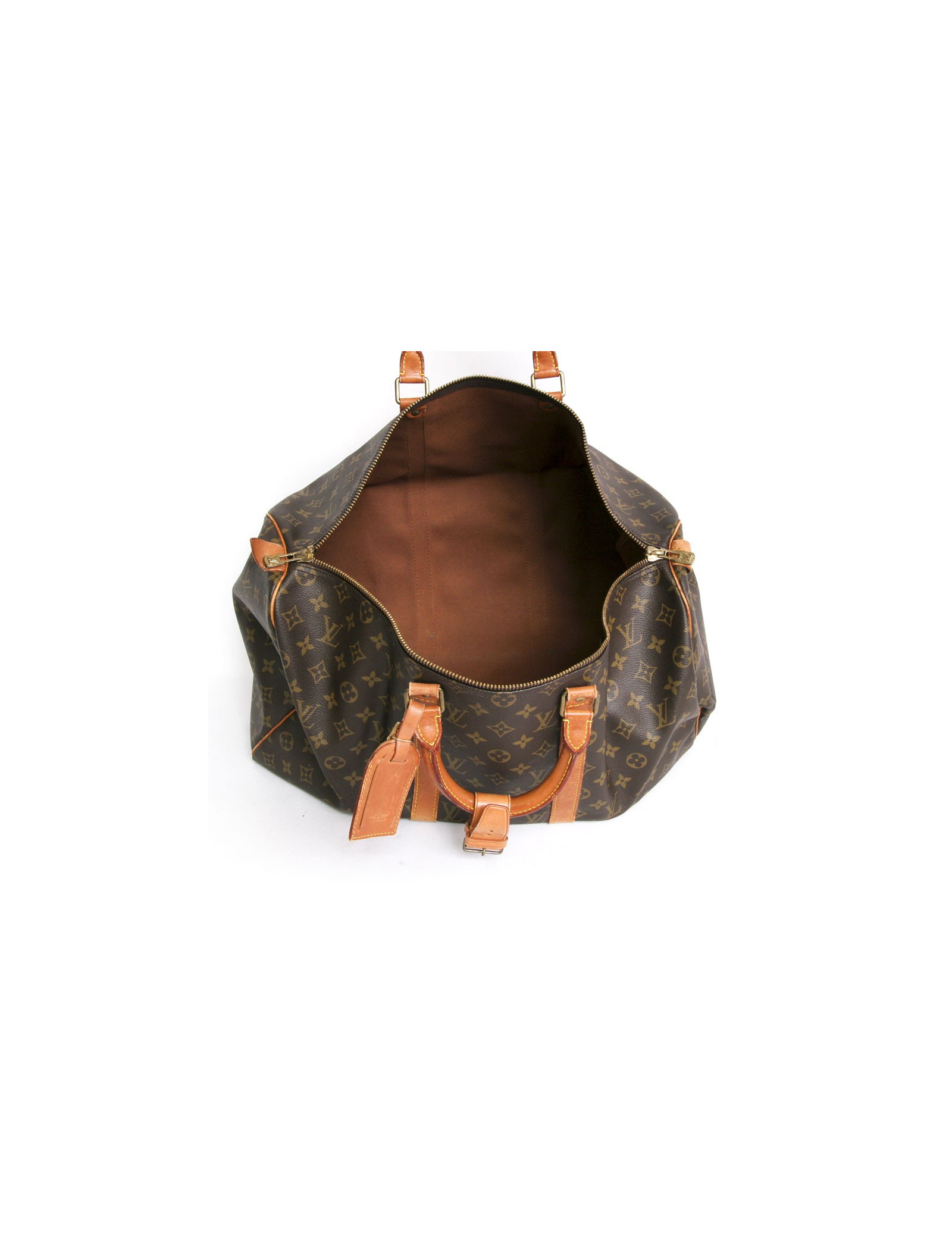 Sac "keepall 50" de la Maison Louis Vuitton en toile monogram. Une icône depuis sa création en 1930. Léger, souple et toujours prêt pour un départ imminent mais surtout pratique de par sa taille cabine. Les pièces métalliques sont en laiton doré. Fermeture zippée. Porté main à l'aide de deux poignées. Porte nom. La doublure est en toile marron. Les parements sont en cuir de vache naturel. En très bon état. Très légère patine du cuir. Quelques petites marques d'usure sous le sac. Voir photos.